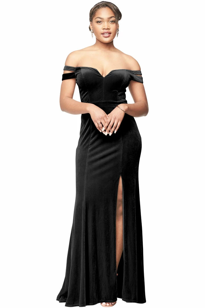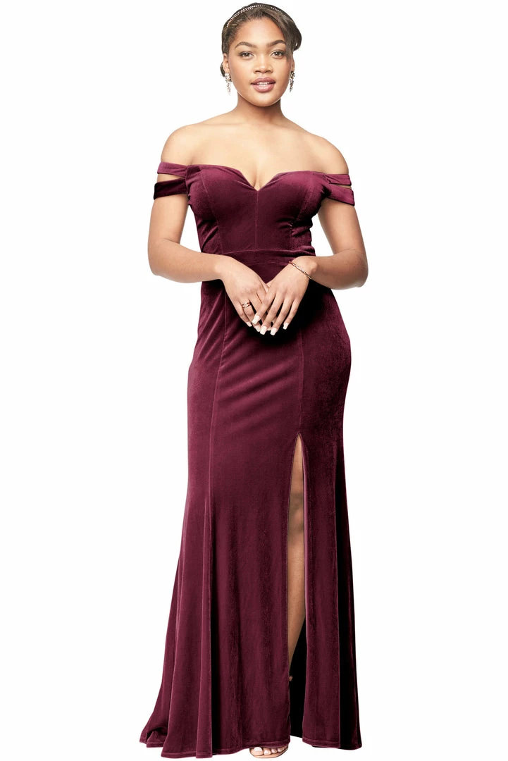 Stretch Velvet gown with double off the shoulder straps and princess seams. Cut away neckline. Off-center front slit and a slight back train.This style is made-to-order and is final sale.