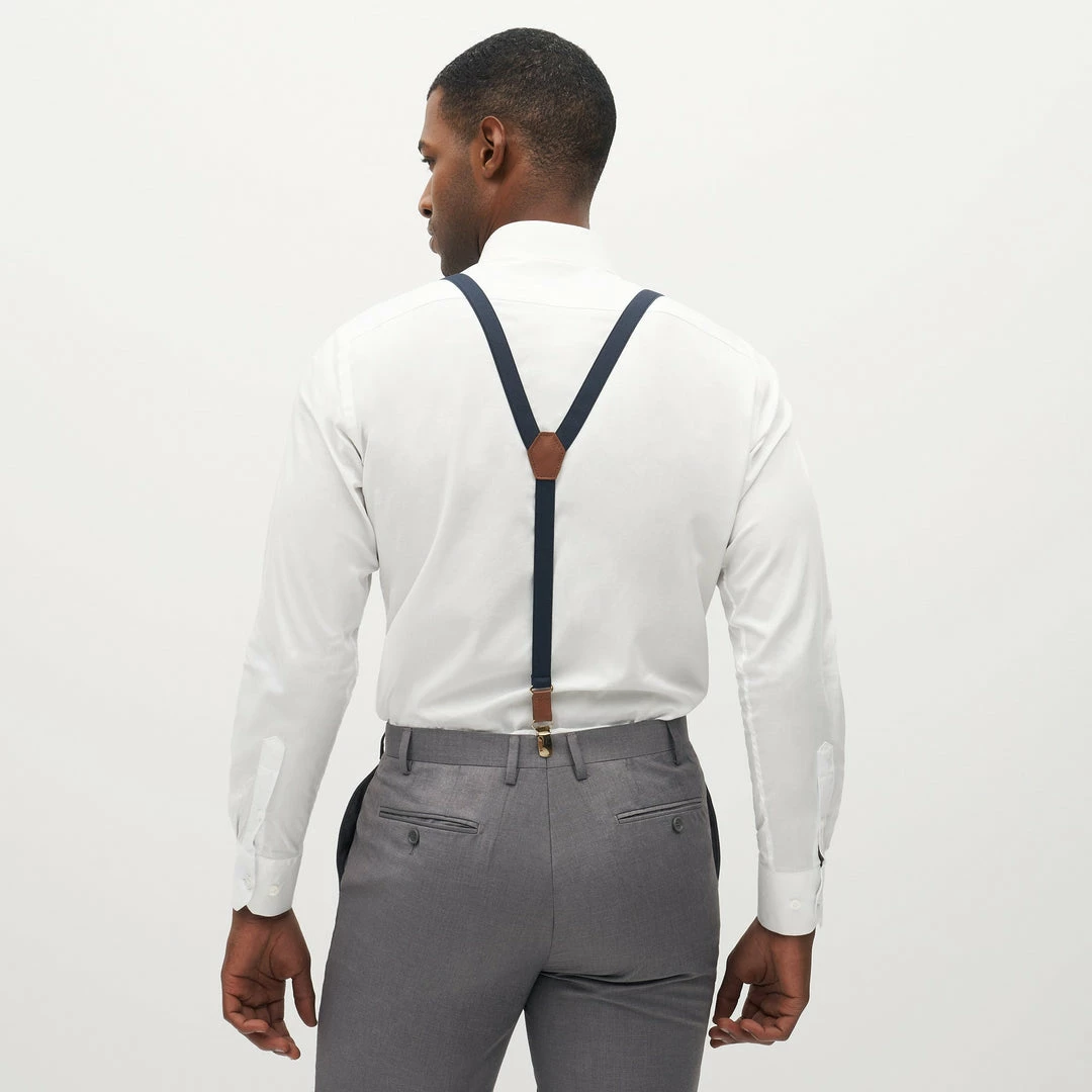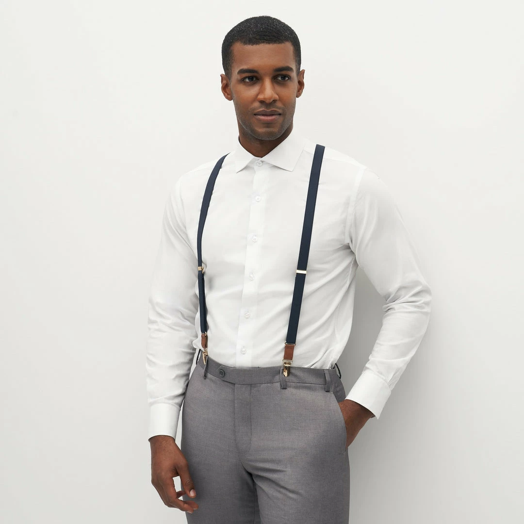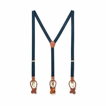 These skinny navy suspenders are perfect for a put-together look. With their versatile hue and luxe detailing, they are the epitome of old-school elegance.