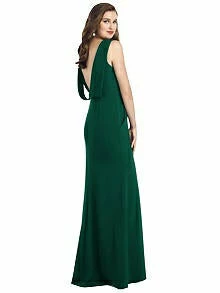 Full length sleeveless crepe dress with draped low back. Slash pockets and modified trumpet skirt.