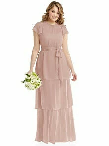 Flutter sleeve lux chiffon dress with delicate shirring at jewel neckline and romantic tiered skirt. Self tie sash at elasticized waist. Adjustable straps on slip underlay bodice.