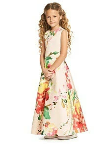 Sleeveless satin twill flower girl dress with jewel neckline and circle skirt. Wide sash at waist with flat bow detail at back. Dress available in full print.