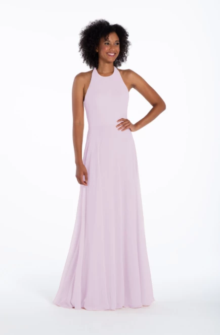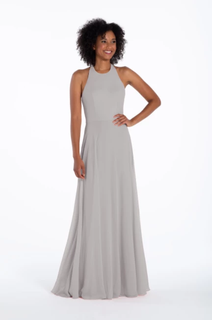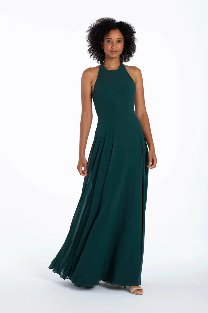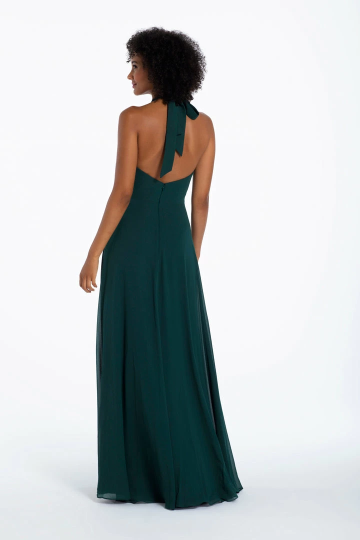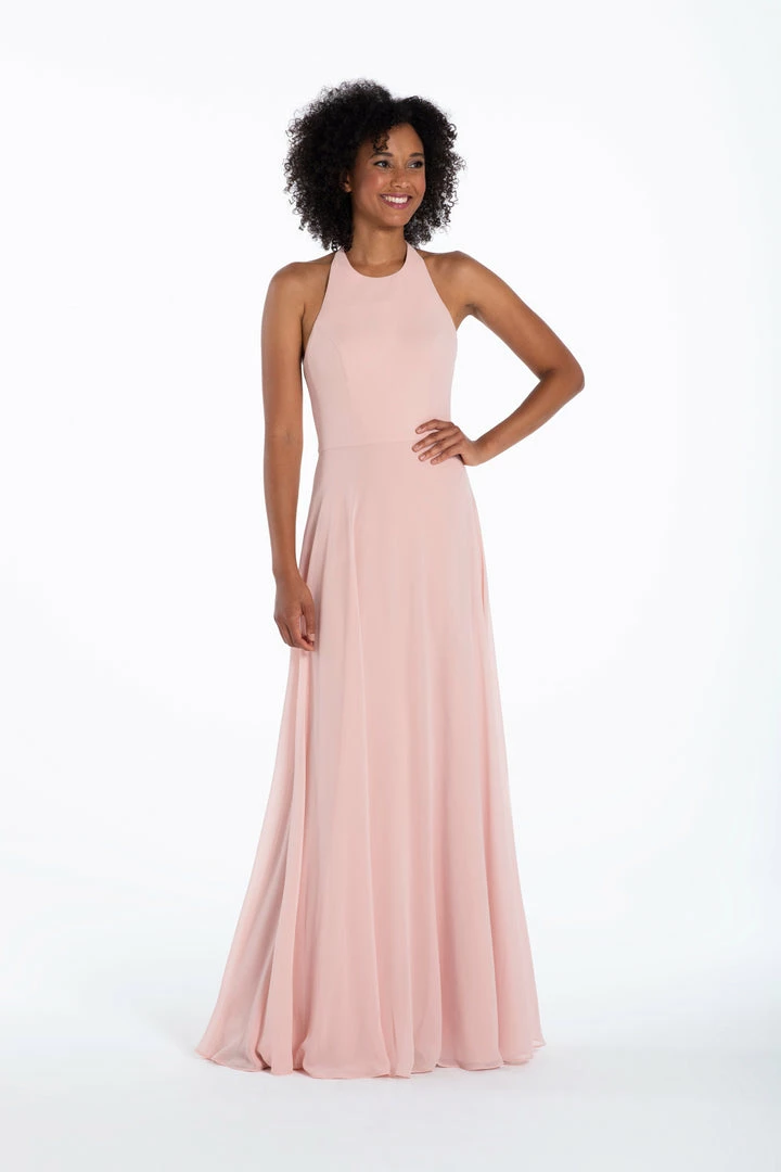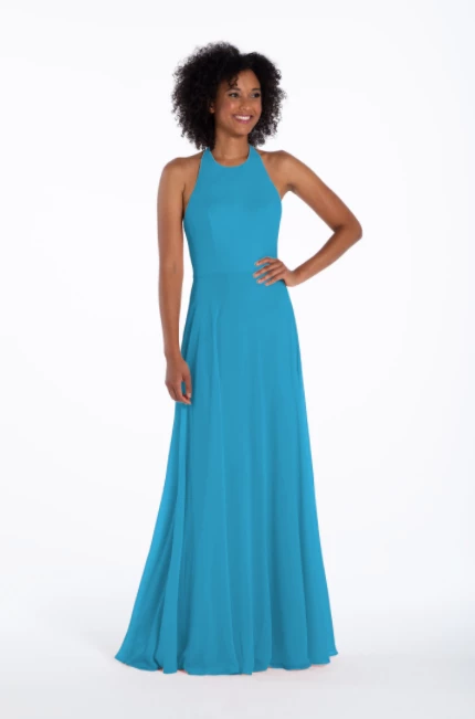 Chiffon A-line gown, halter neckline with tie detail, natural waist.
