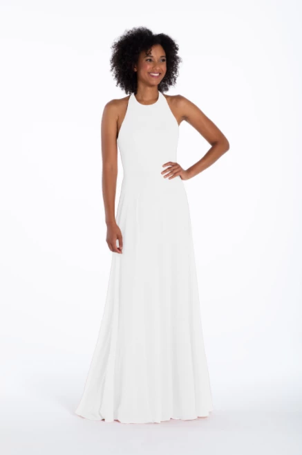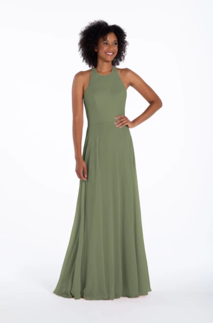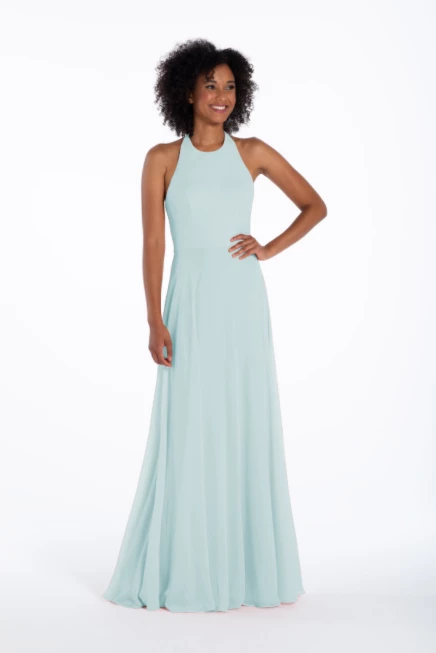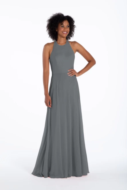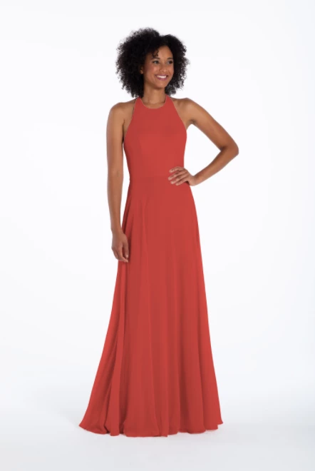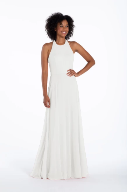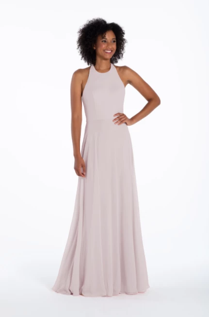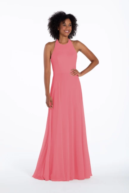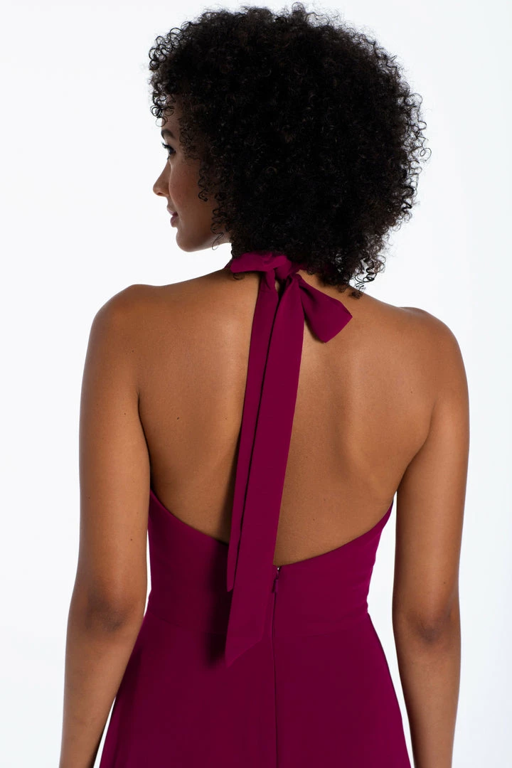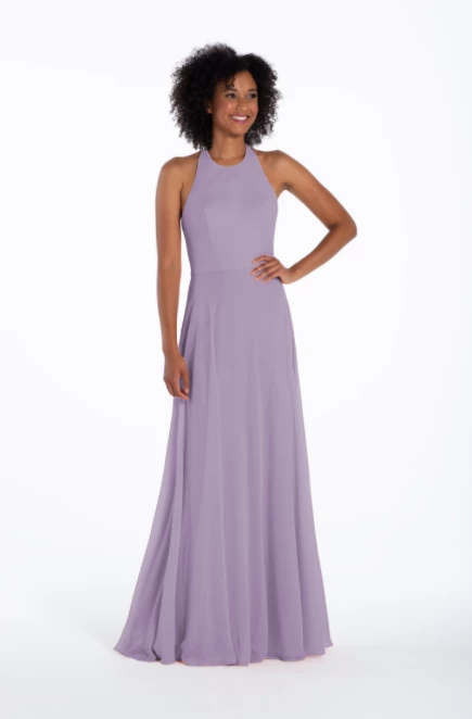 Chiffon A-line gown, halter neckline with tie detail, natural waist.