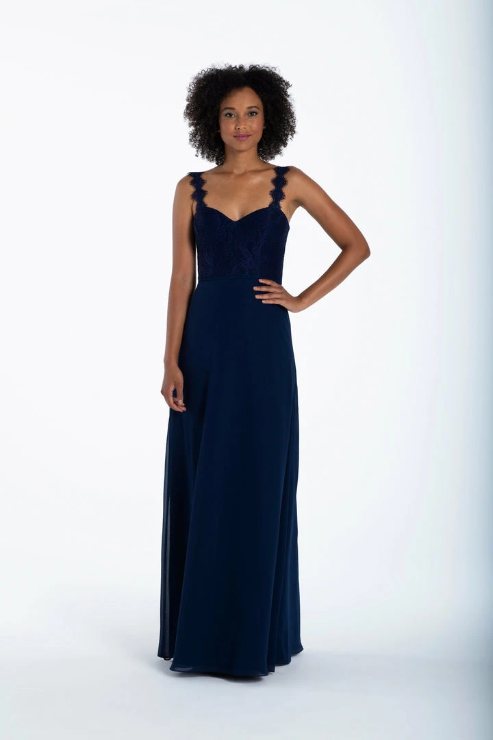 Chiffon A-line gown, Navy lace bodice with lace trim strap detail, natural waist.