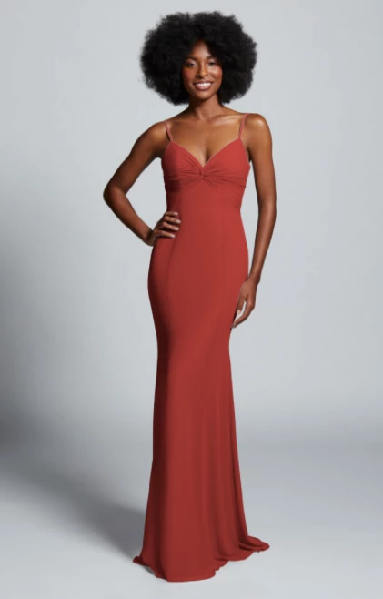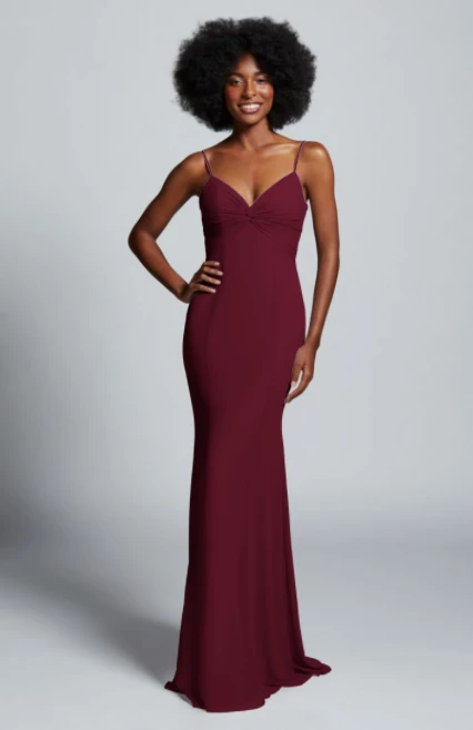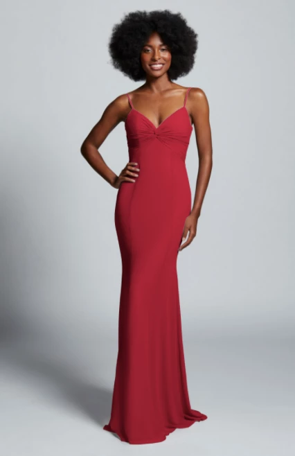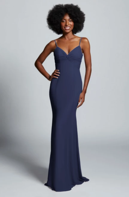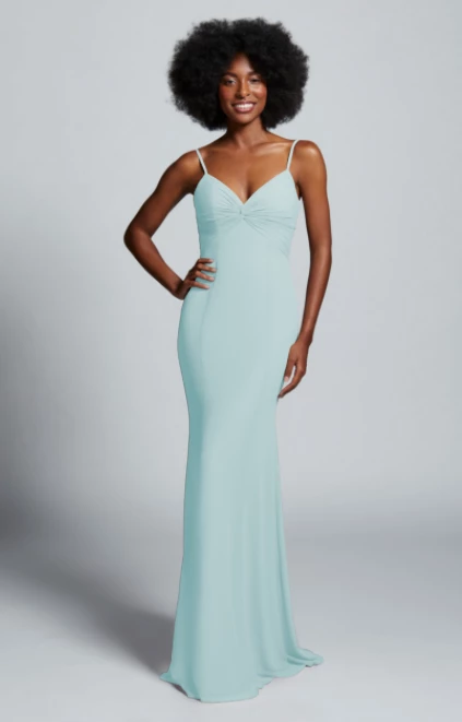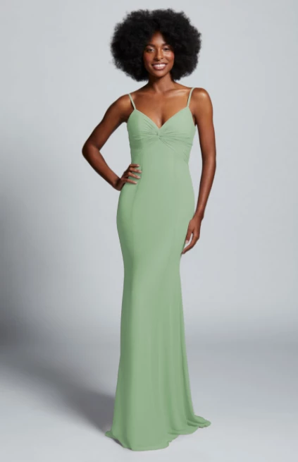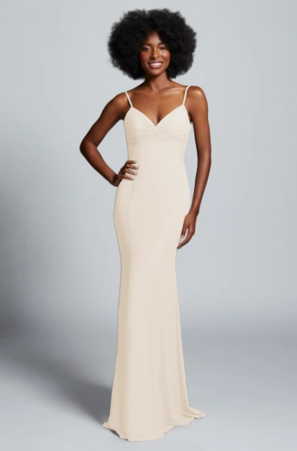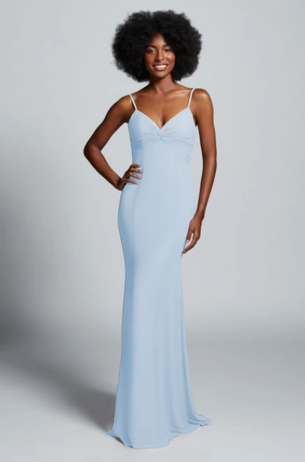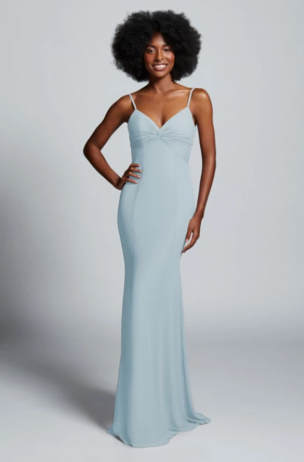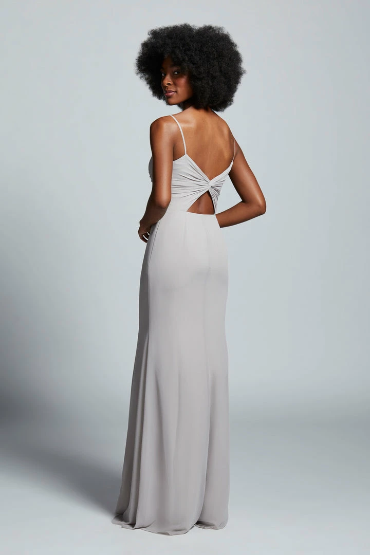 Chiffon A-line gown, V-neckline, gathered empire bodice, keyhole back detail.