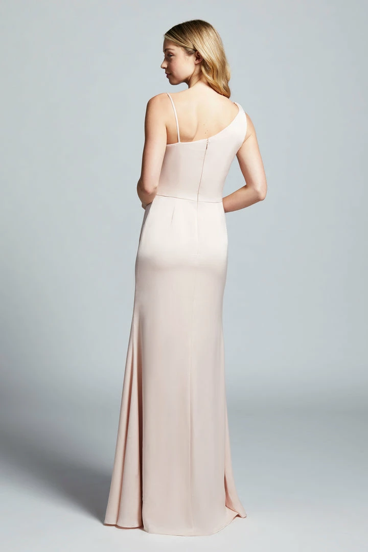 Crepe de chine, A-line gown, draped one shoulder neckline, natural waist.