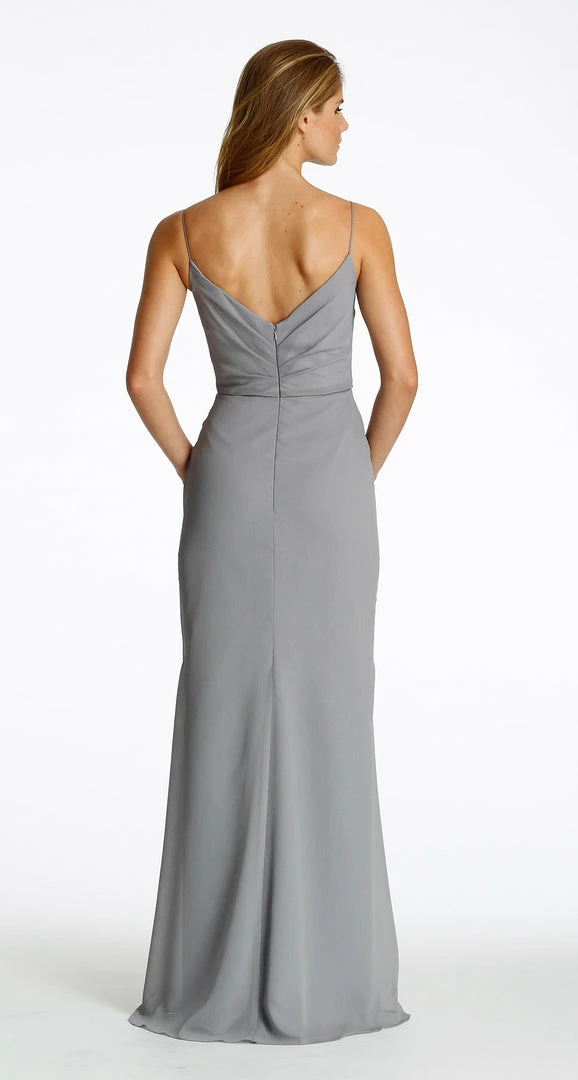 Hayley Paige Occasions bridesmaids dress – Platinum chiffon A-line bridesmaid gown, criss-cross draped bodice, natural waist with side drape.
