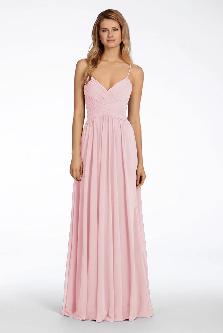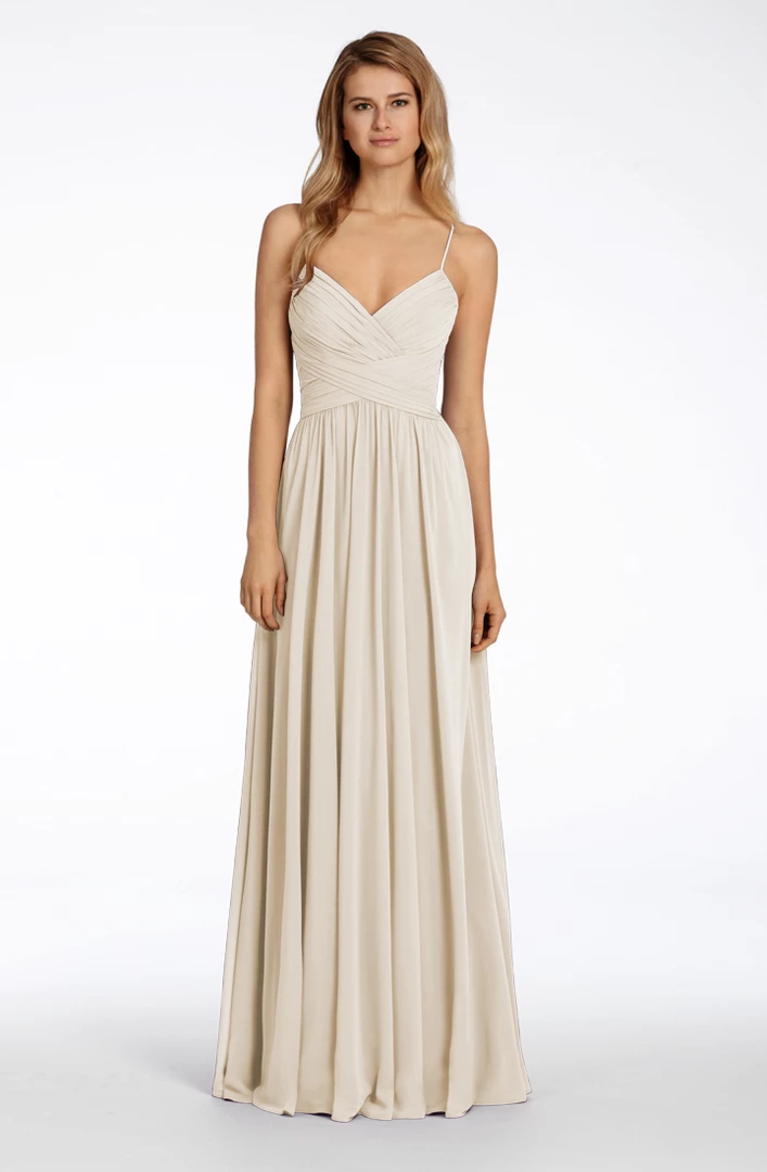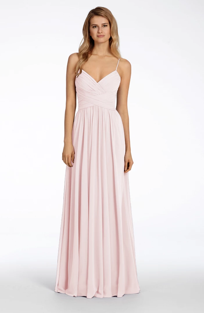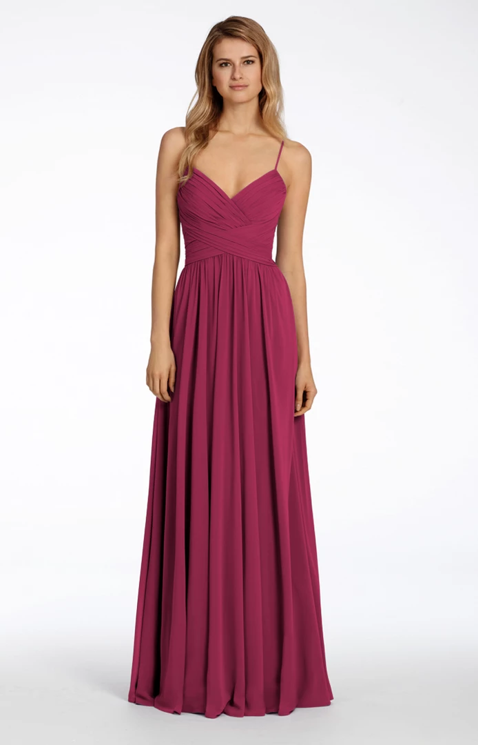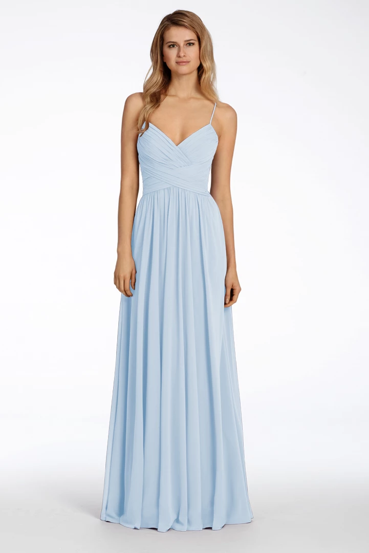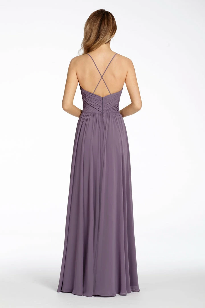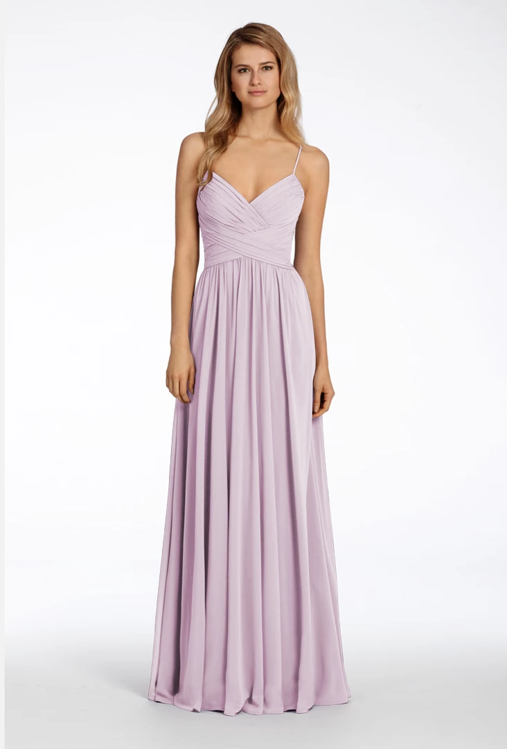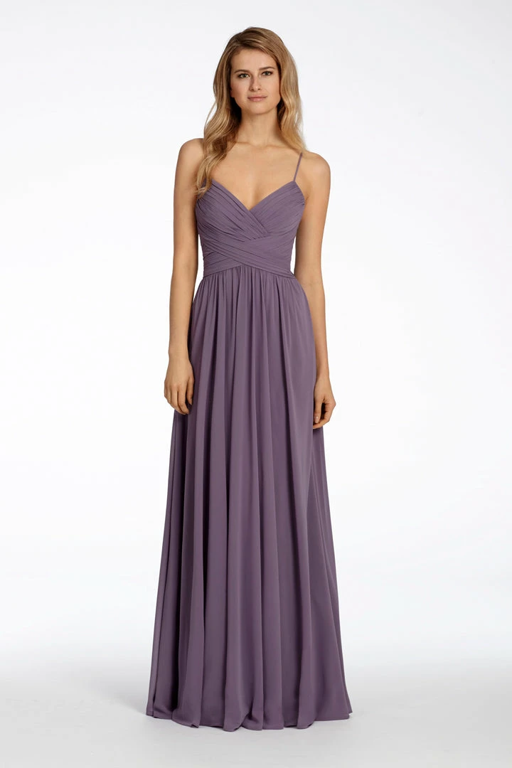 Hayley Paige Occasions bridesmaids dress – Wisteria chiffon A-line bridesmaid gown, draped bodice, dropped waist with a gathered skirt.