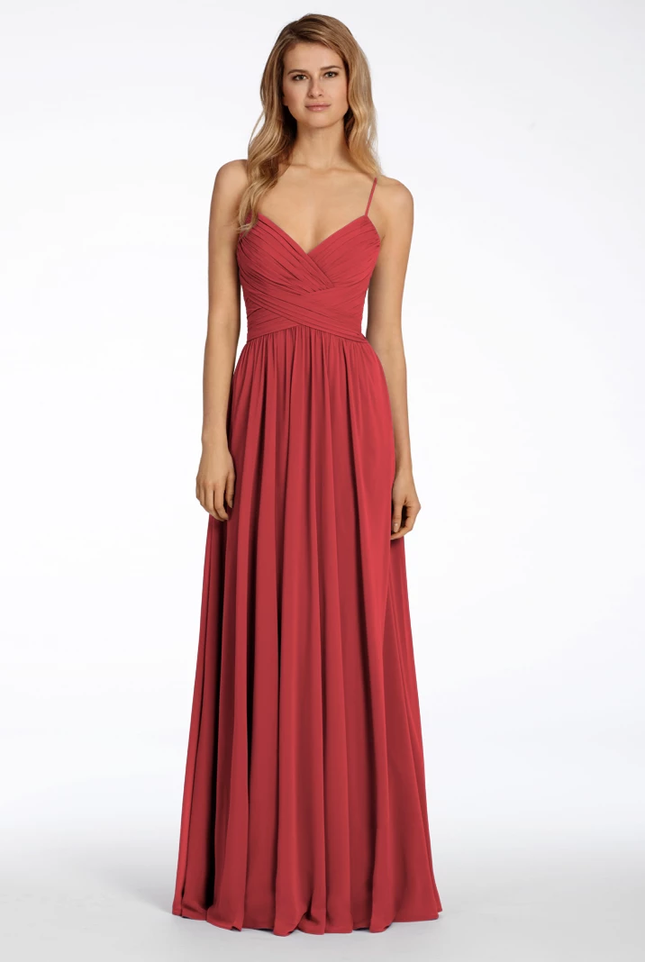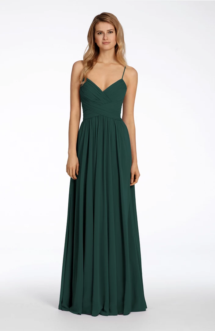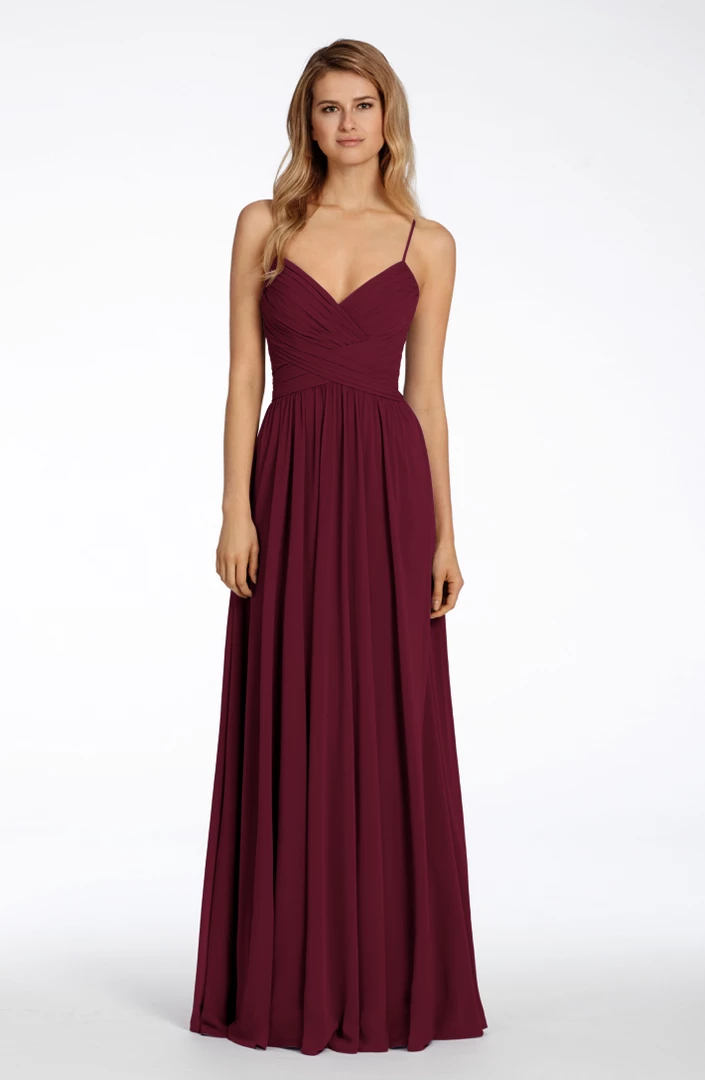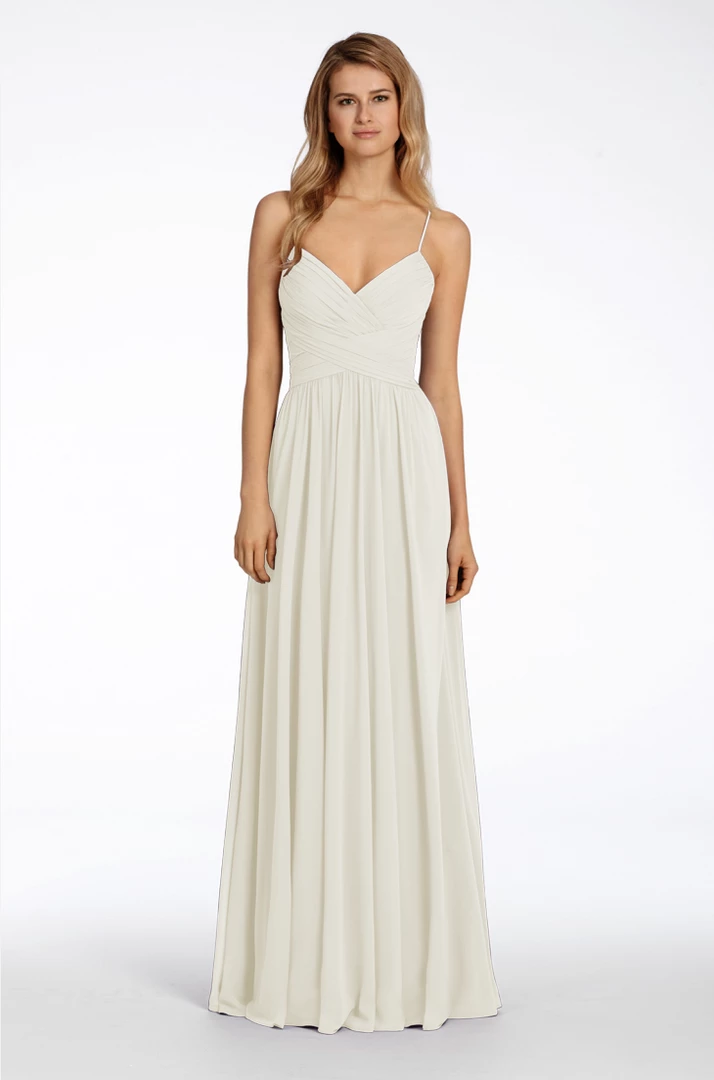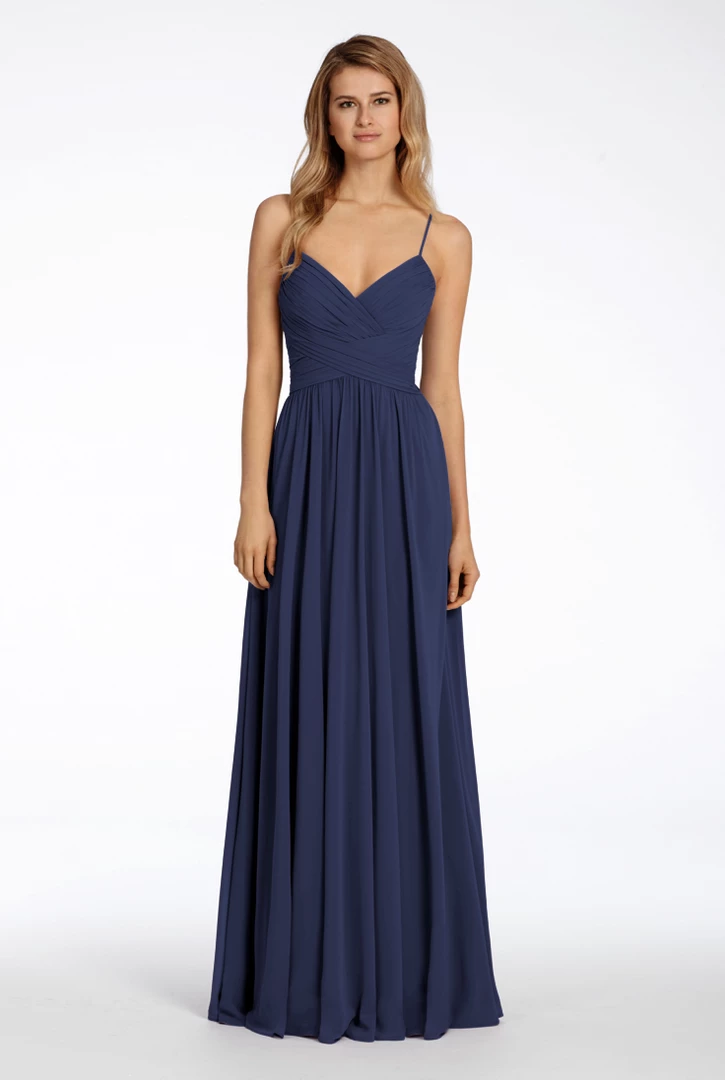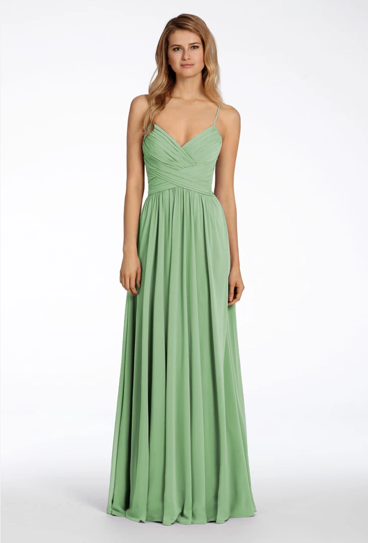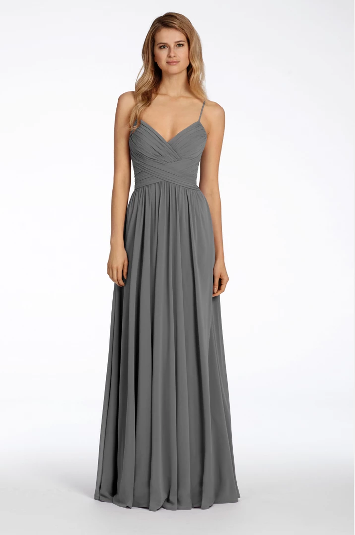 Hayley Paige Occasions bridesmaids dress – Wisteria chiffon A-line bridesmaid gown, draped bodice, dropped waist with a gathered skirt.