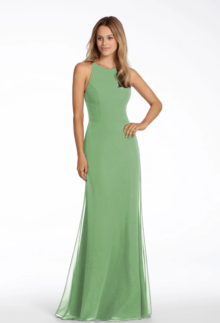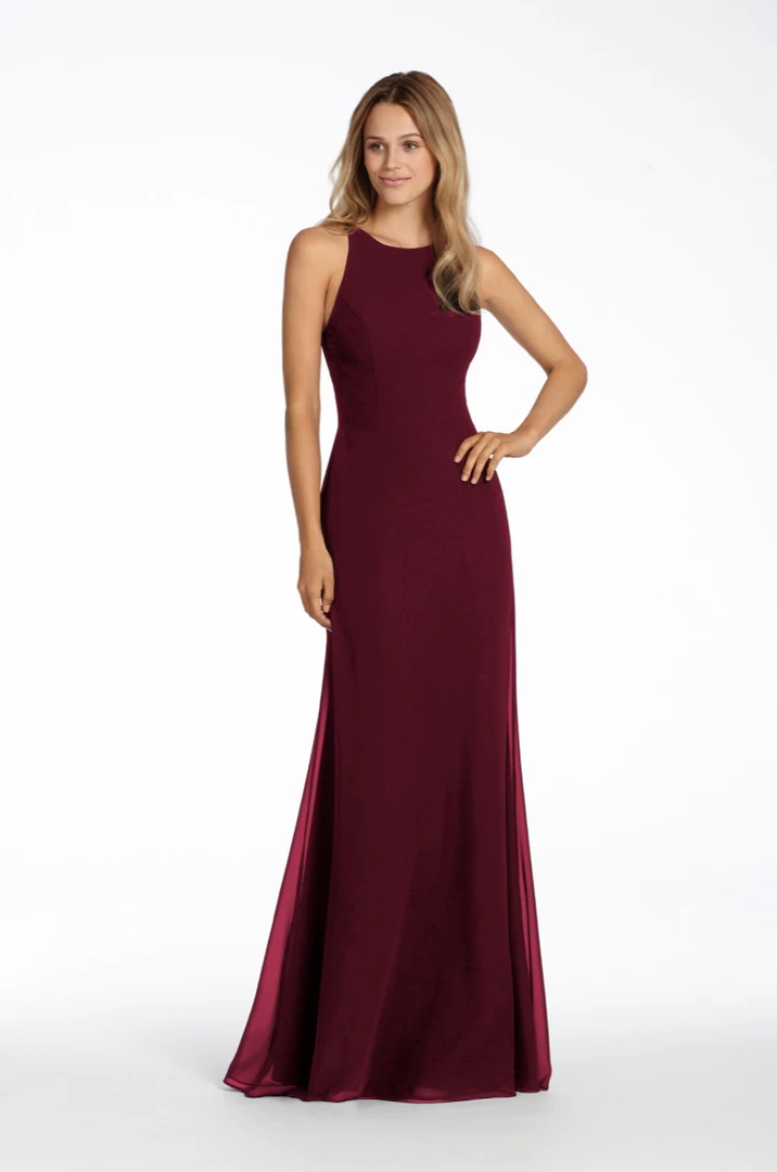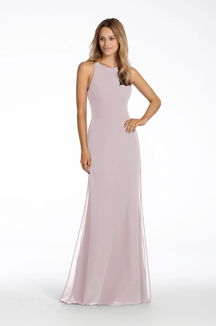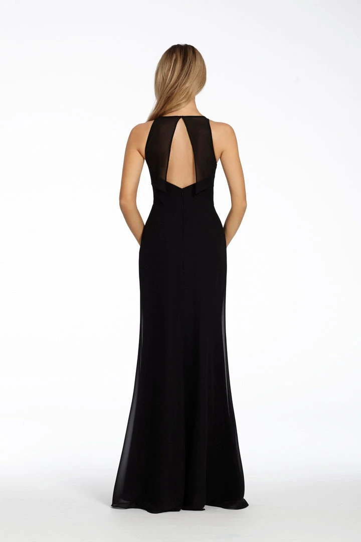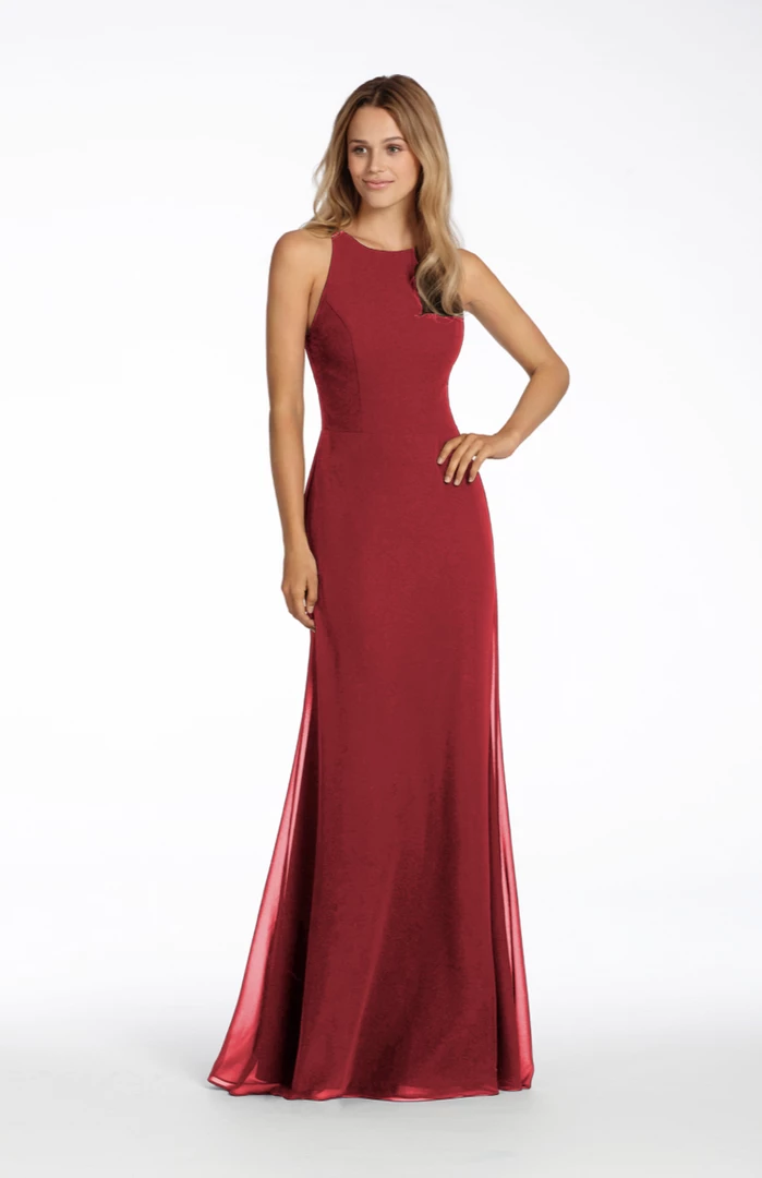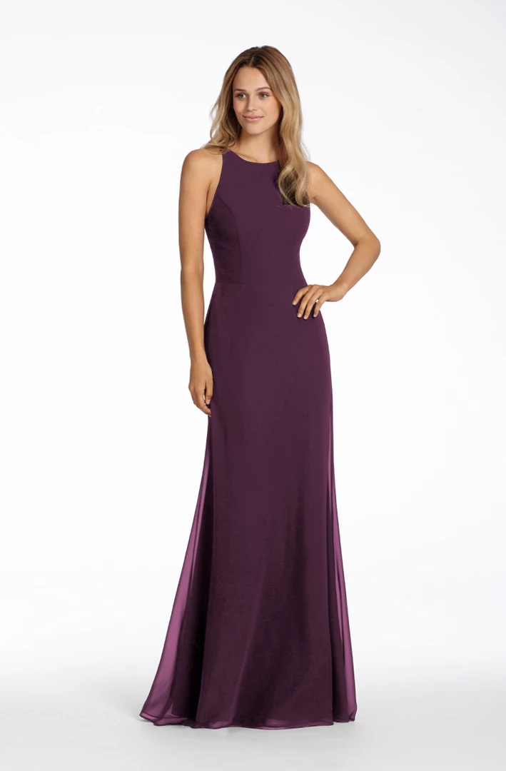 Hayley Paige chiffon A-line bridesmaid gown, high neckline, back sheer overlay with center slit.