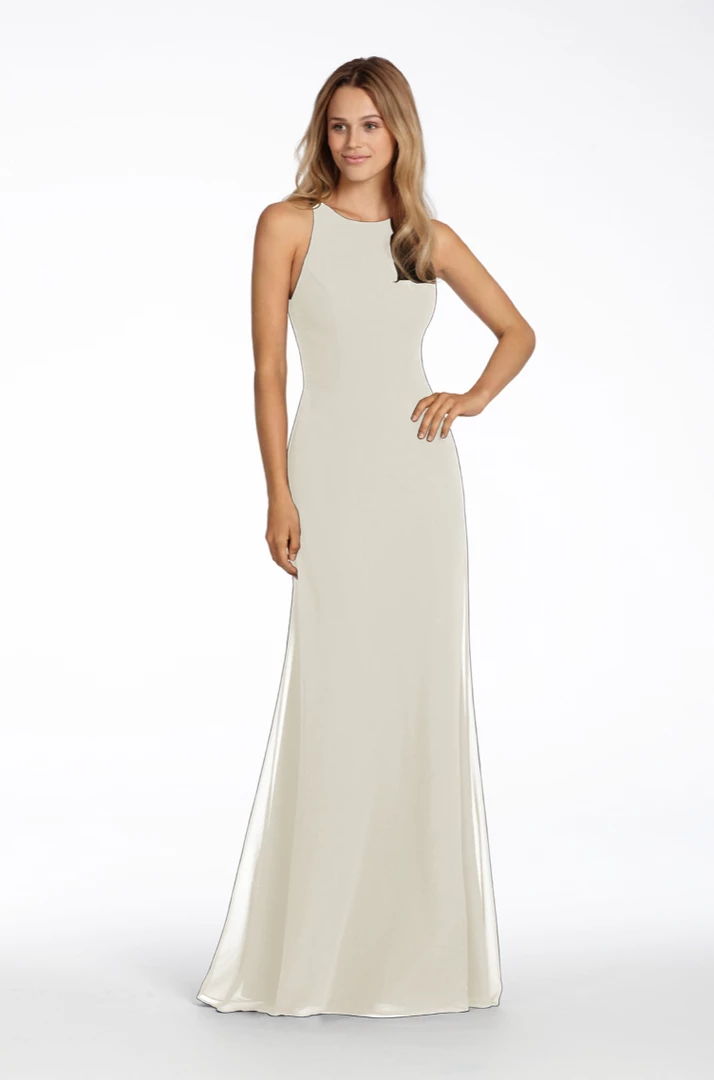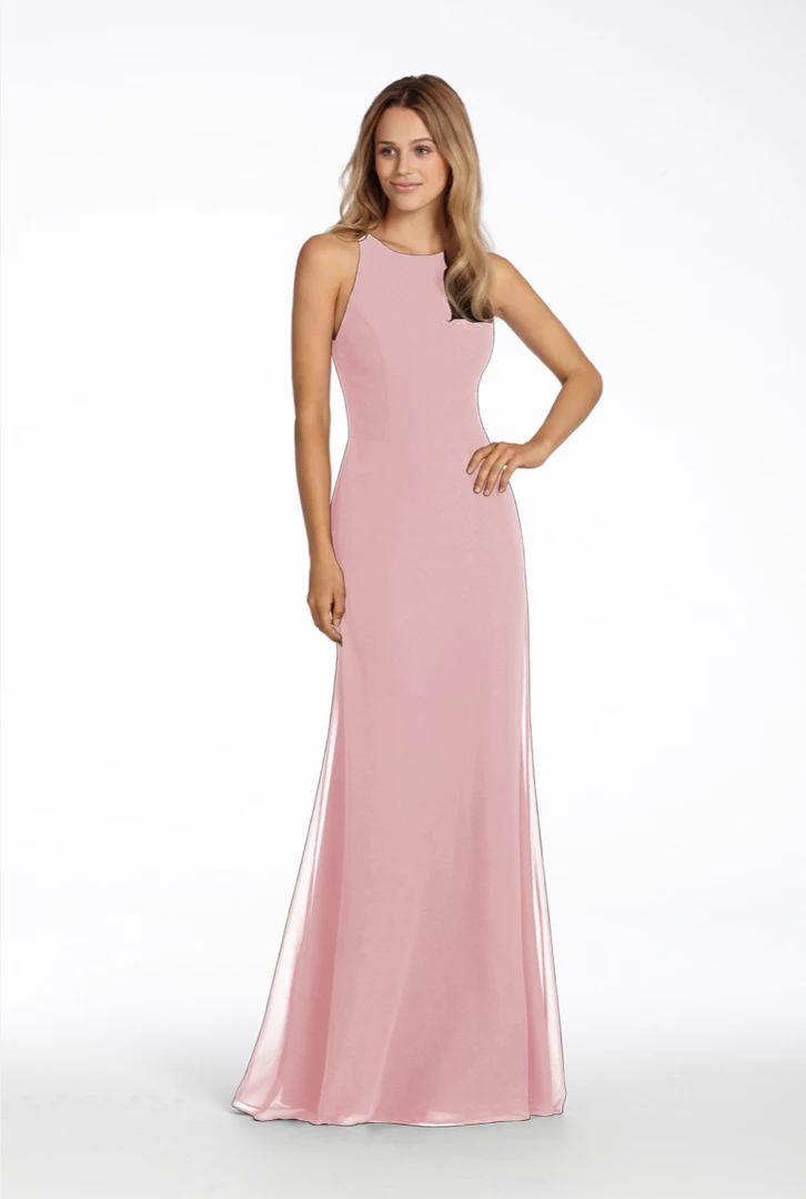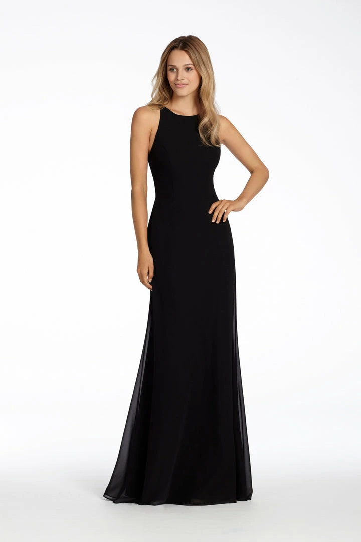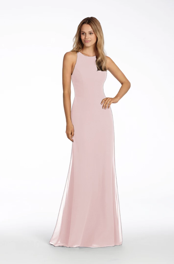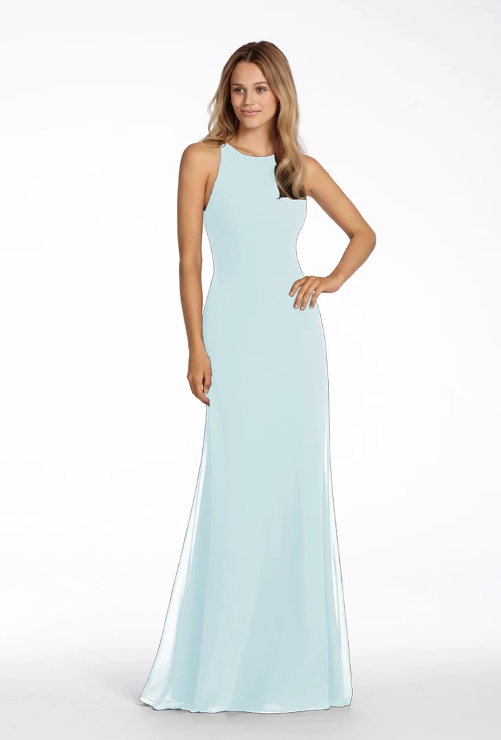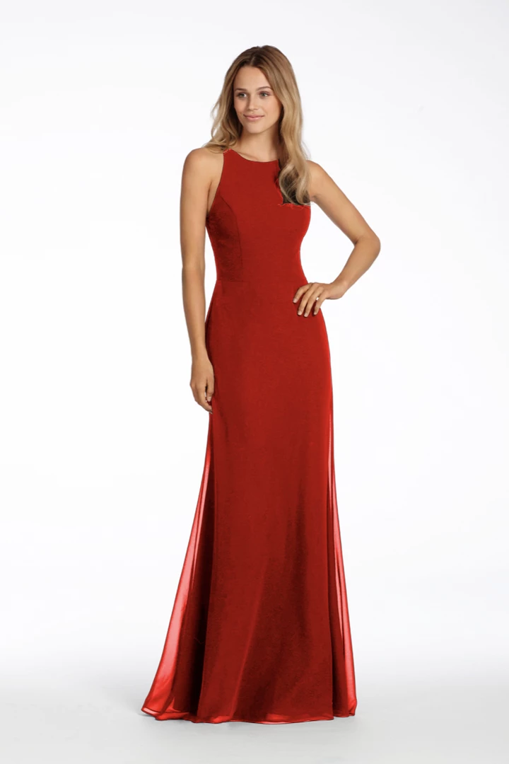 Hayley Paige chiffon A-line bridesmaid gown, high neckline, back sheer overlay with center slit.