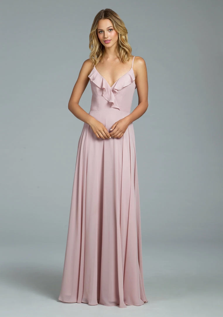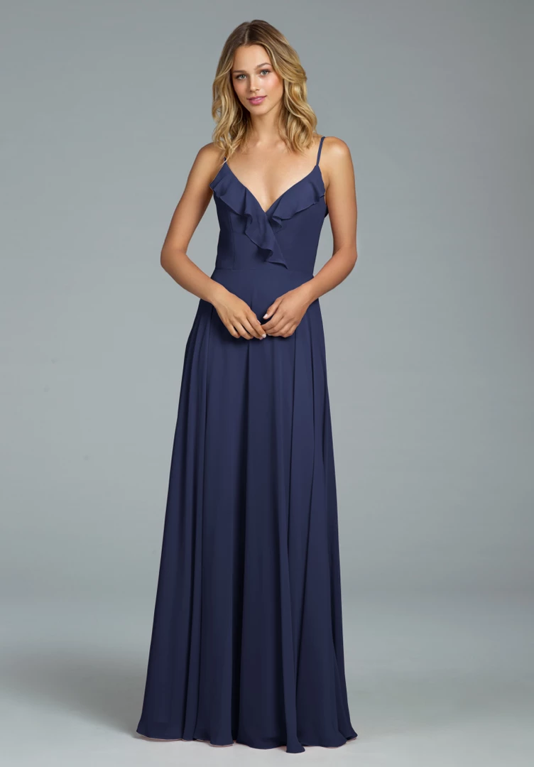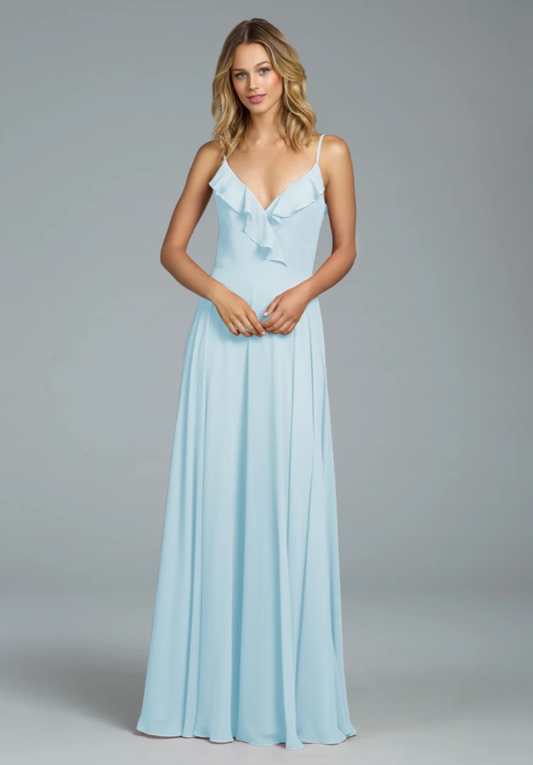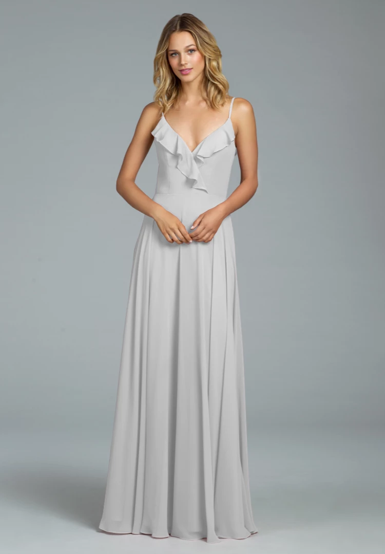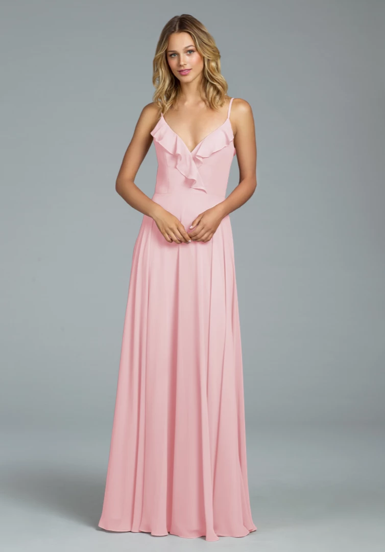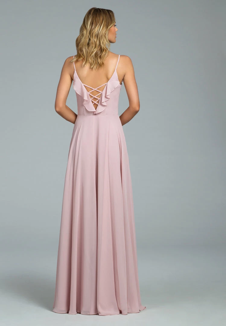 Ruffle v-neckline with crisscross ruffle back detail in chiffon.