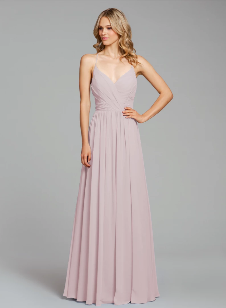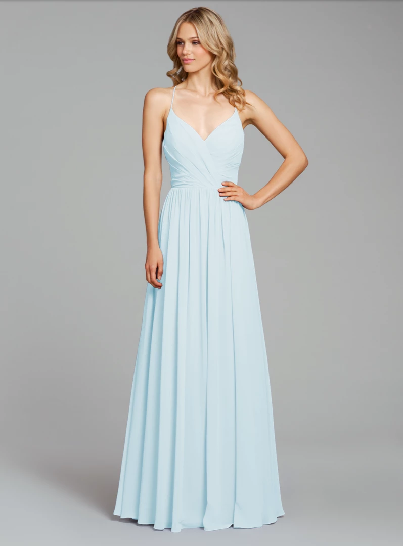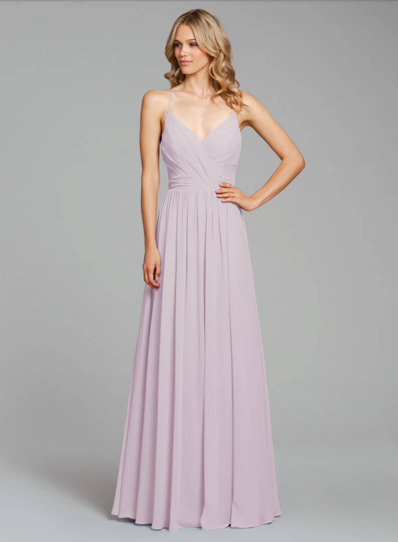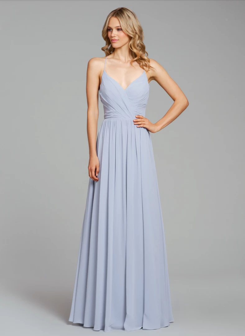 Hayley Paige chiffon A-Line bridesmaids gown, cross over draped bodice, with a gathered skirt.