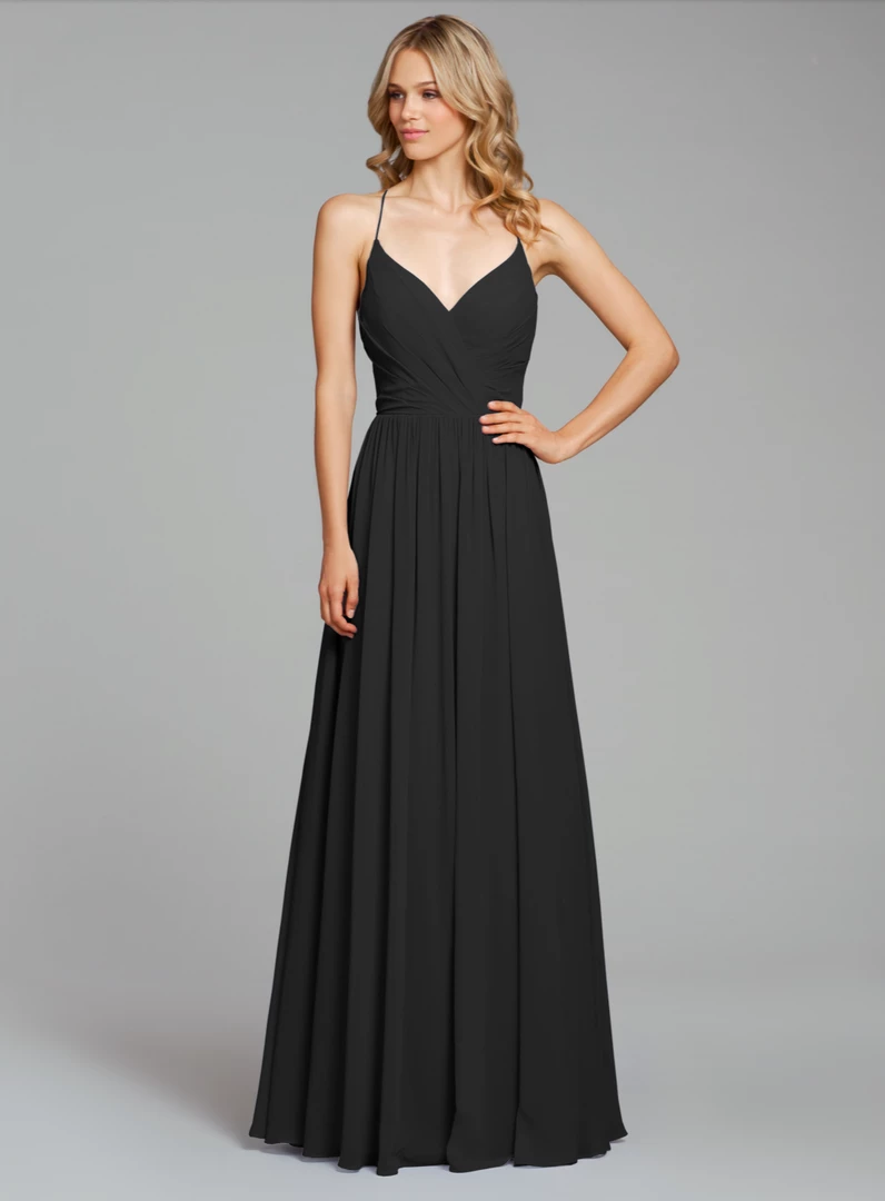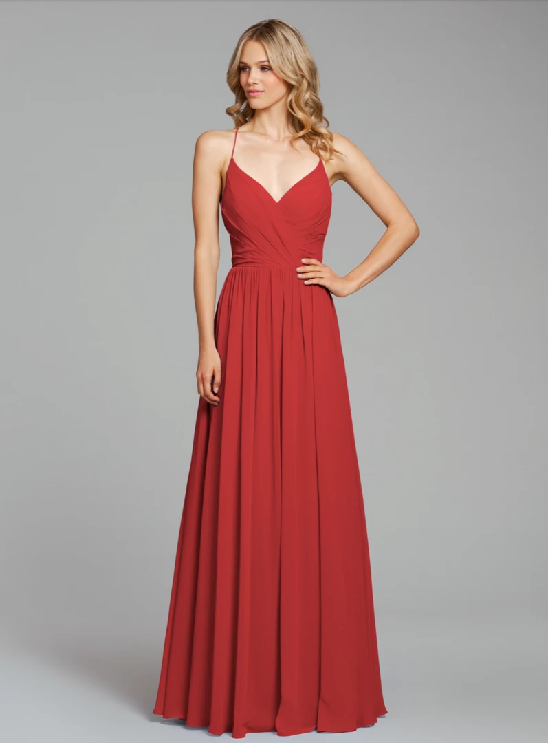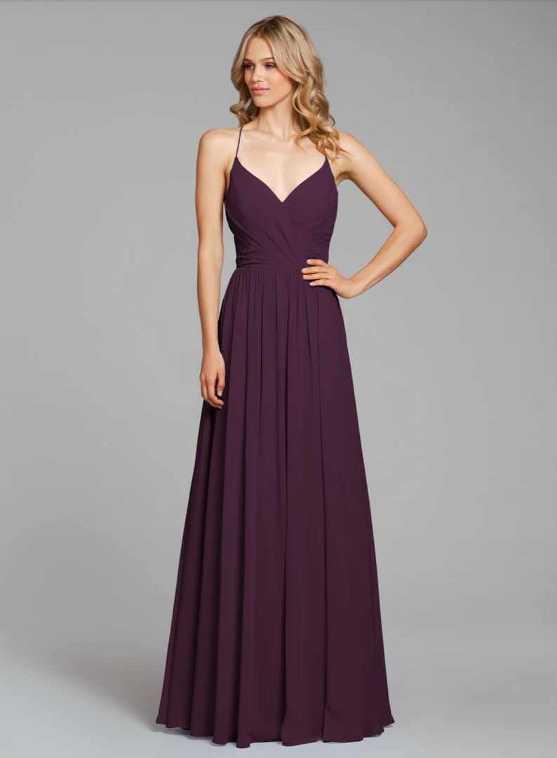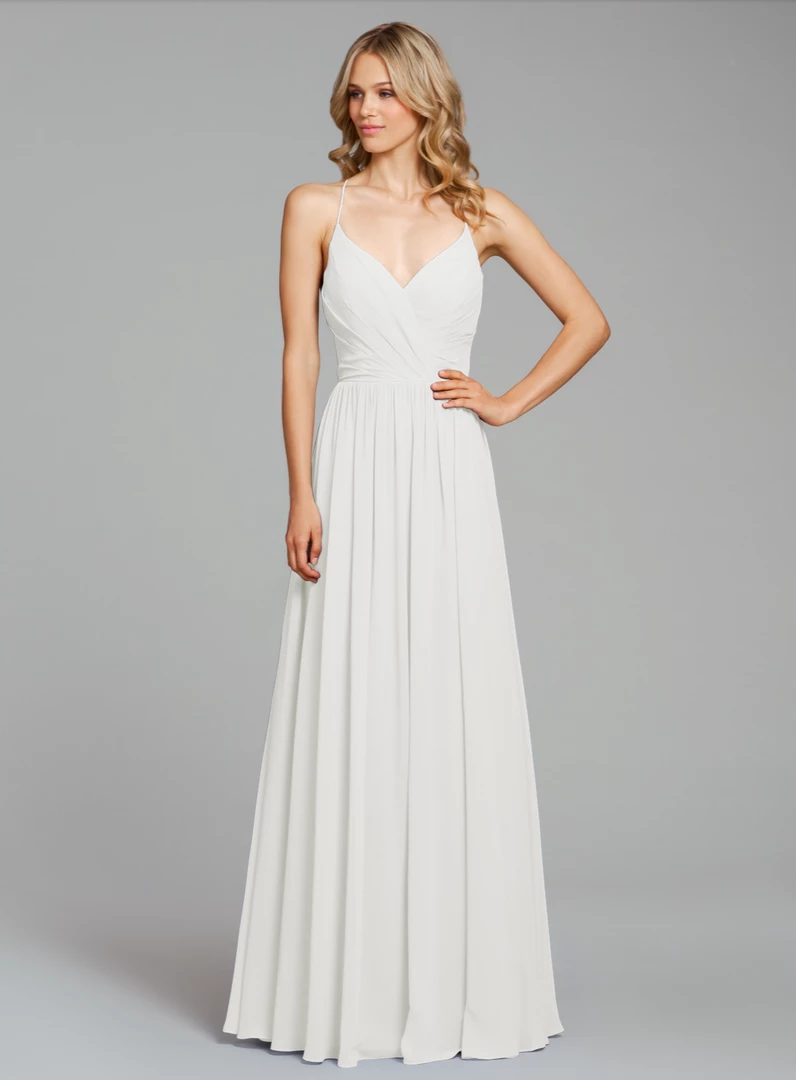 Hayley Paige chiffon A-Line bridesmaids gown, cross over draped bodice, with a gathered skirt.