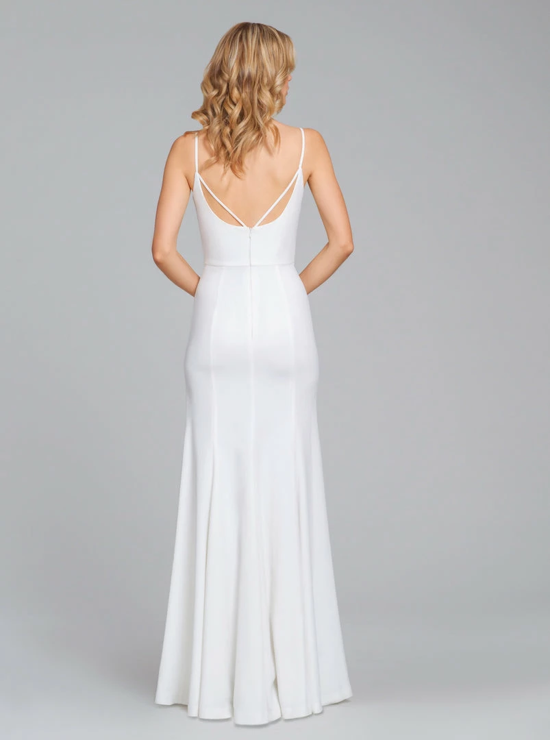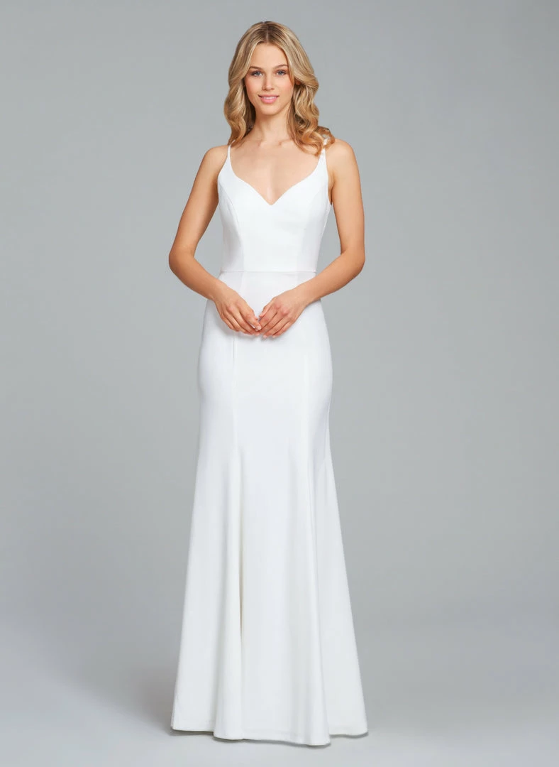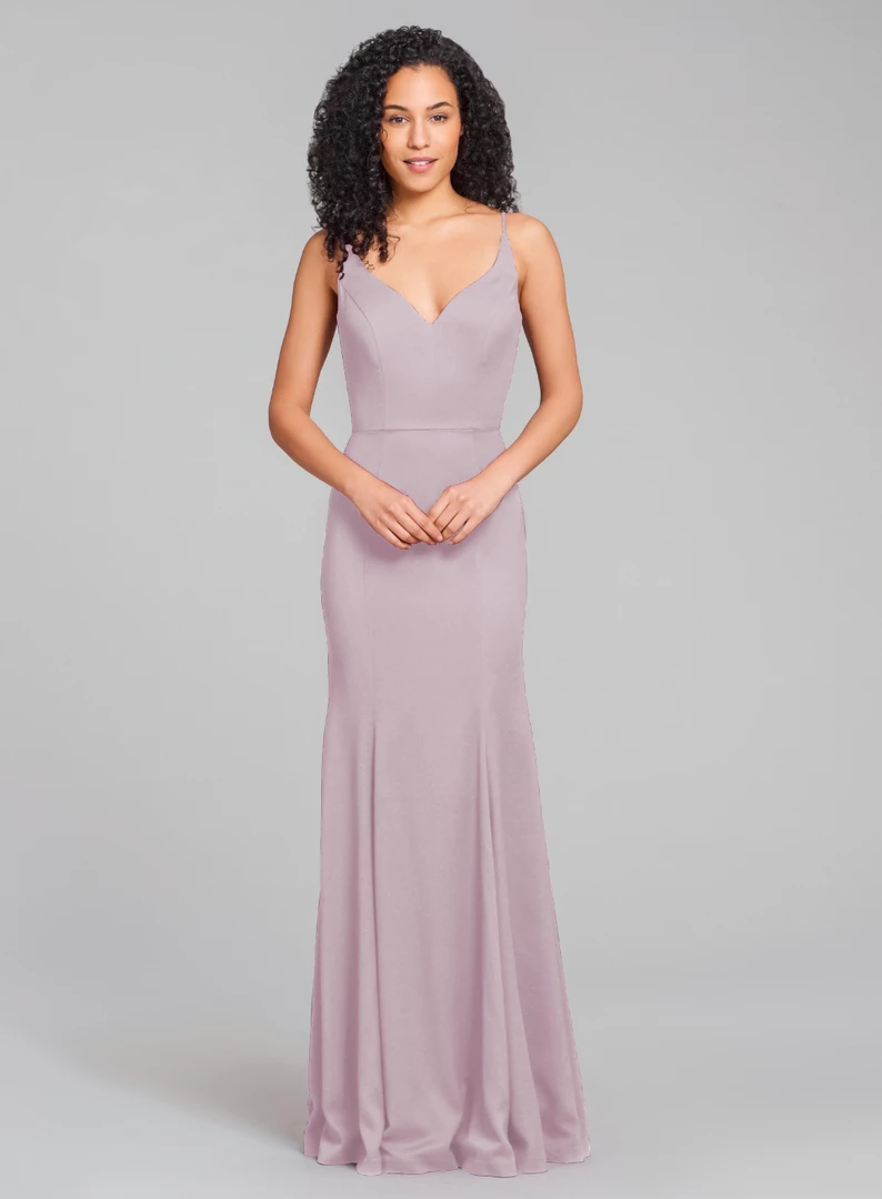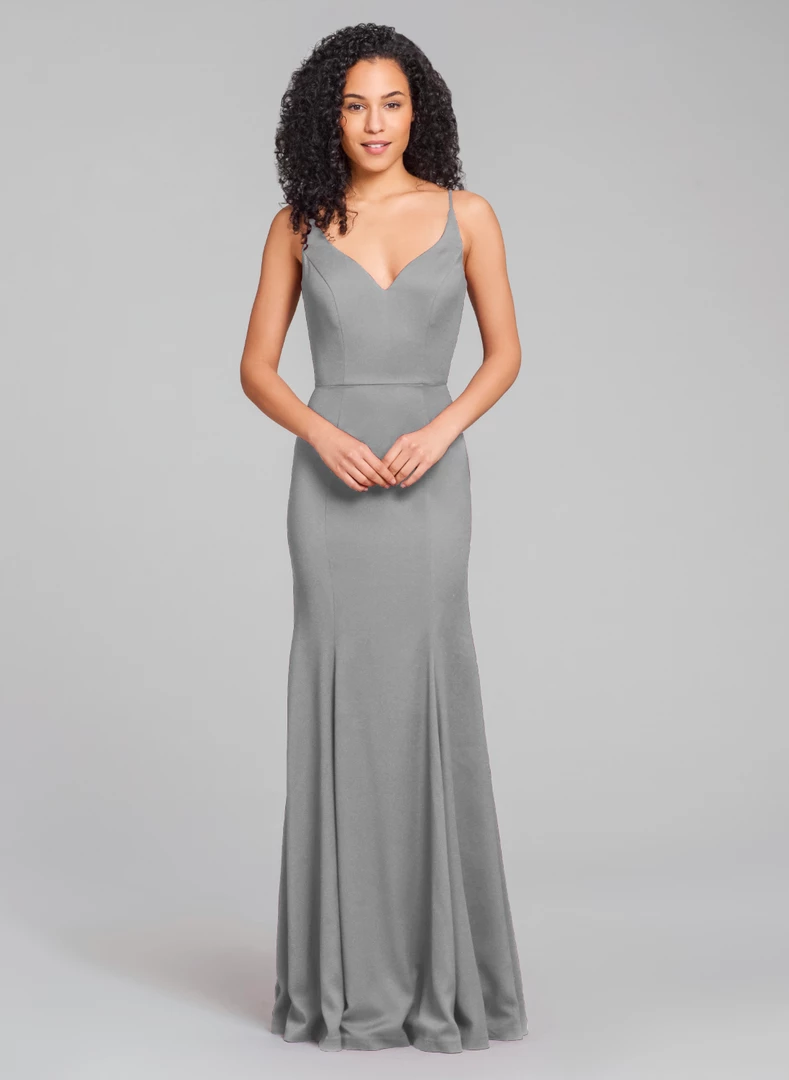 Hayley Paige curved V-neckline, fit and flare bridesmaid dress in crepe.
