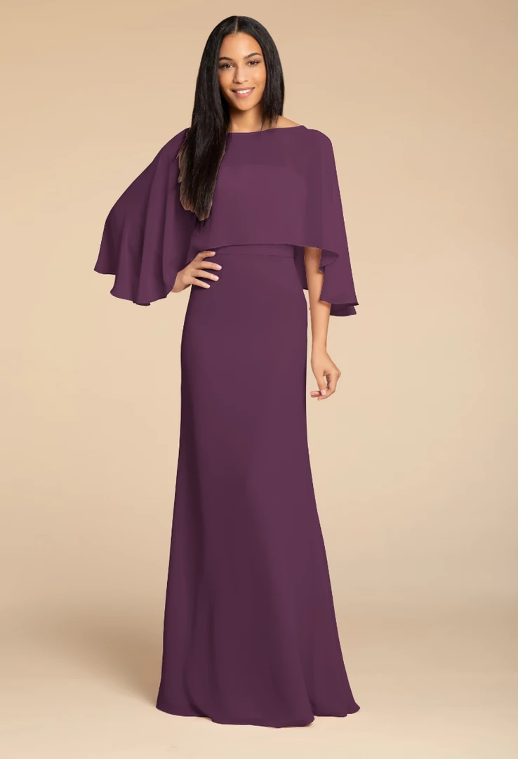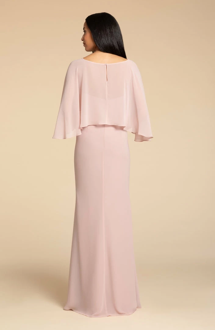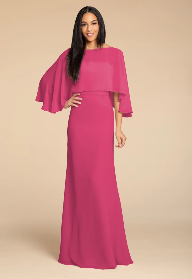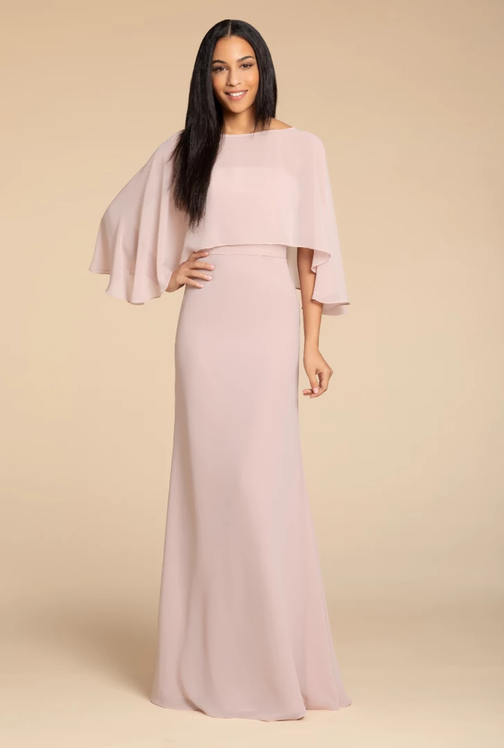 Hayley Paige Occasions bridesmaids gown – chiffon A-line gown, curved strapless bodice, natural waist. Removable cape.