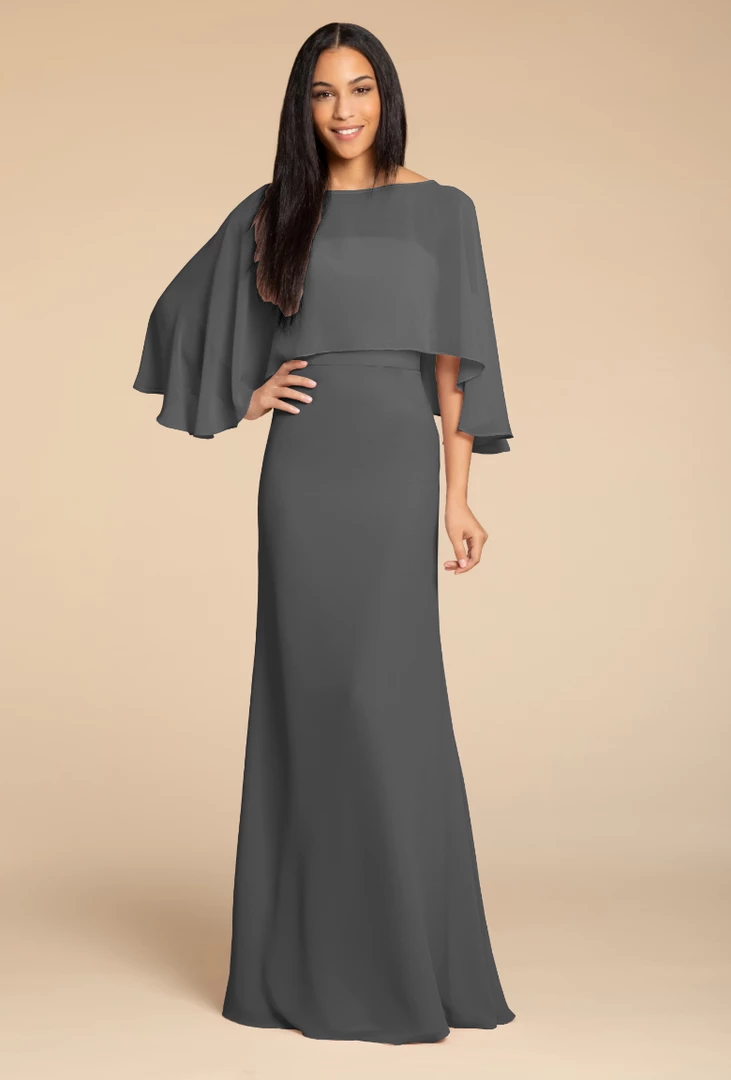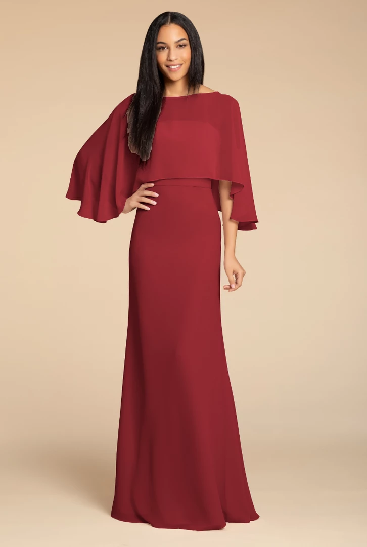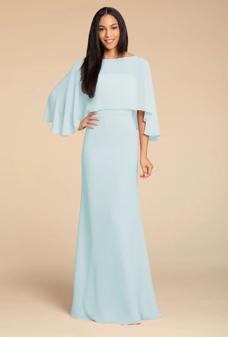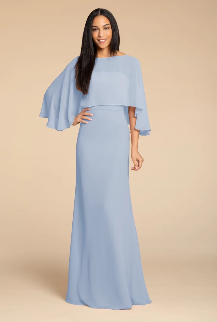 Hayley Paige Occasions bridesmaids gown – chiffon A-line gown, curved strapless bodice, natural waist. Removable cape.
