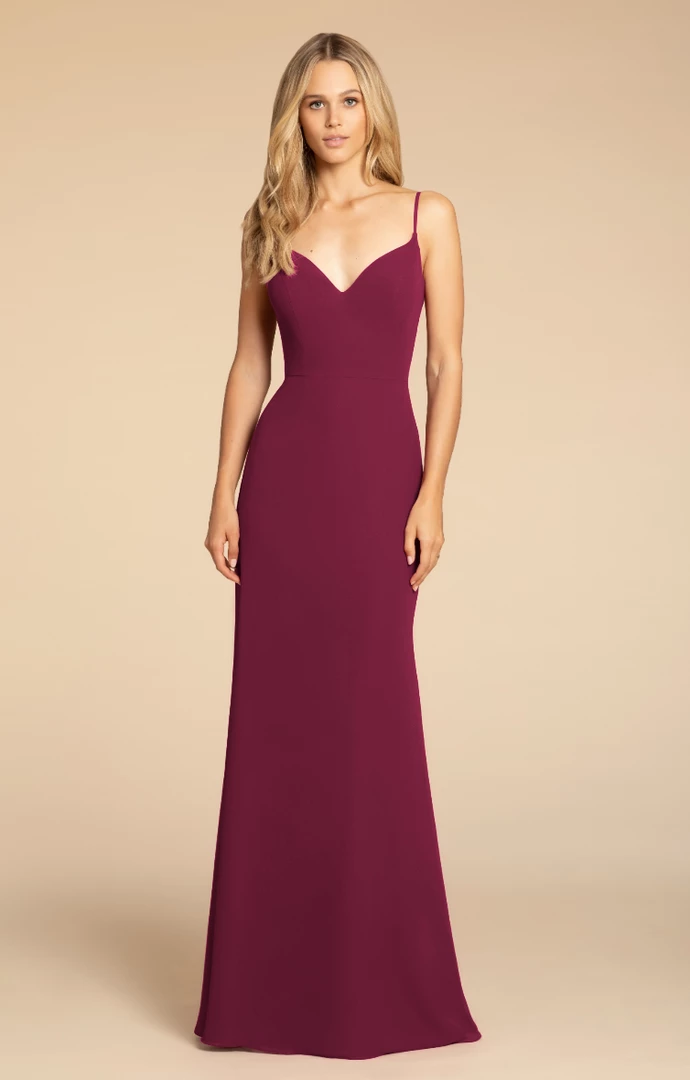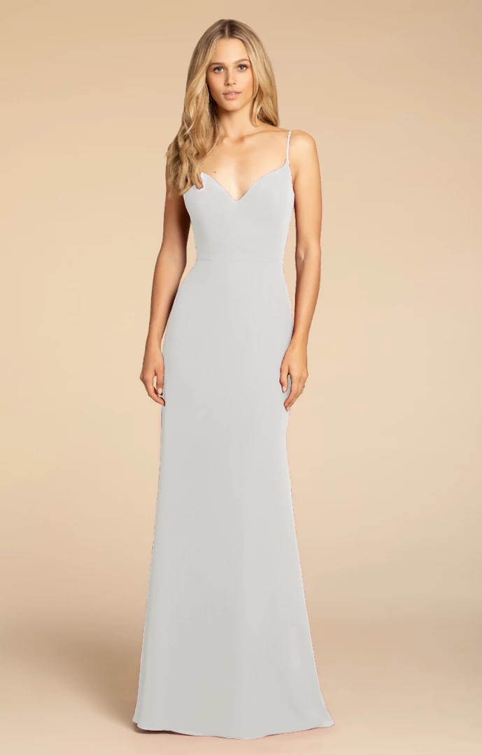 Hayley Paige Occasions bridesmaids gown – chiffon A-line gown, V-neckline, natural waist.