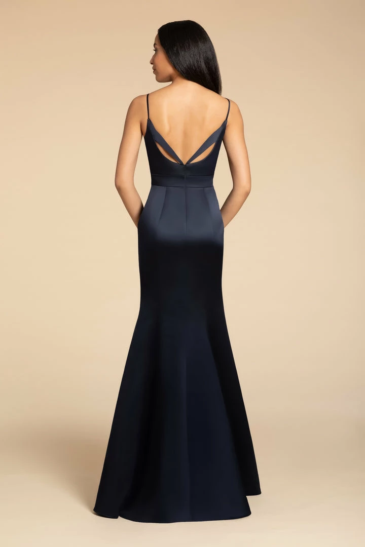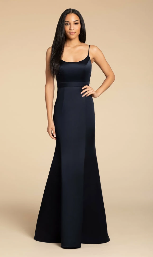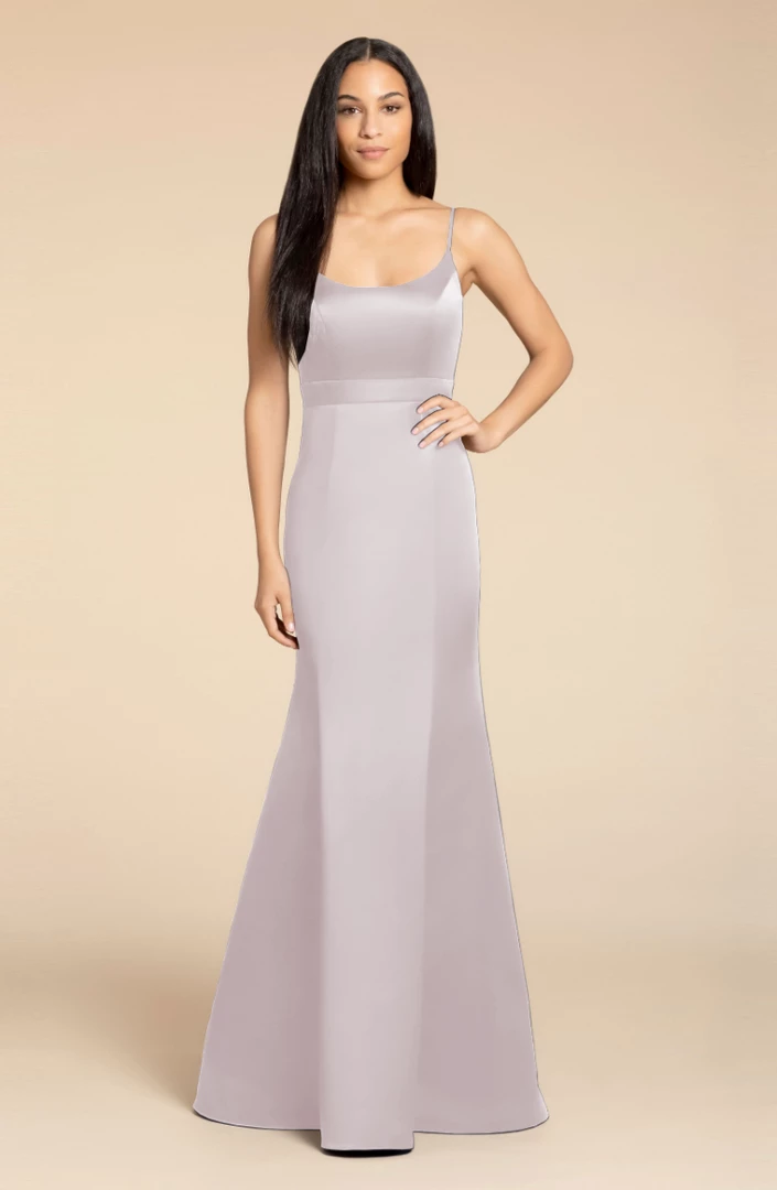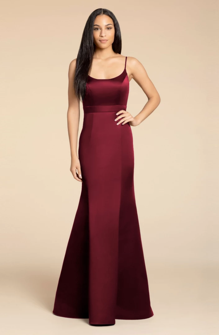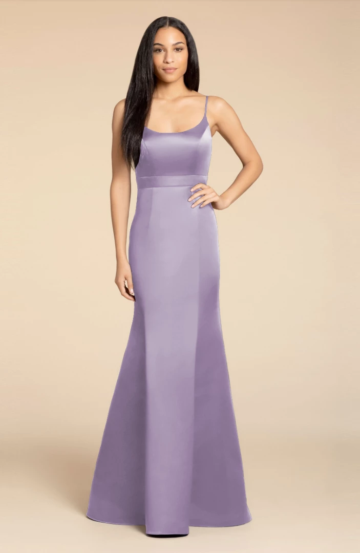 Hayley Paige Occasions bridesmaids gown – satin trumpet dress, scoop¬†neckline, with open back with strap detail.