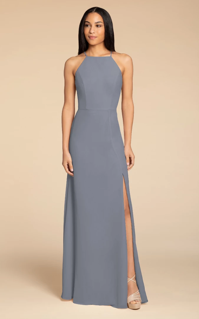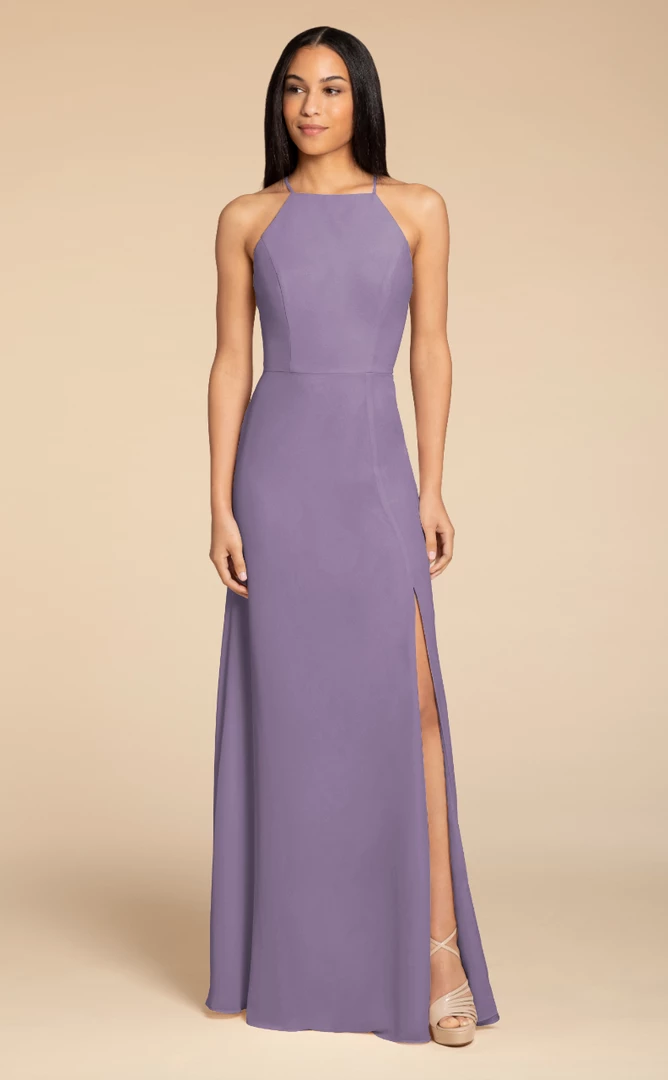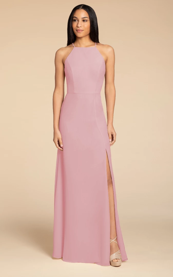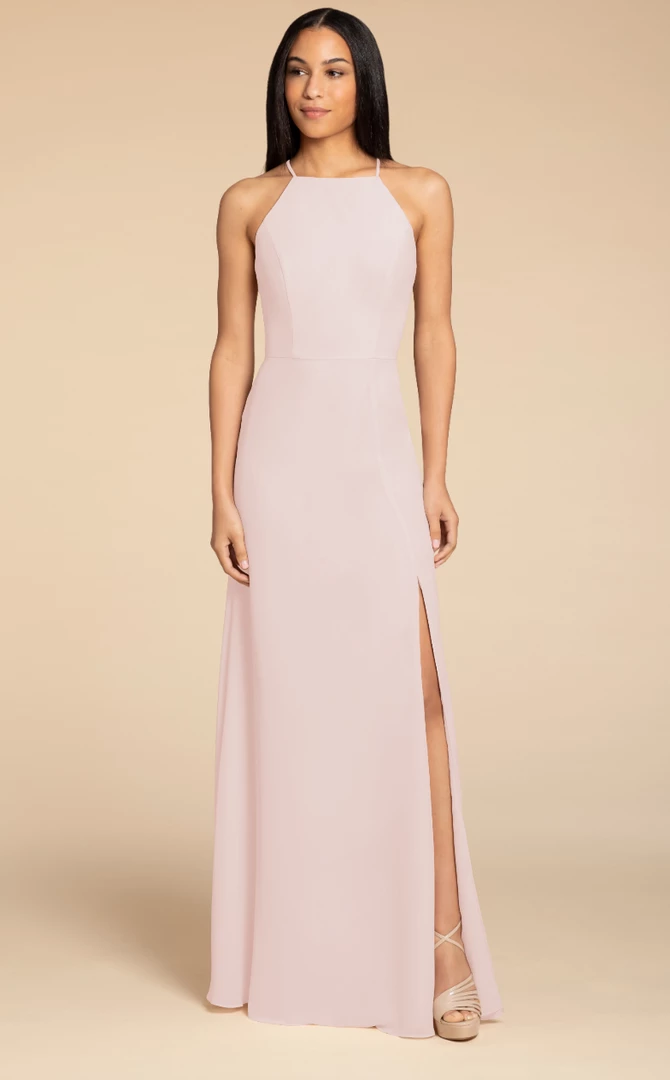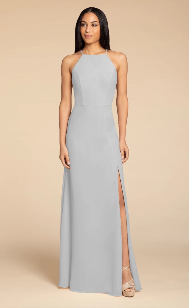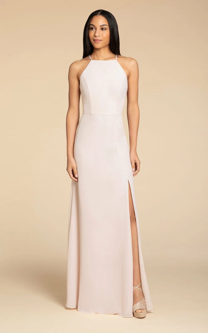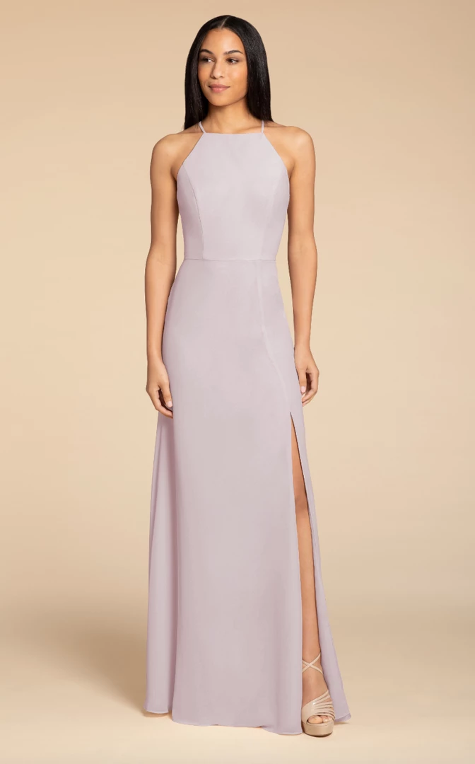 Hayley Paige Occasions bridesmaids gown – chiffon A-line gown, racer square neckline with tie back detail.
