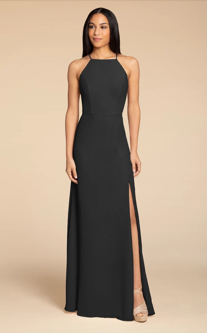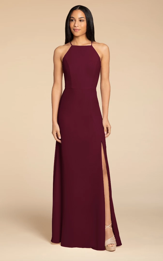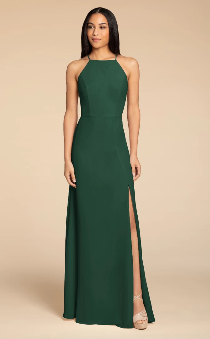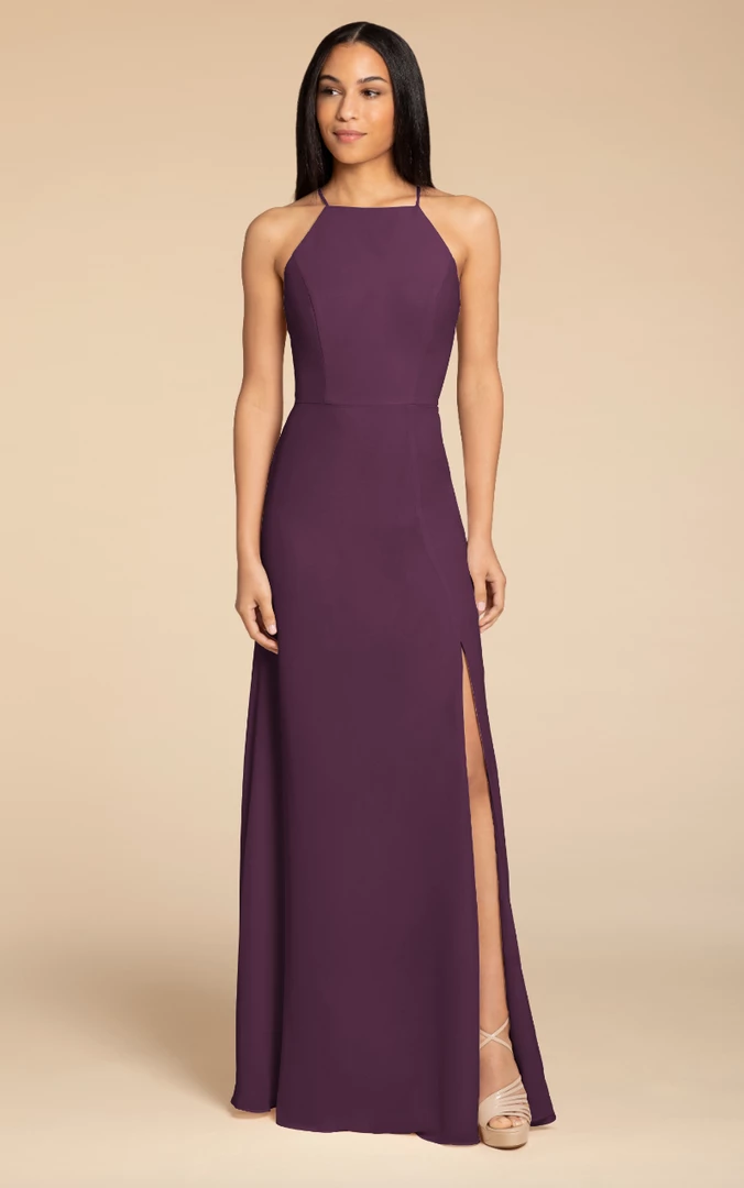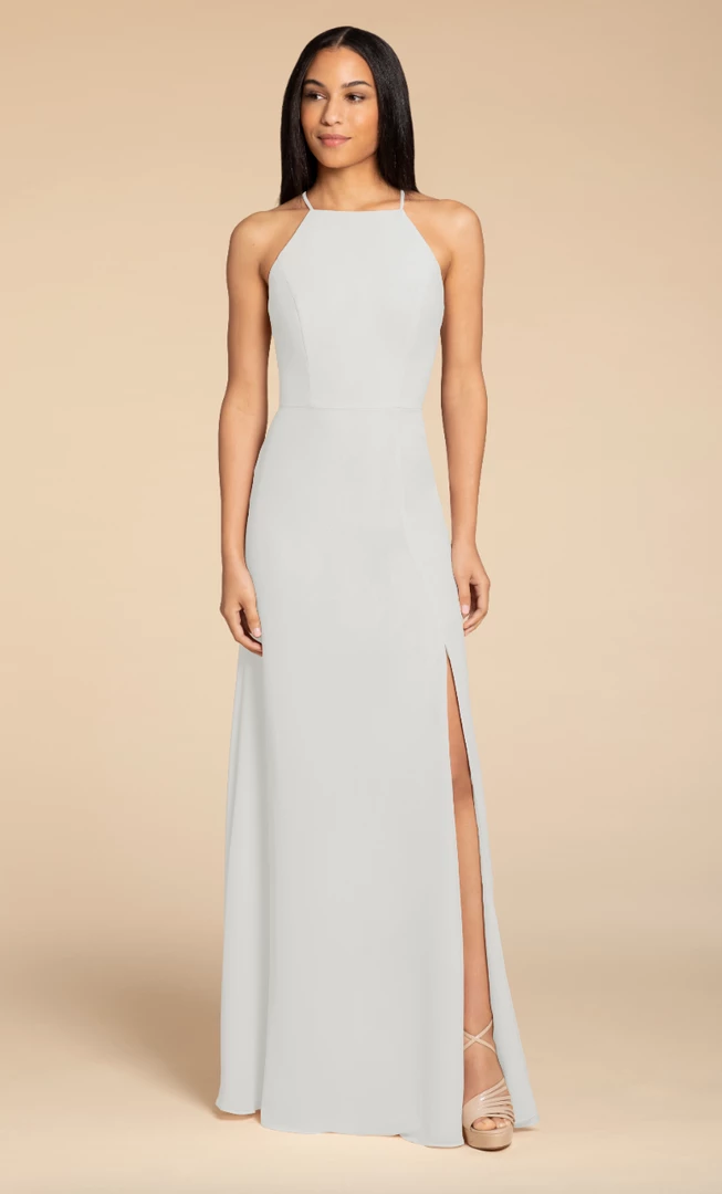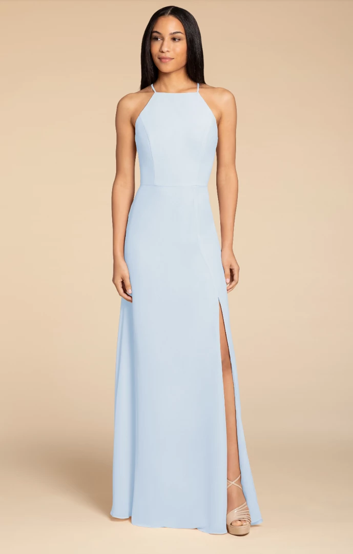 Hayley Paige Occasions bridesmaids gown – chiffon A-line gown, racer square neckline with tie back detail.