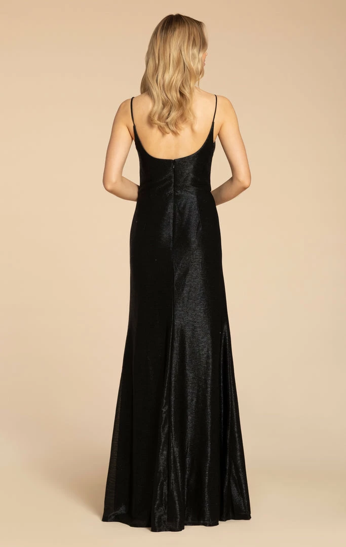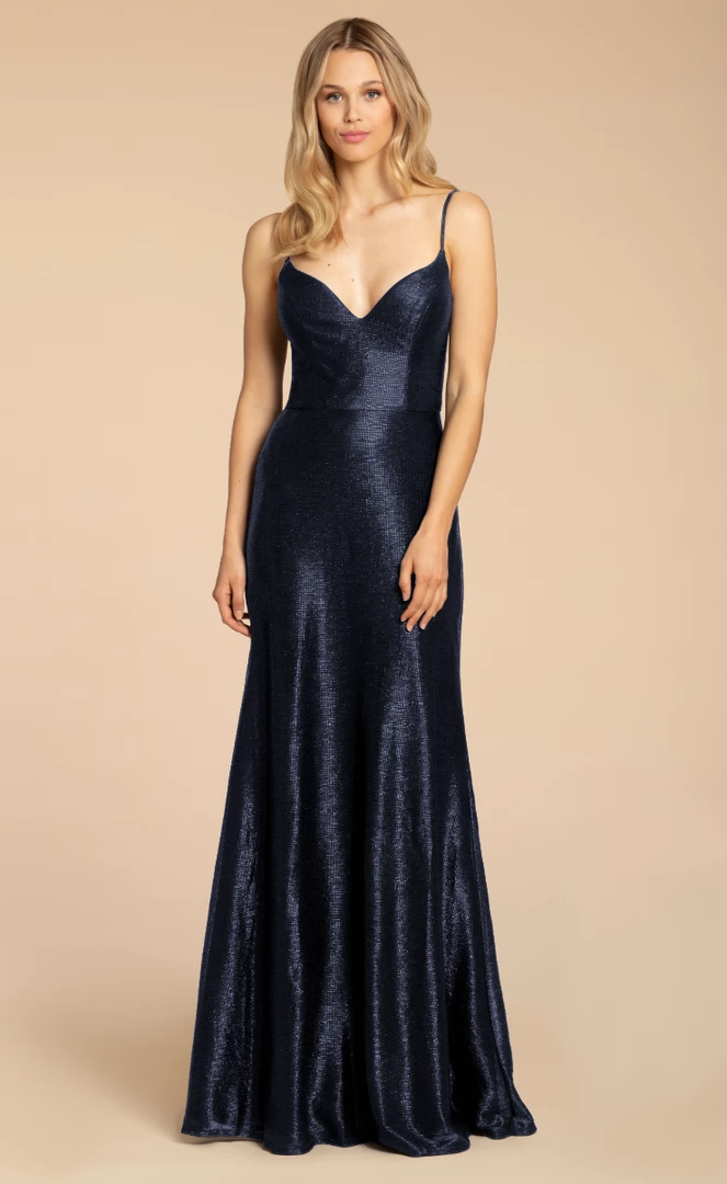 Hayley Paige A-line gown, curved V-neckline inΒ liquid metallic.