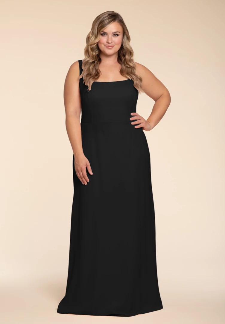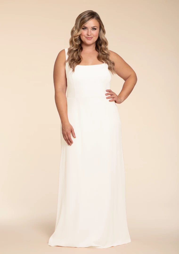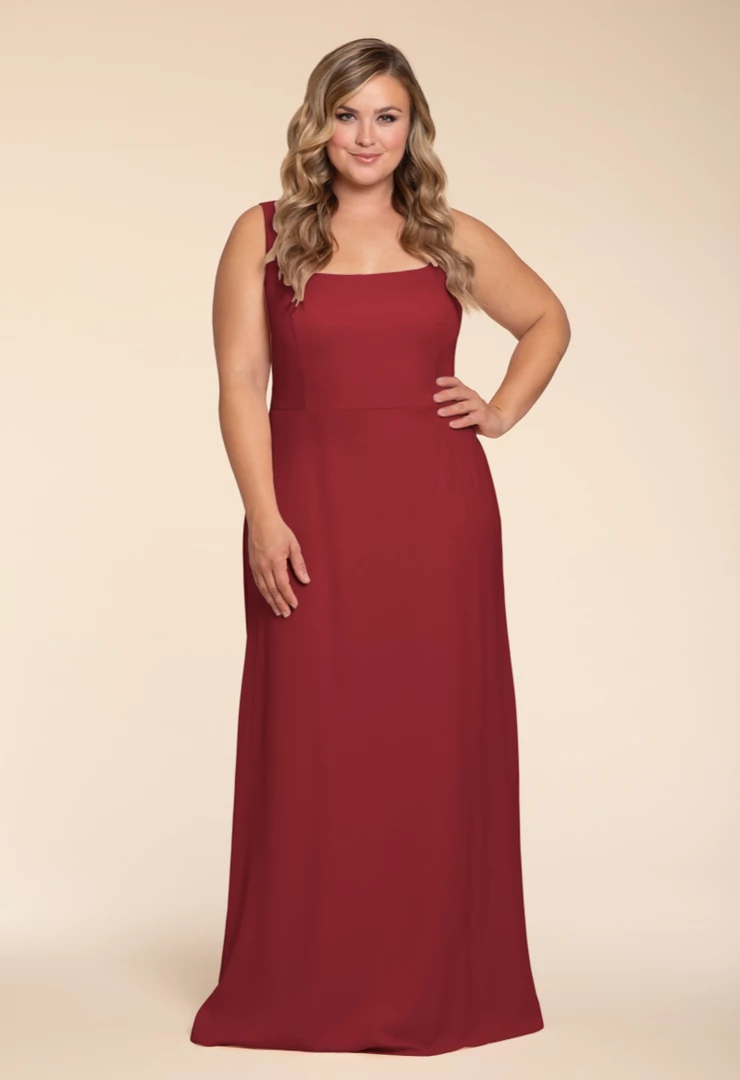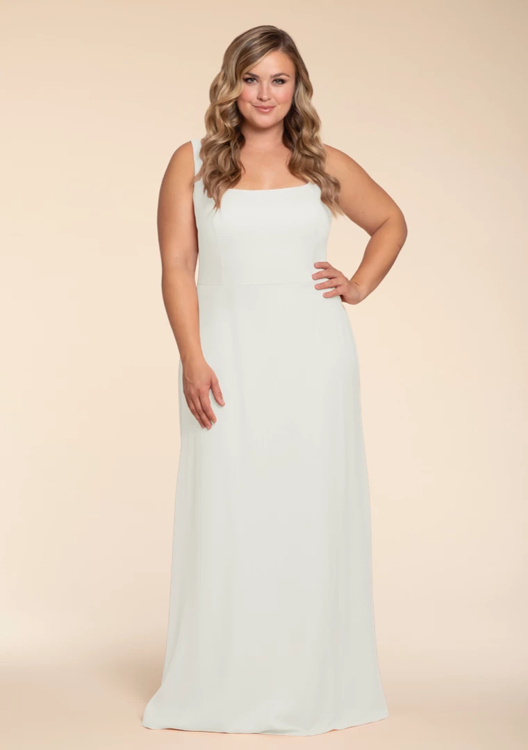 Hayley Paige Occasions plus size bridesmaids dress – crepe A-line gown, square neckline, natural waist, tie detail at back.