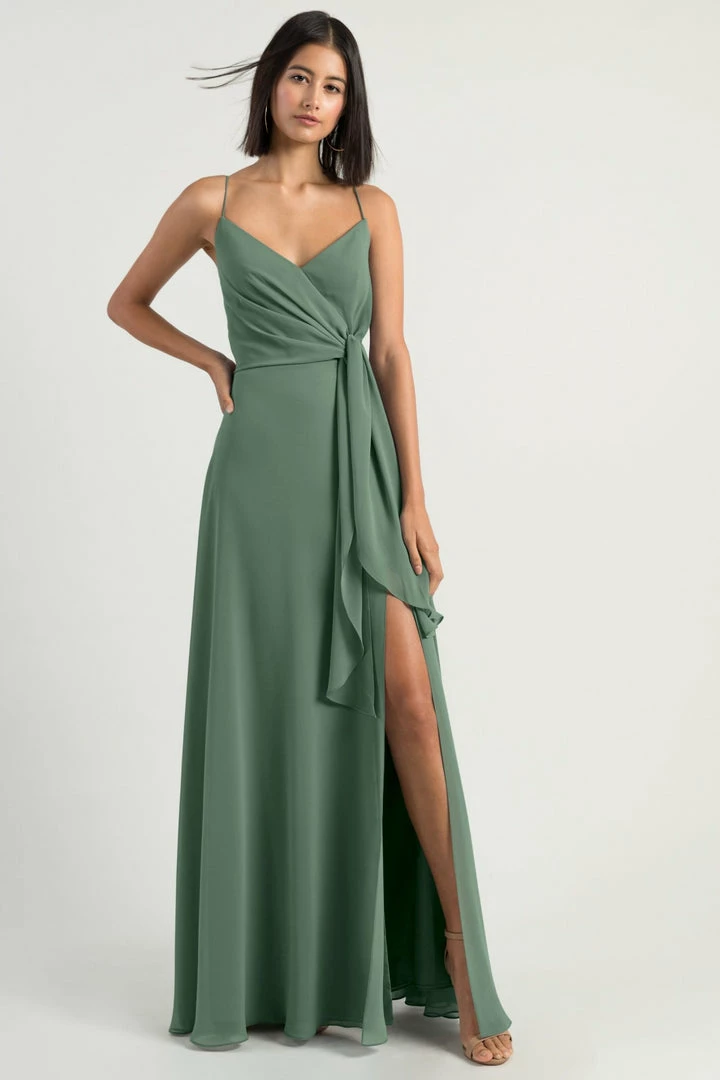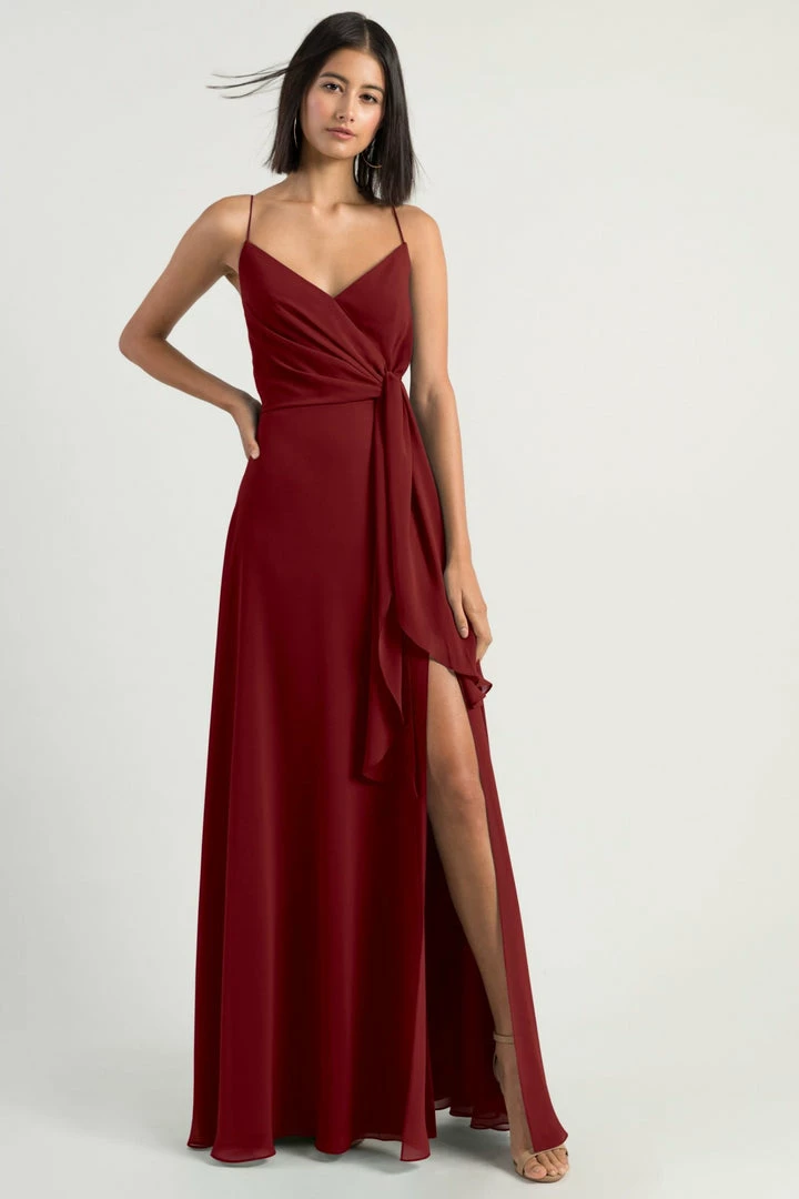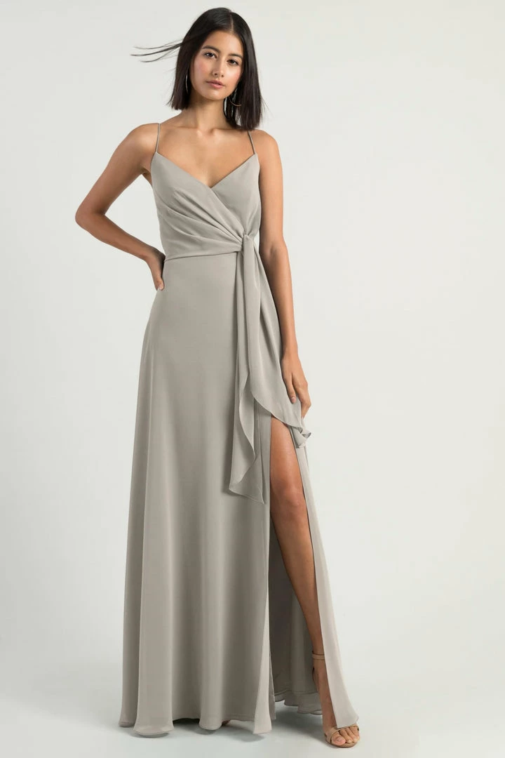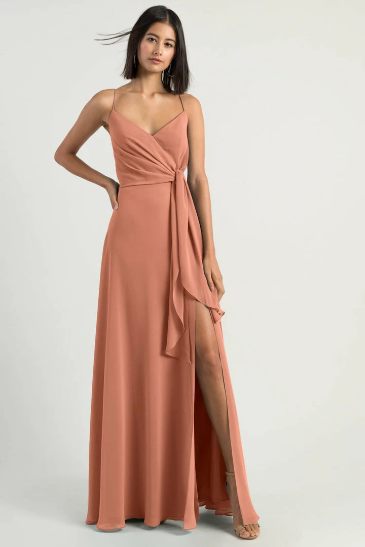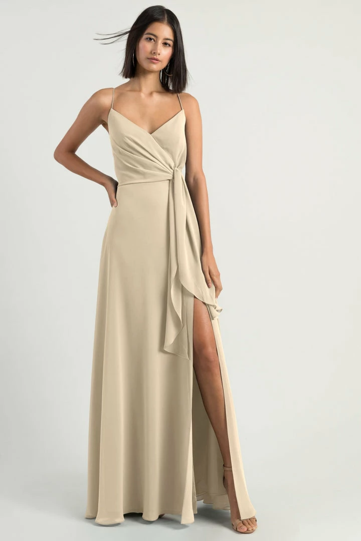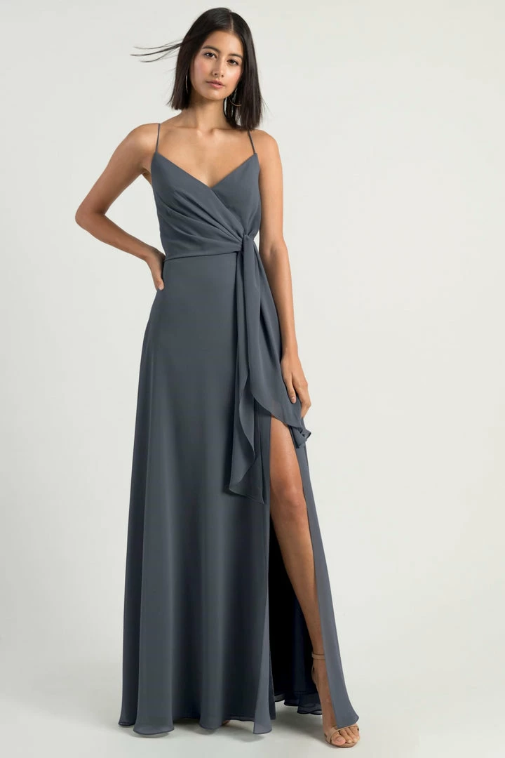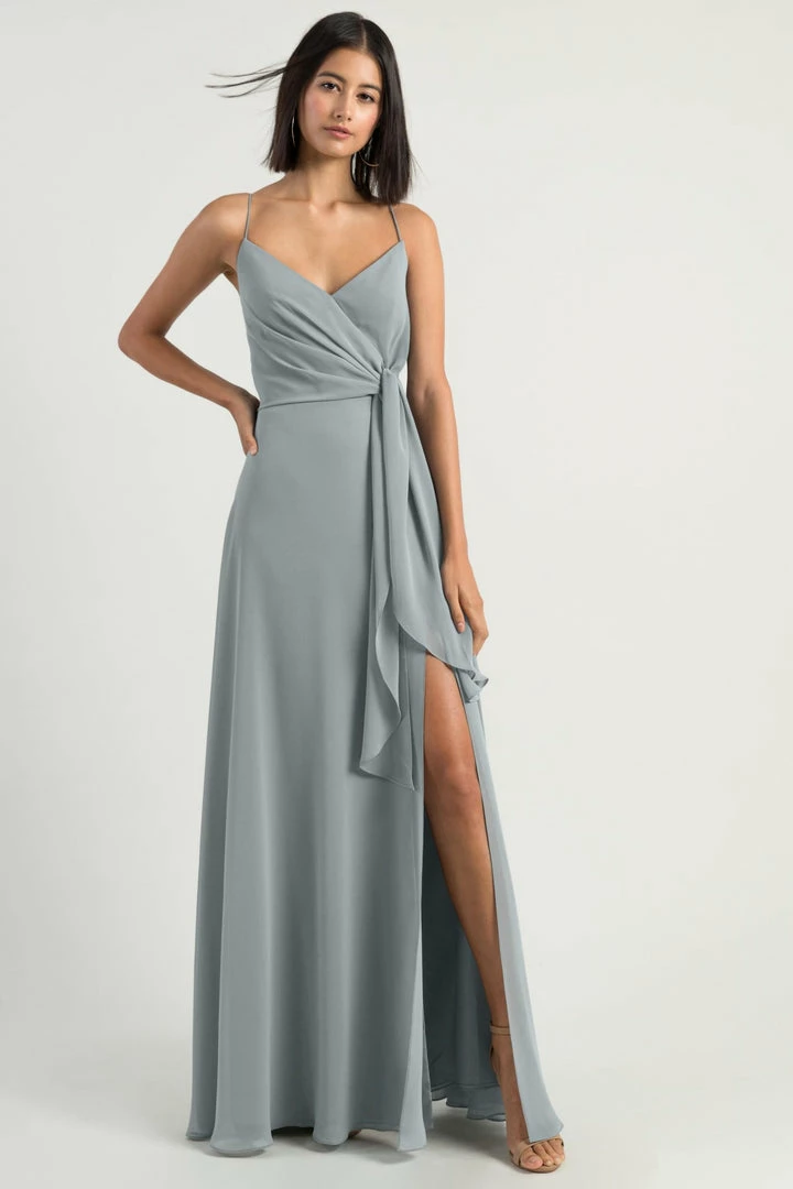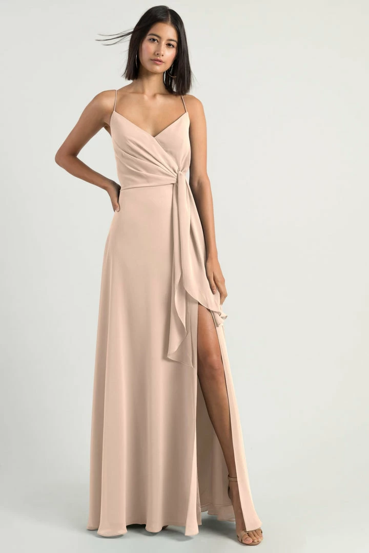 The Amara dress has a sophisticated A-line silhouette with a chic spaghetti strap V neck in our flowy Luxe Chiffon. The romantic blouson surplice bodice is accented with modern tie detail at the natural waist that drapes down to the long skirt and playful slit. This bridesmaid dress is fully lined with a center back zipper.