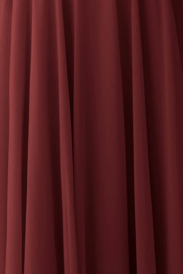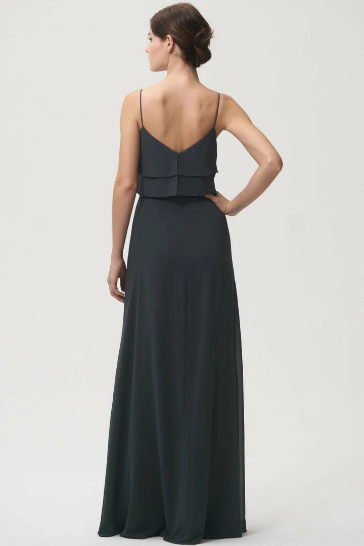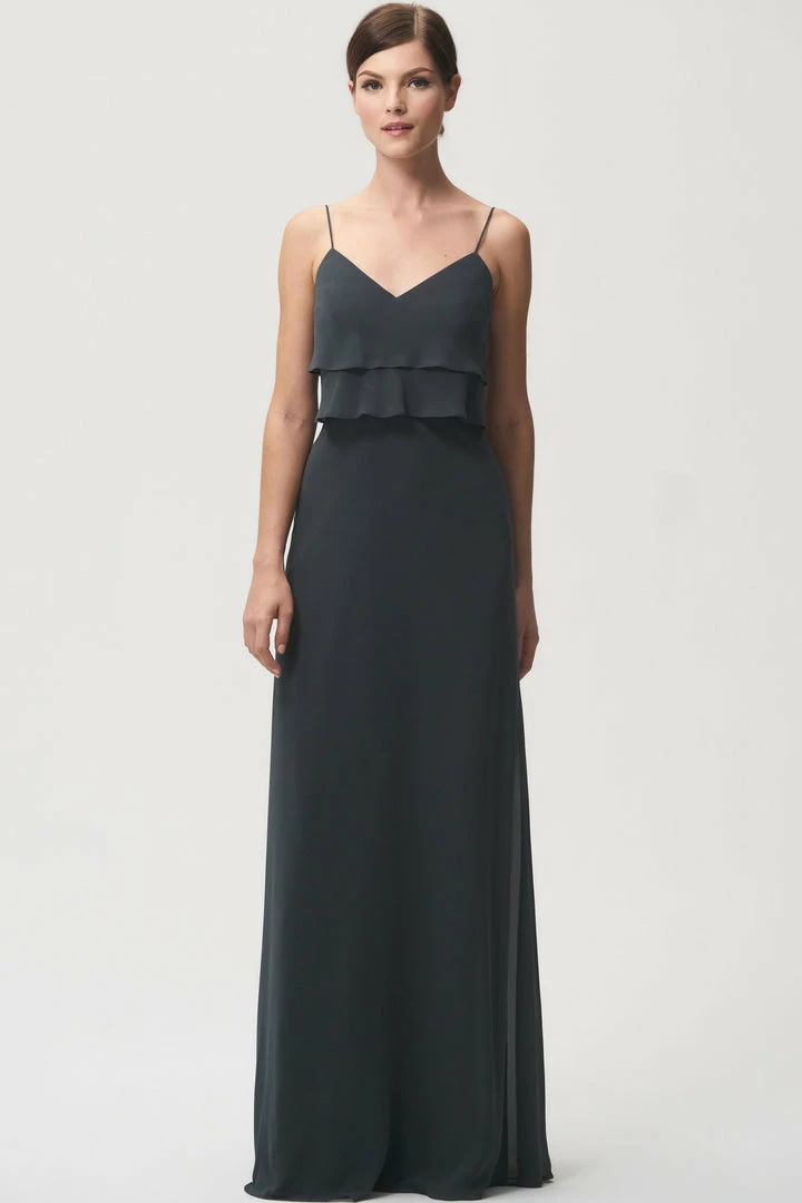 The Como dress has a classic A-line silhouette with a dainty spaghetti-strap V neckline in our flowy Luxe Chiffon. Delicate feminine ruffles flow from the neckline to the defined waist, while the long skirt slims the hips. This bridesmaid dress is fully lined with an invisible center back zipper.