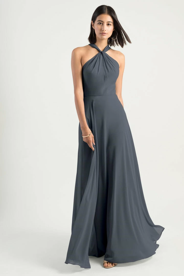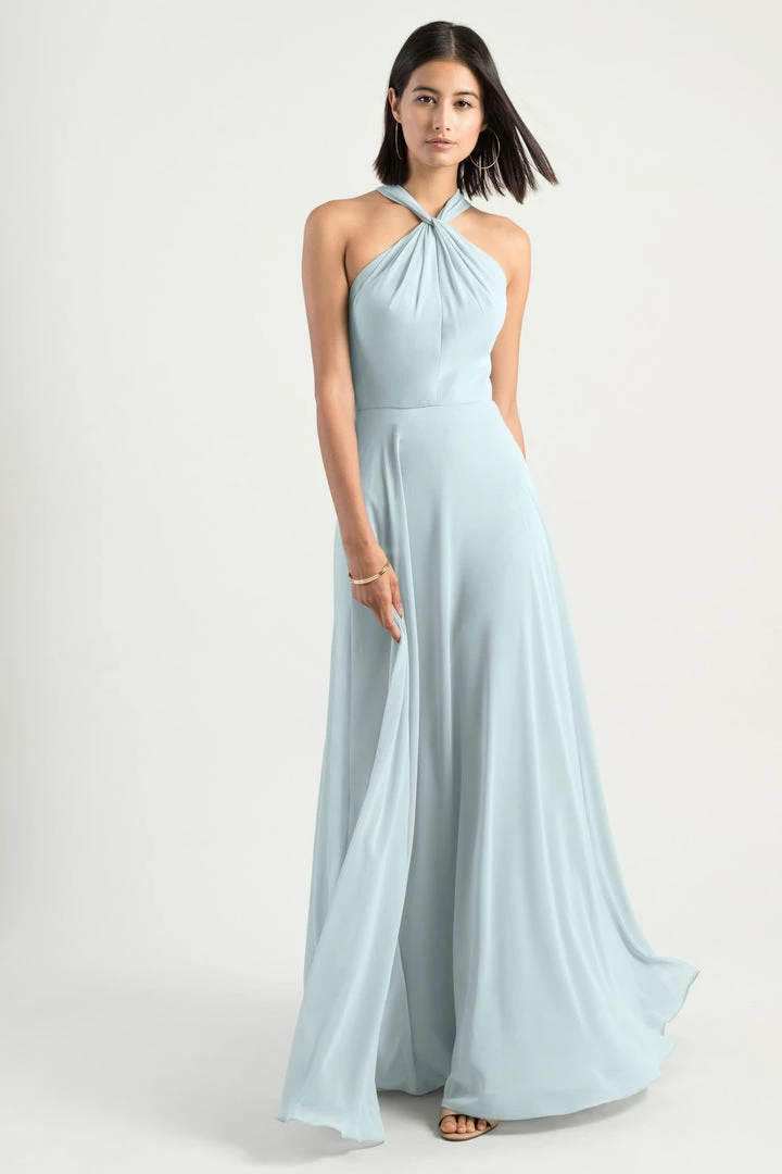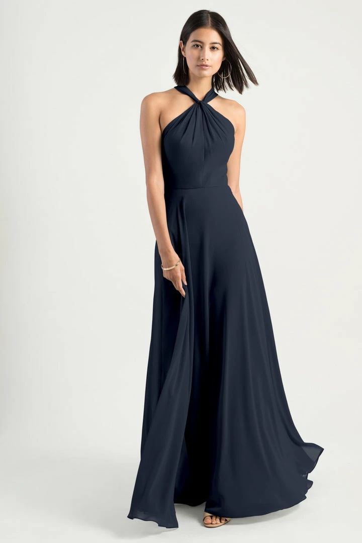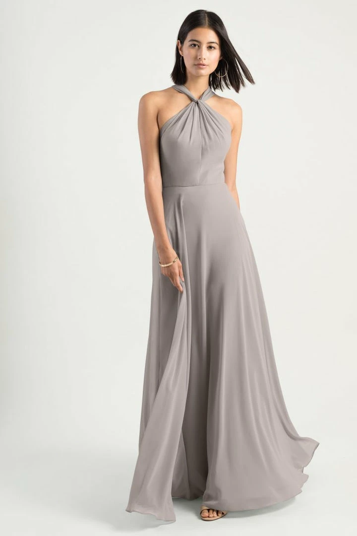 The Halle dress has a romantic A-line silhouette with a modern cross front halter neckline in our flowy Luxe Chiffon. The chic high neck is complemented by the unique twist back detail secured with buttons (not pictured.) This dress is also has a sweeping long circle skirt. This bridesmaid dress is fully lined with an invisible center back zipper.