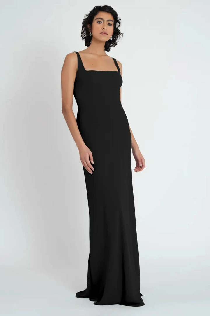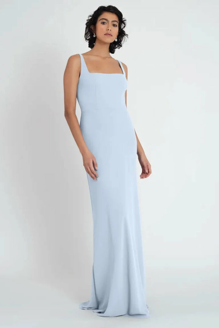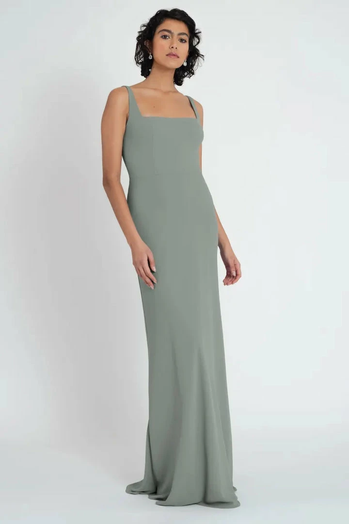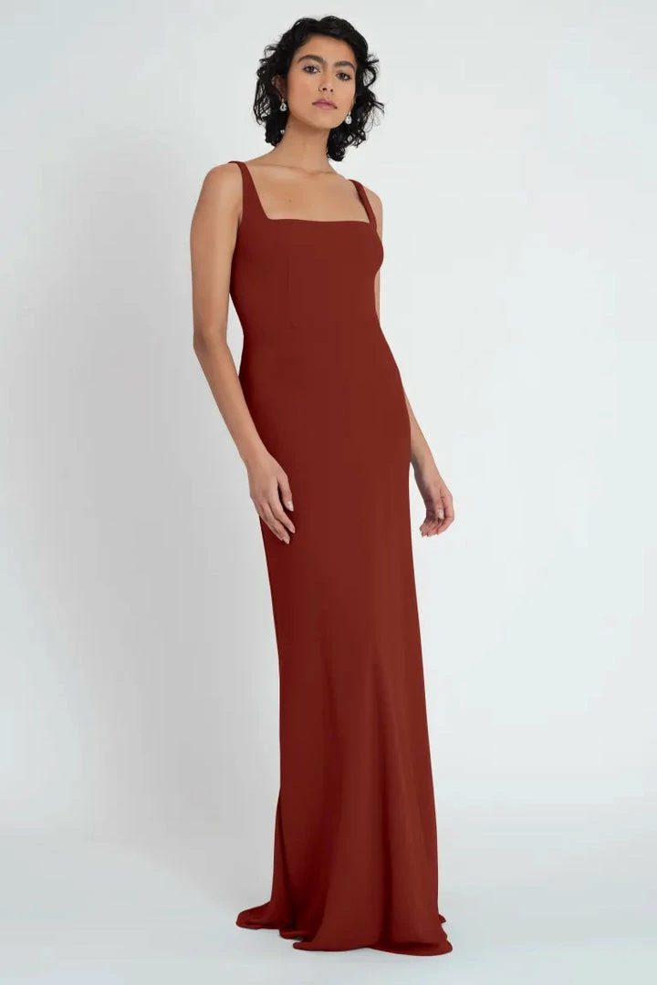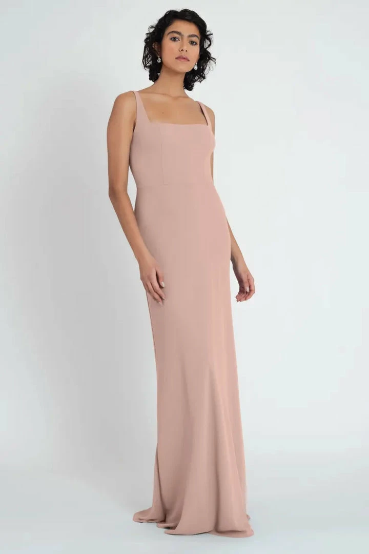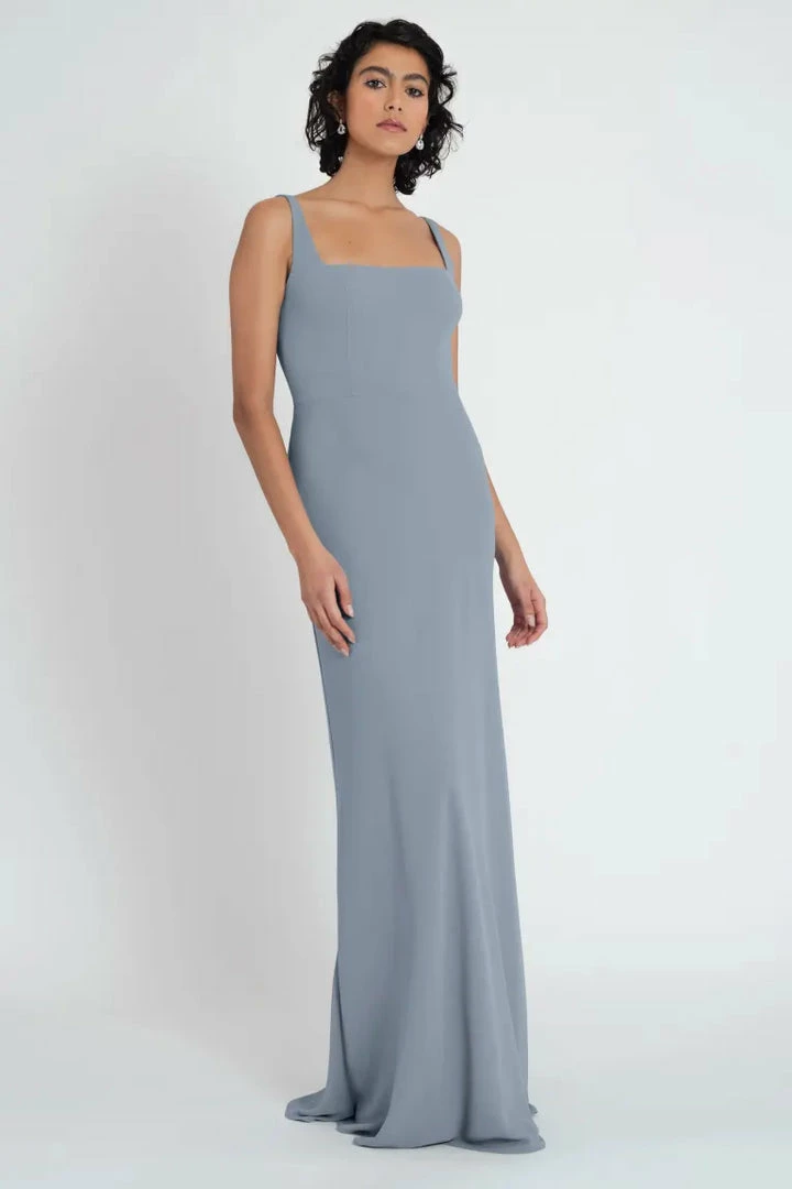 The Maeve square neck bridesmaid dress in our new pebbled crepe fabric would make a stunningly chic addition to any bridal party. Wide set straps frame a flattering square neckline and the sleek bias cut skirt skims your curves beautifully.