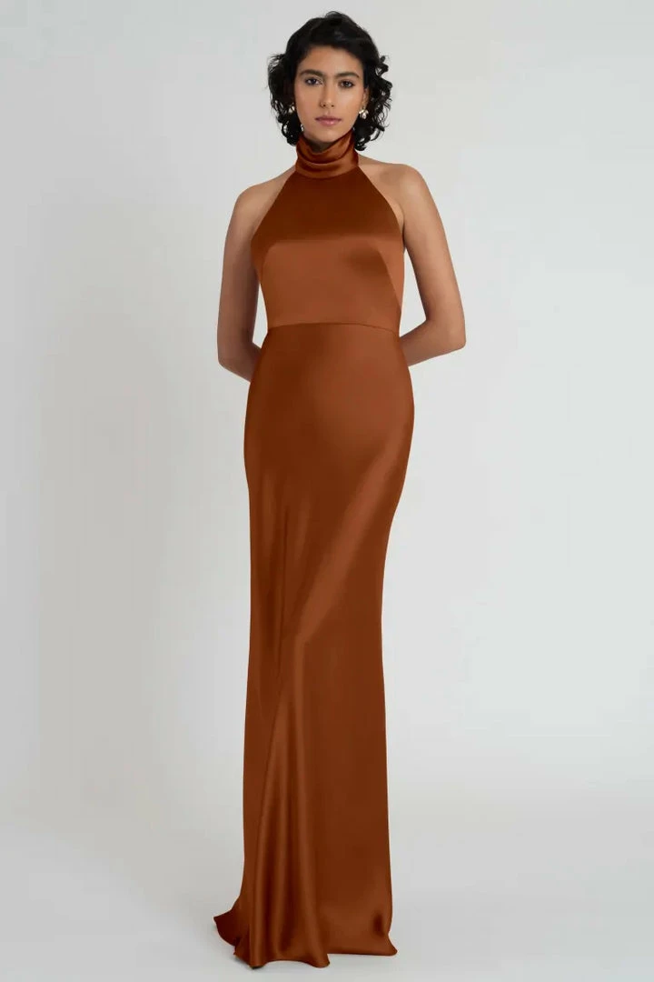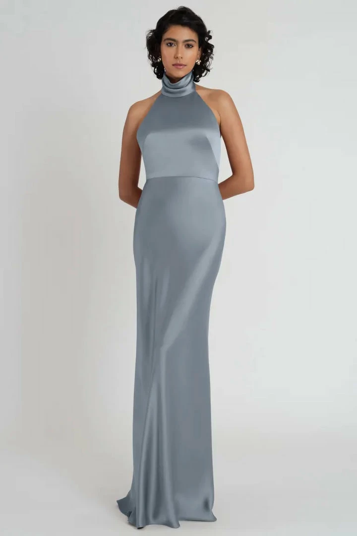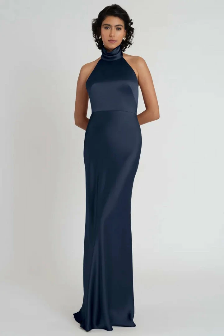 The Nicole satin halter dress is a stunning choice for any event. Featuring a beautifully draped mock neckline and a slinky bias cut skirt, sheβs as timeless as she is modern.