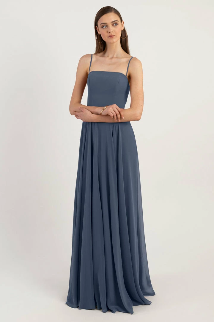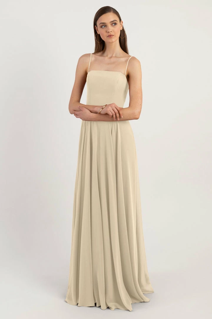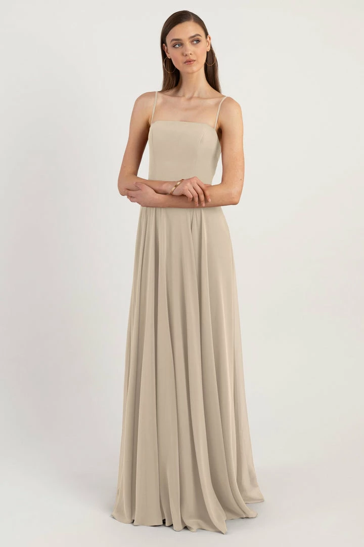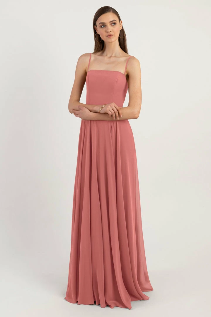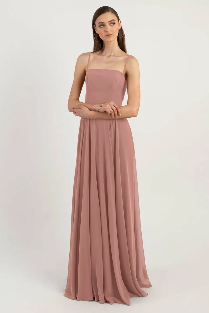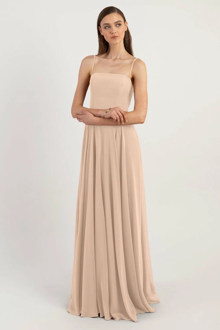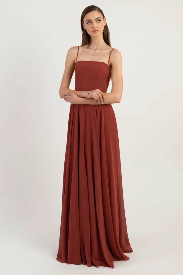 The Renee dress is a modern take on the romantic A-line silhouette with a chic straight across neckline and flat spaghetti straps in our lightweight Luxe Chiffon. The fitted bodice cinches the waist and complements the easy fit of the long flowy circle skirt. This bridesmaids dress is fully lined with a center back invisible zipper.