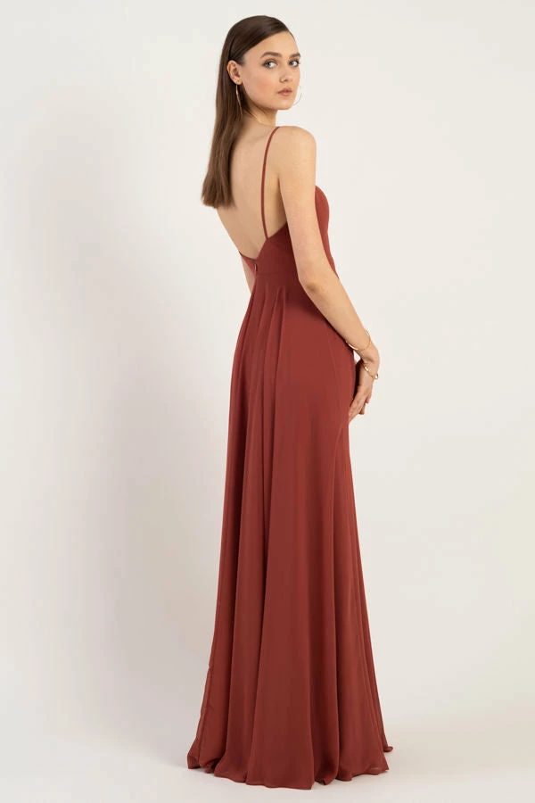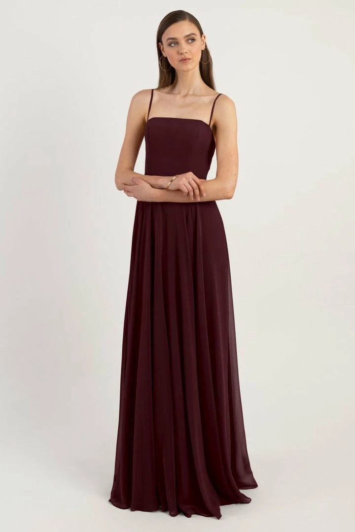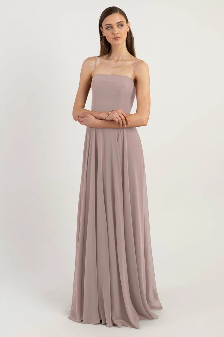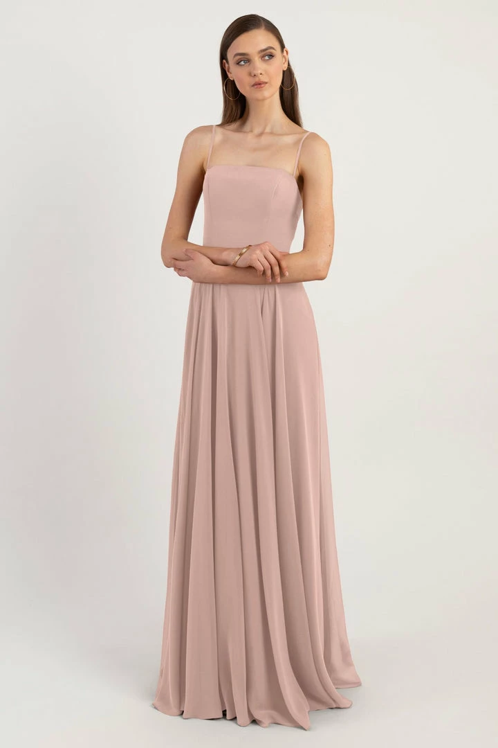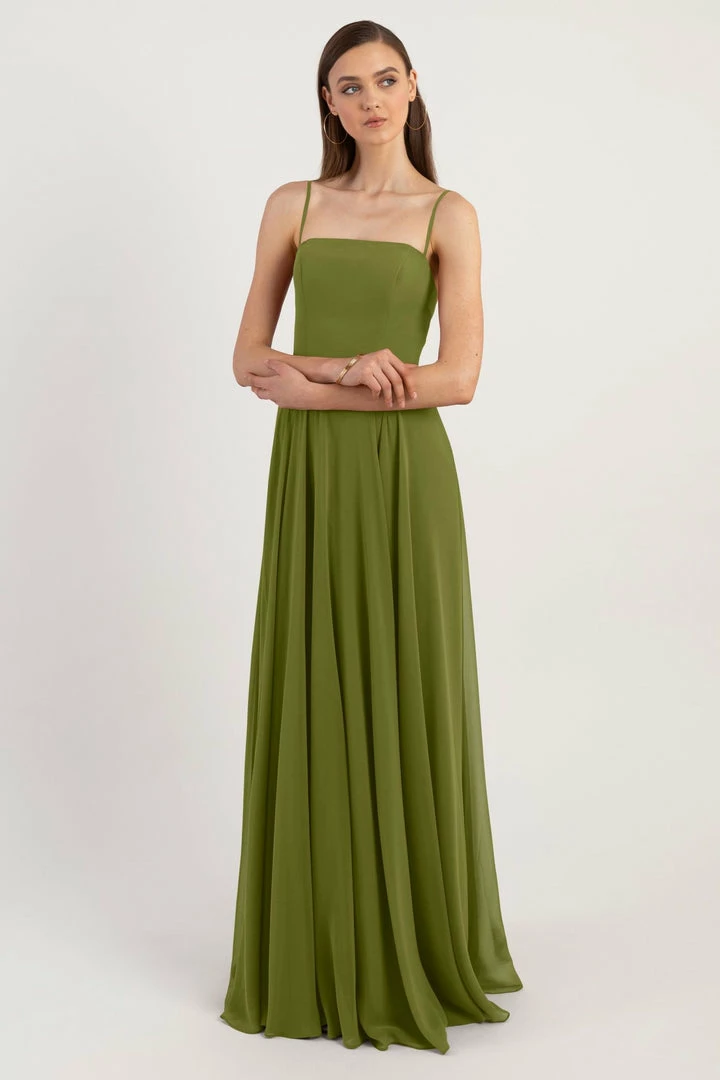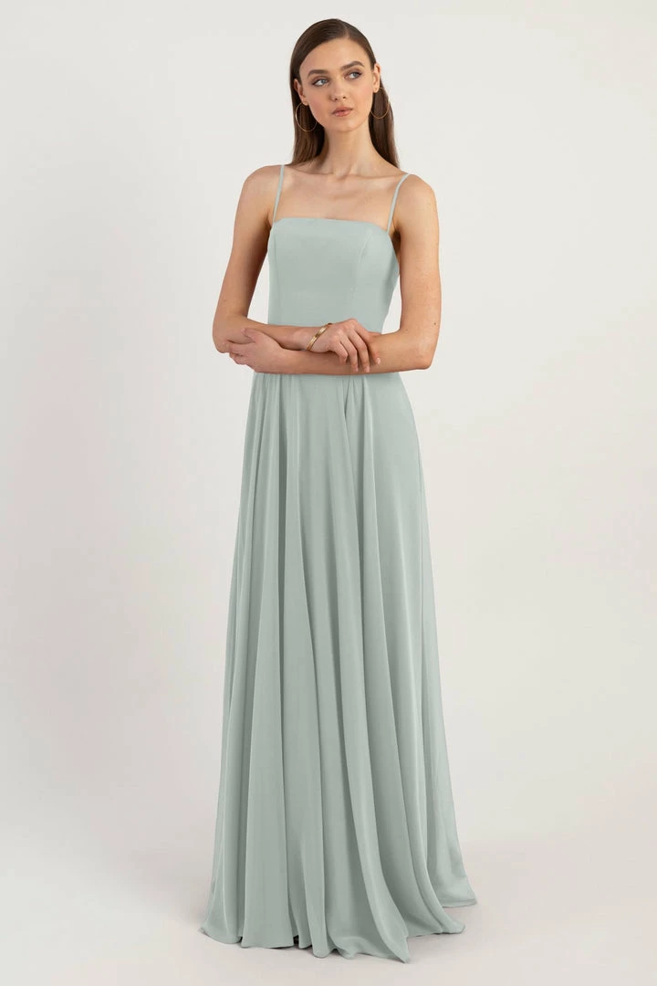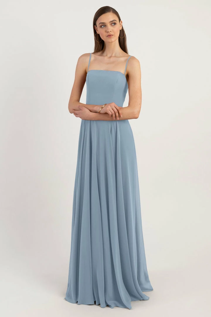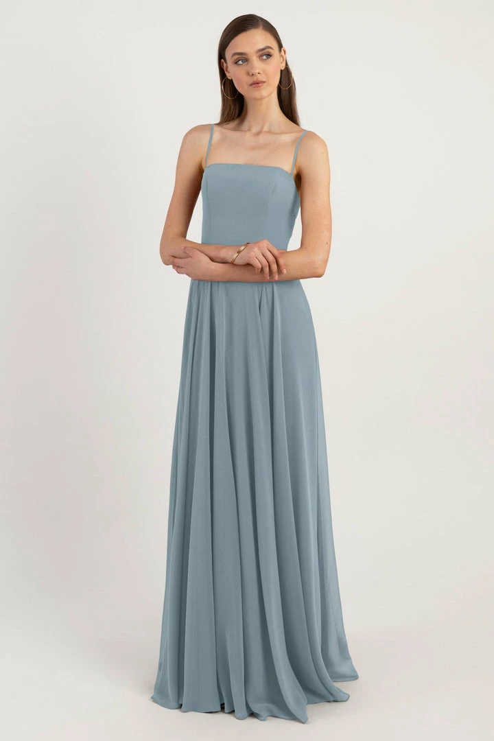 The Renee dress is a modern take on the romantic A-line silhouette with a chic straight across neckline and flat spaghetti straps in our lightweight Luxe Chiffon. The fitted bodice cinches the waist and complements the easy fit of the long flowy circle skirt. This bridesmaids dress is fully lined with a center back invisible zipper.