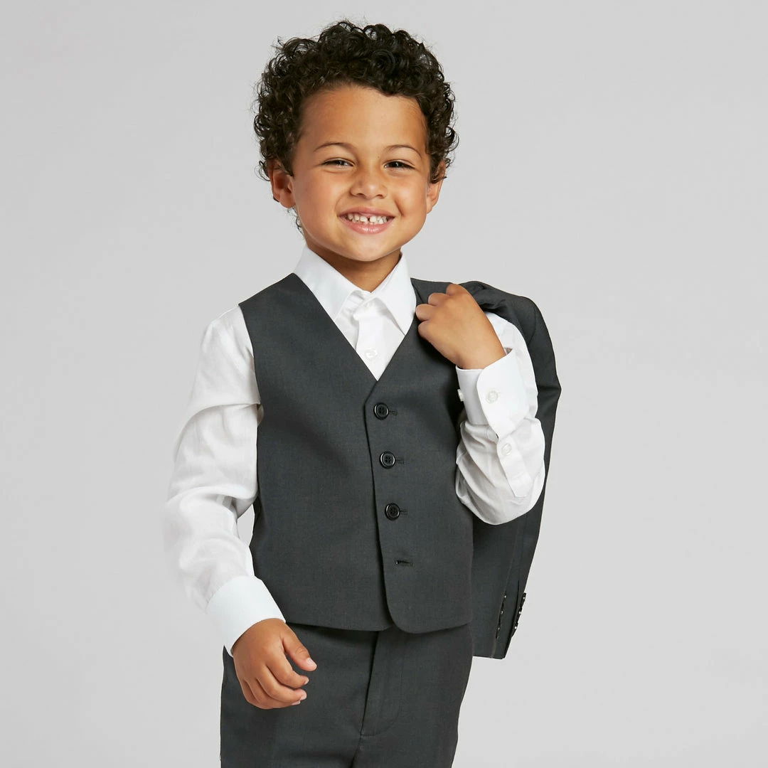 This dapper kids’ dark grey suit is an ideal choice for ring bearers and junior groomsmen alike. Style this little suit with black or brown shoes and a bow tie or necktie, depending on your preference. Our kids’ dark grey suit is available in toddler and youth suits in sizes 2T to 10.