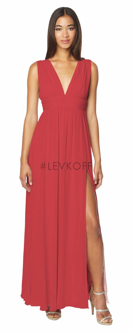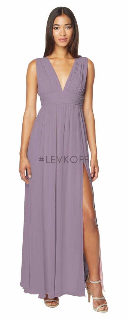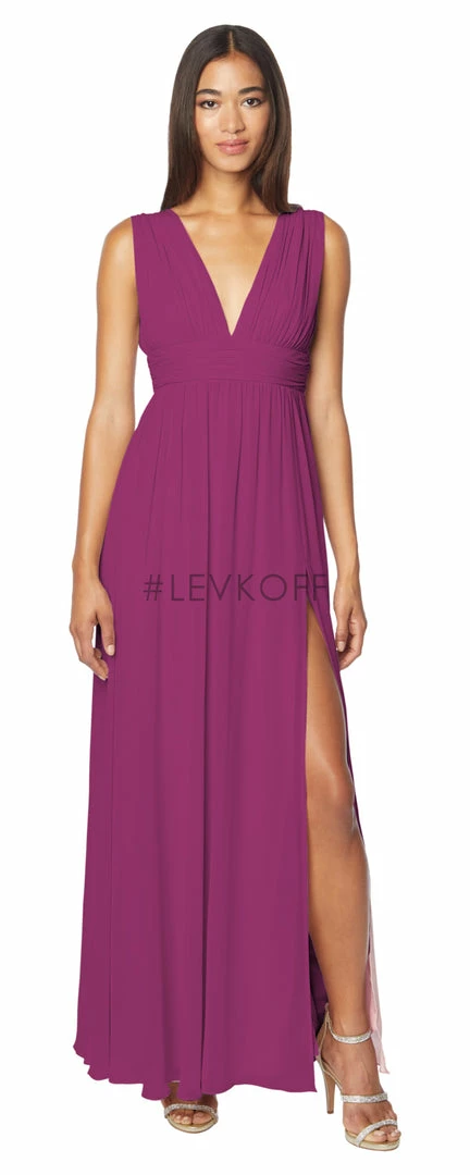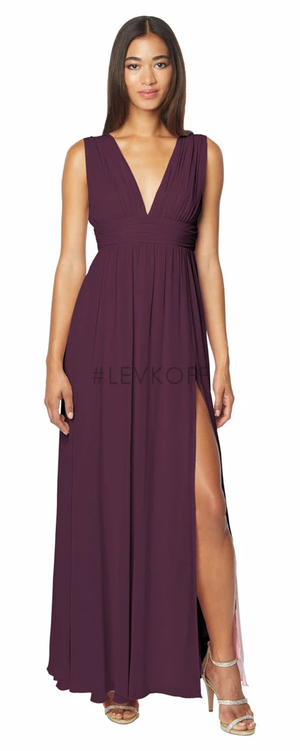 - Soft gathers surround the A-line skirt with an off-center front slit.