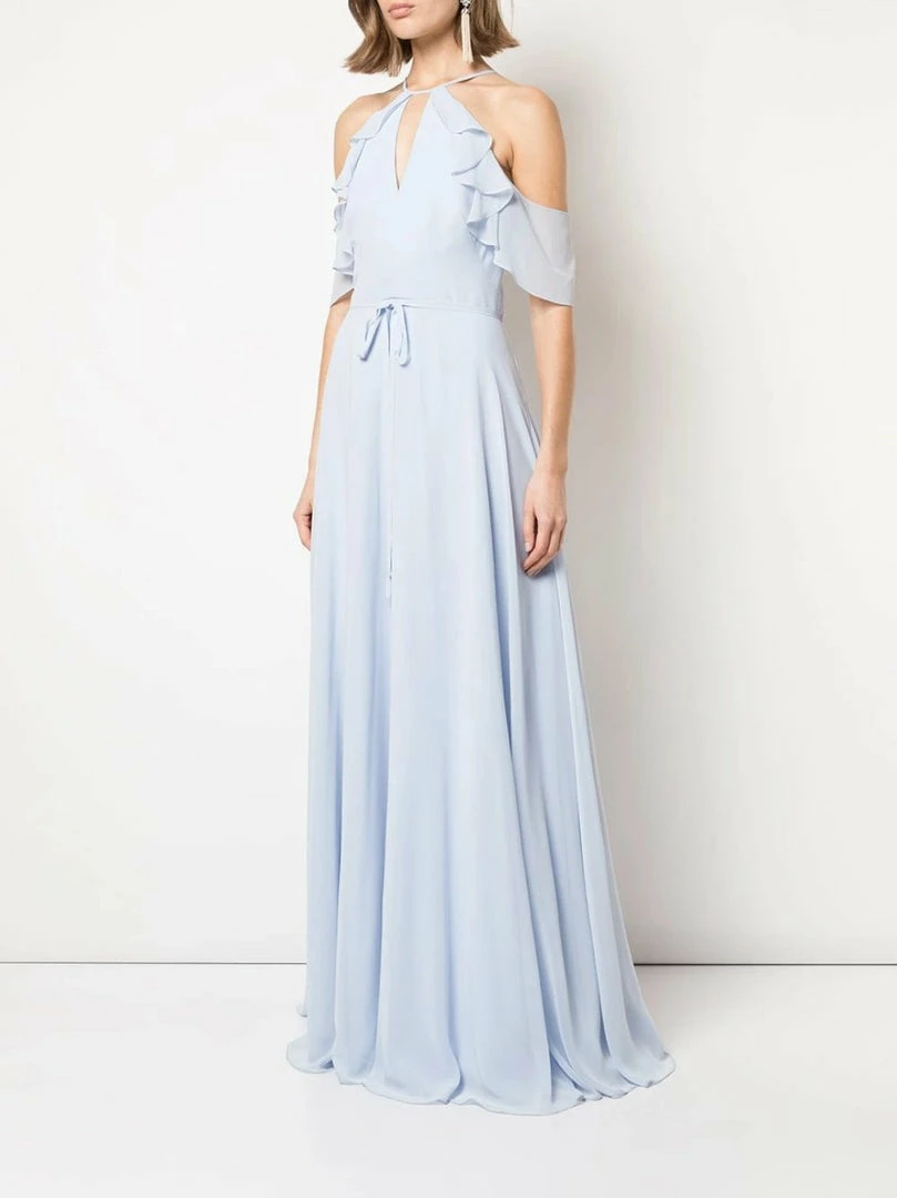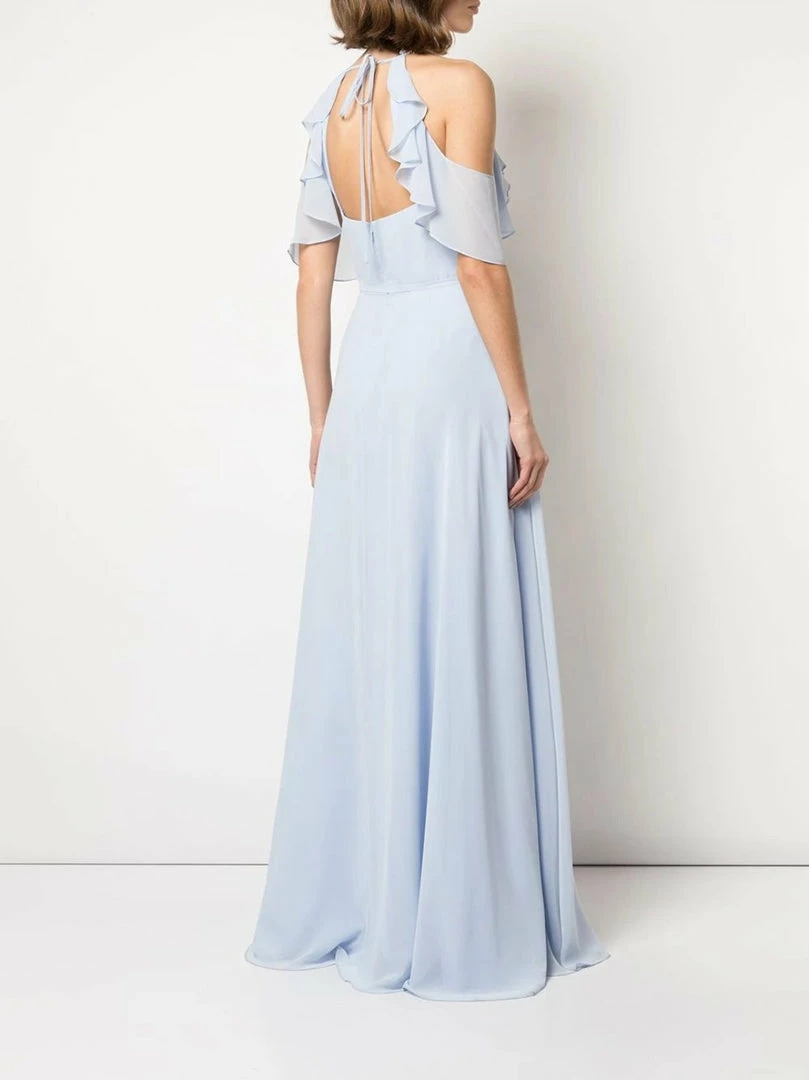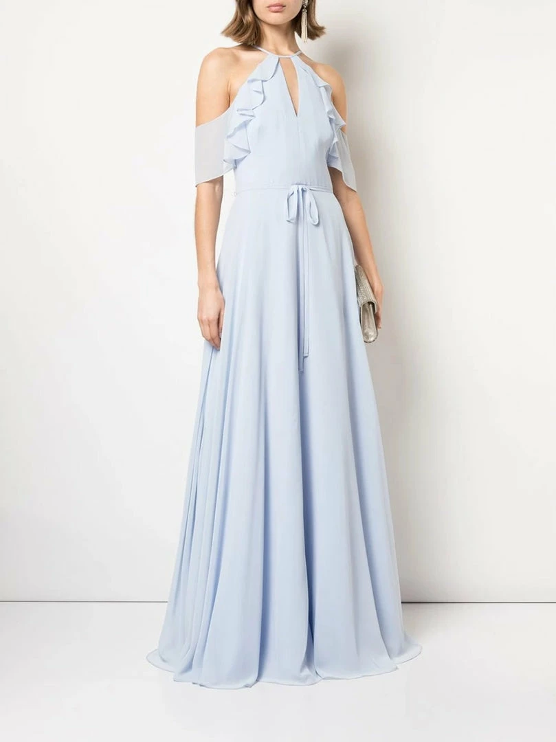 Cold-shoulder chiffon gown in ice blue featuring a halter neck, a tie waist, a ruffle trimming, a long length, and dropped short sleeves. The ruffle can be worn as off the shoulder or underarm.