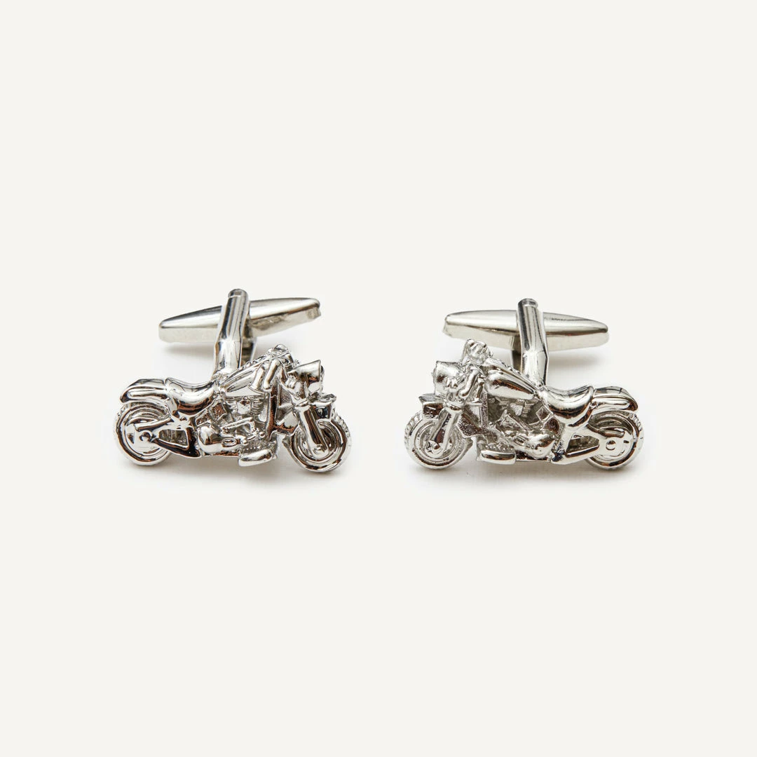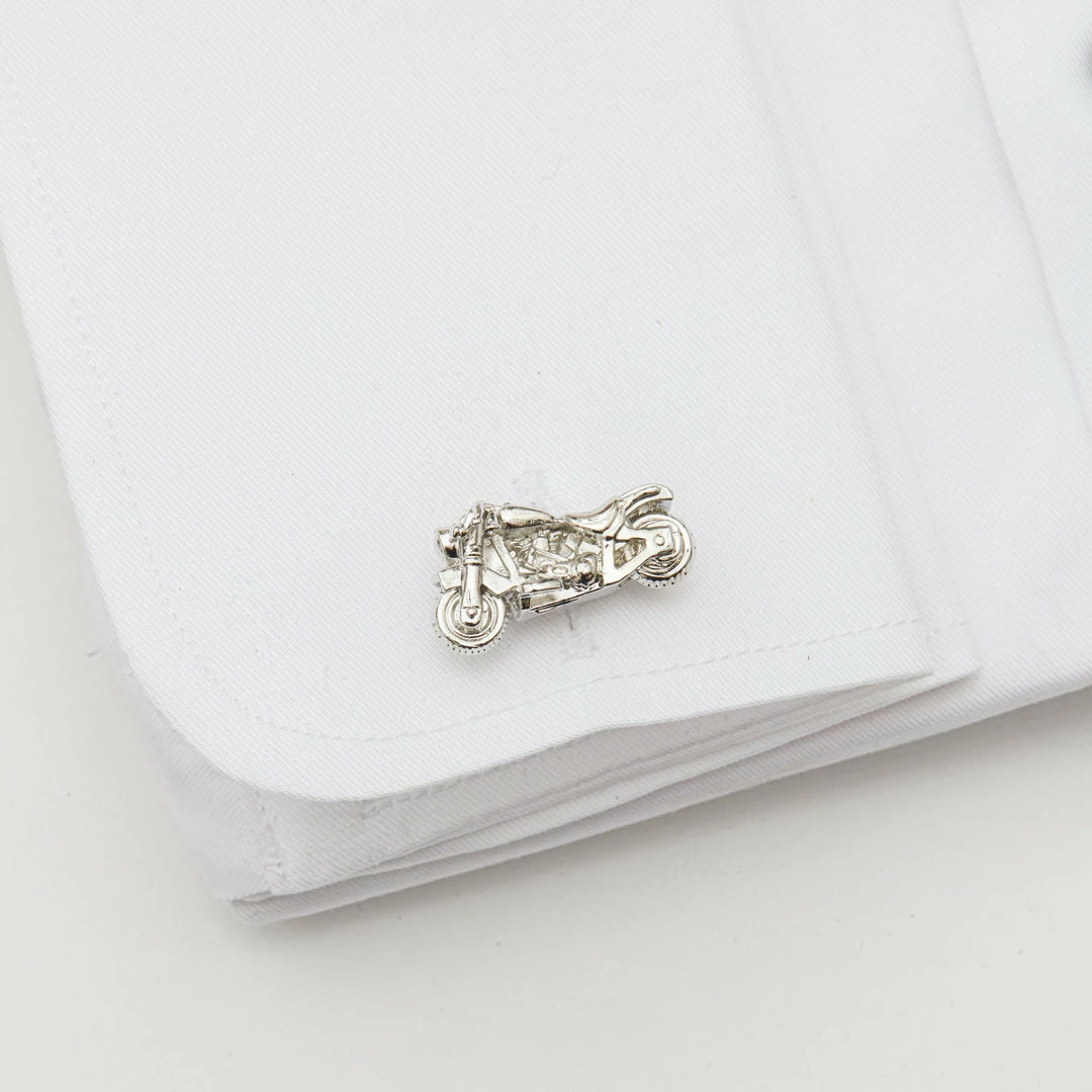 These silver motorcycle cuff links are a fun eye catching statement for any wardrobe. An accessory like this matches with almost anything, making it perfect for the work day or try dressing it up for weddings and special occasions.