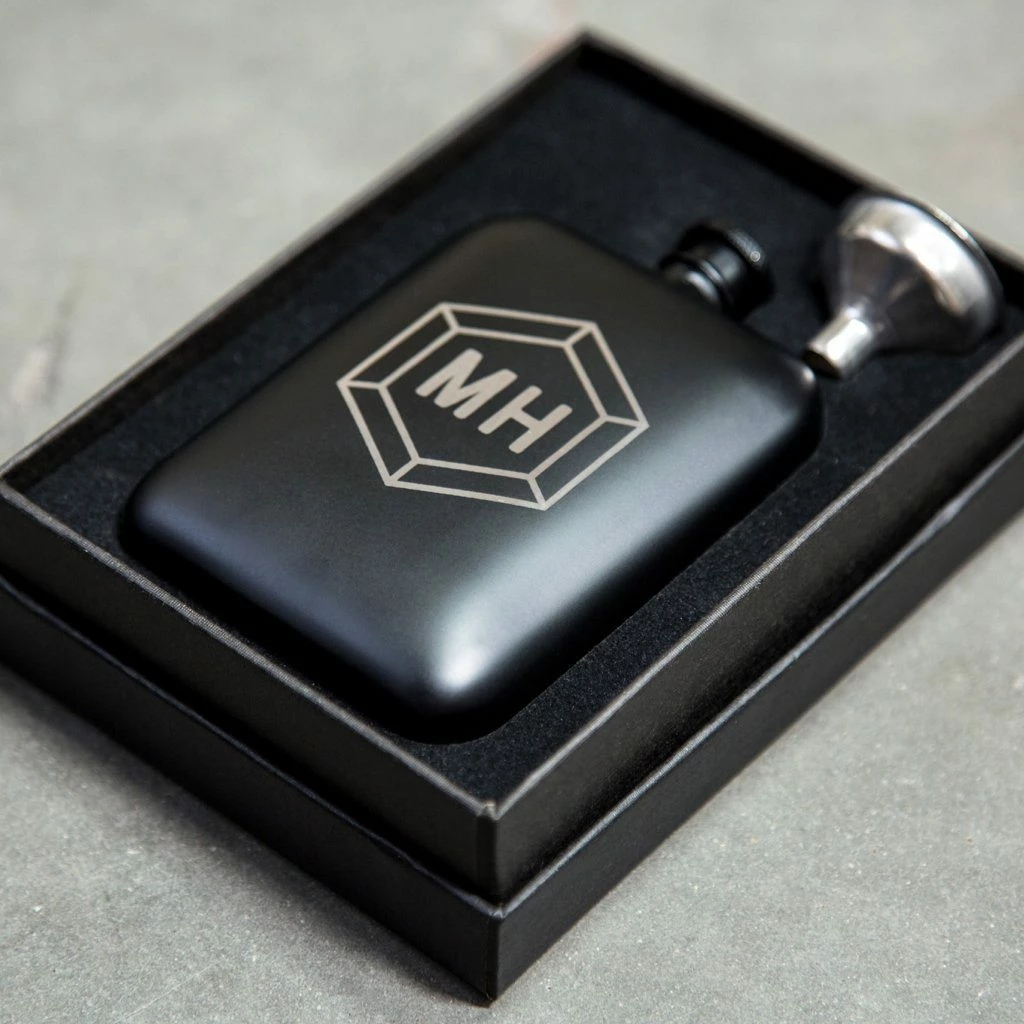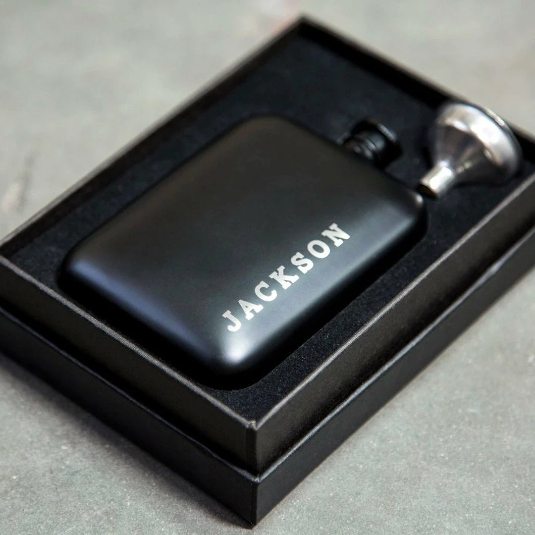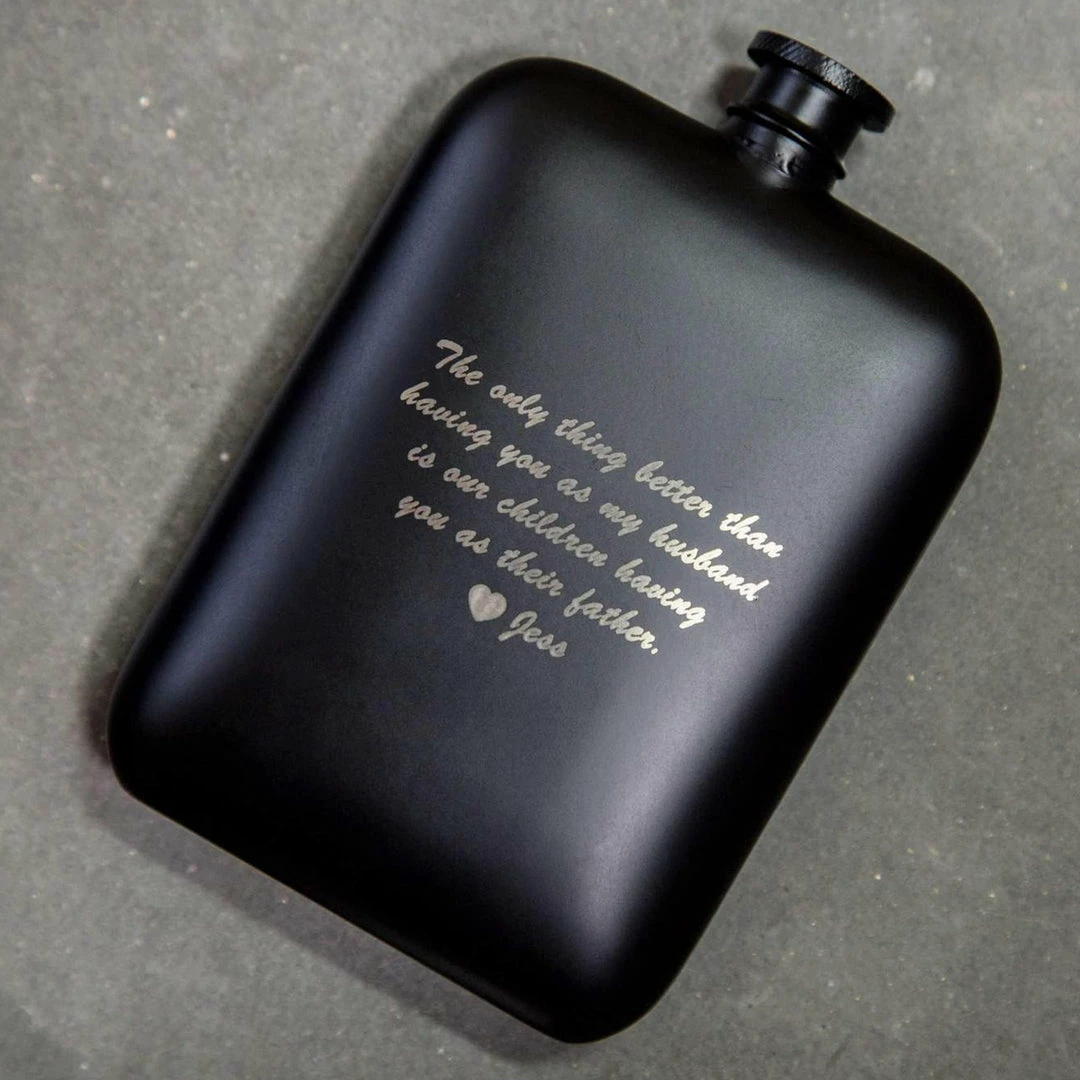 Add a name or initials to the front of this beautiful, personalized hip flask, and up to 30 words of a message on the back. The matte black exterior with stainless steel contrast gives an amazing finish and makes for a great groom or groomsman gift.