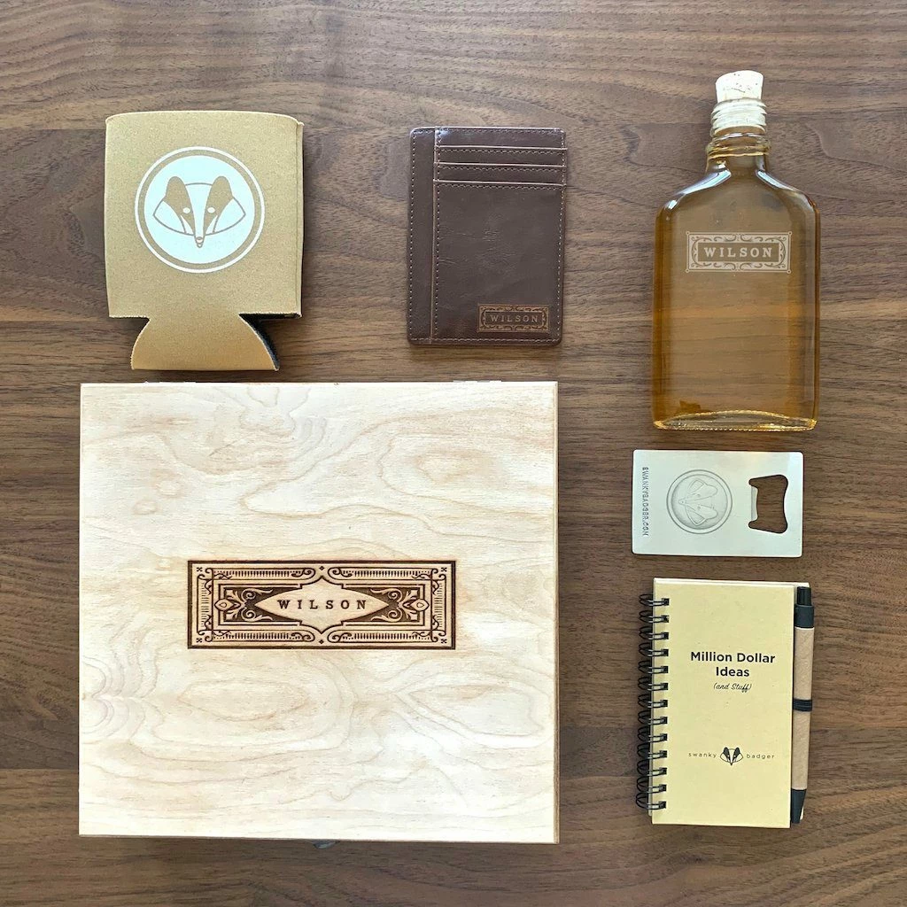 This unique gift set includes our personalized birch plywood cigar box, personalized 7oz matte black stainless steel hip flask, stainless steel flask funnel, personalized split leather front pocket wallet containing 6 card slots, cash pocket with ID sleeve on the back, 40-page notebook and pen, and a stainless steel credit card bottle opener.