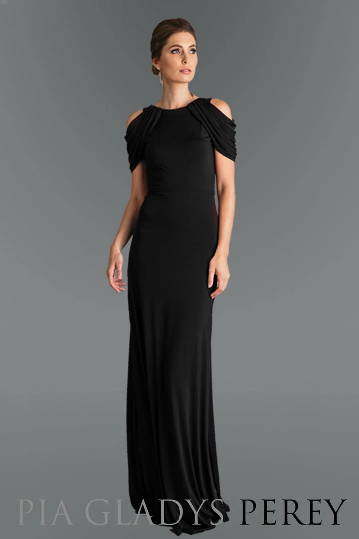 Nola has style in spades. She’s rich and regal with her peekaboo sleeves and full skirt with a high slide slit.
