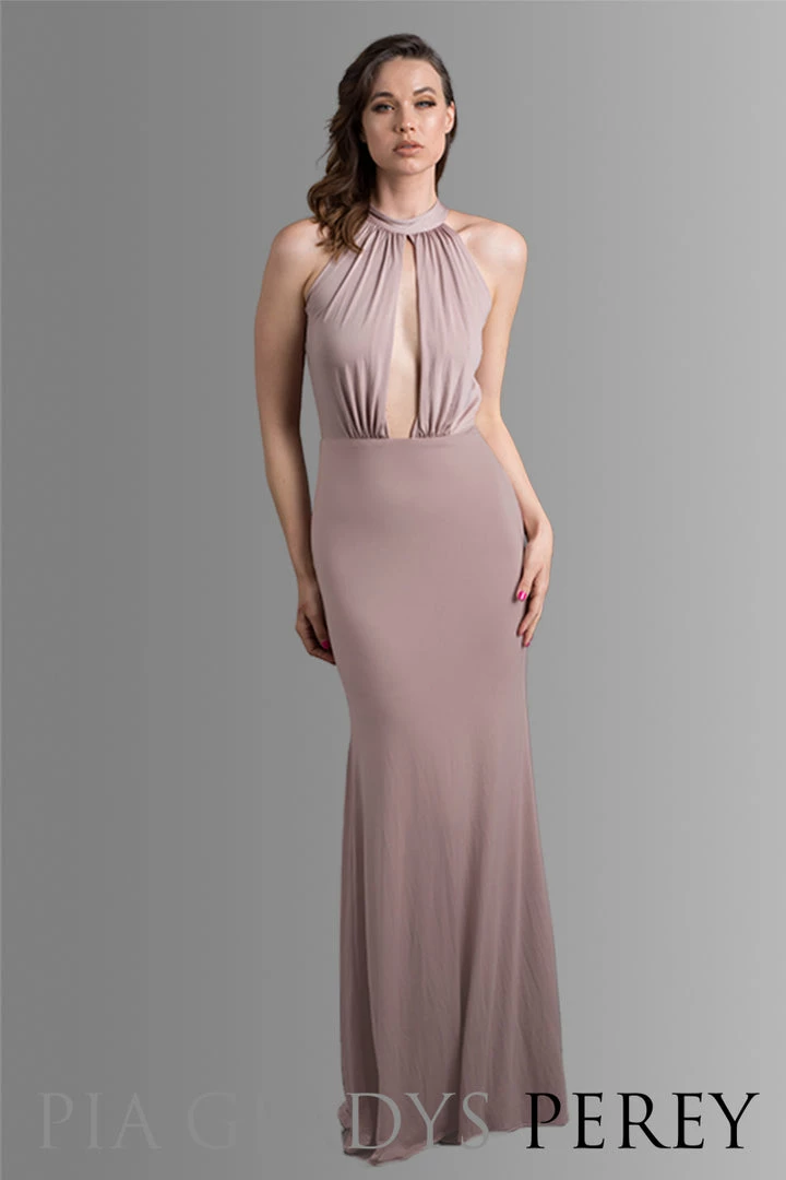 The Portia dress is an elegant show stopper. The key hole detail on the chest commands sexy balanced with a modest high neckline. This dress is fastened by a bow detail at the back and has a slight mermaid cut on the skirt.