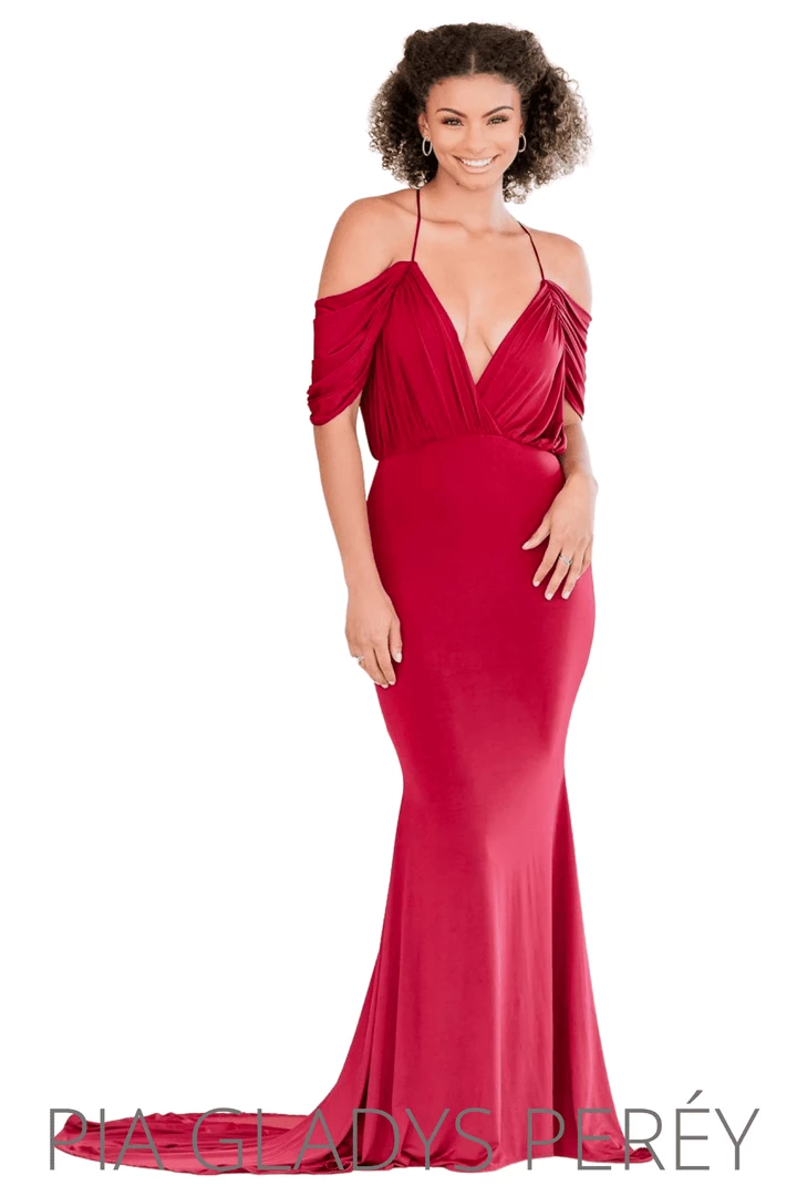 A dramatic piece with deep V-neck and cold shoulder detail, this dress is designed to exude sexy and class. Comes with optional sweep train and can be ordered with slit.