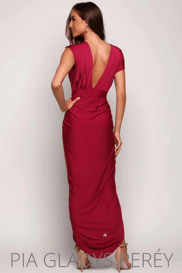 The Carla features a V-shaped neckline, gathered cap sleeves, and a knife pleated wrap around floor-length skirt. Wear it with gold cuffs.