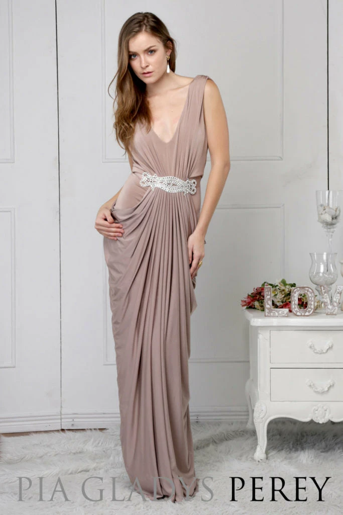 The Helene gown features a wide V-shaped neckline, a high waist, a silver waist embellishment, and a draped bodice, and a column skirt dramatically gathered at the waist. This is the perfect background for statement bracelets or rings!