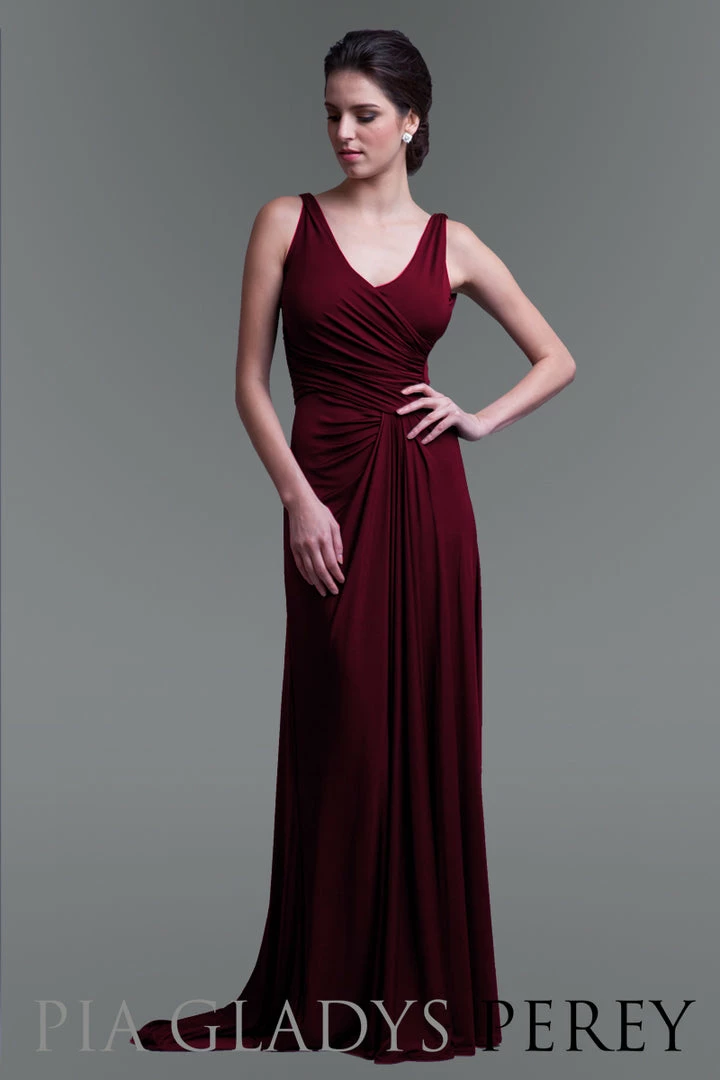 The Krestta features a deep-V neckline, an overlapping draped bodice, a low back, and an a-line skirt gathered at the waist with a slight train. Wear it with a gorgeous blow-out for a red-carpet ready look. Model is wearing Krestta in Navy.