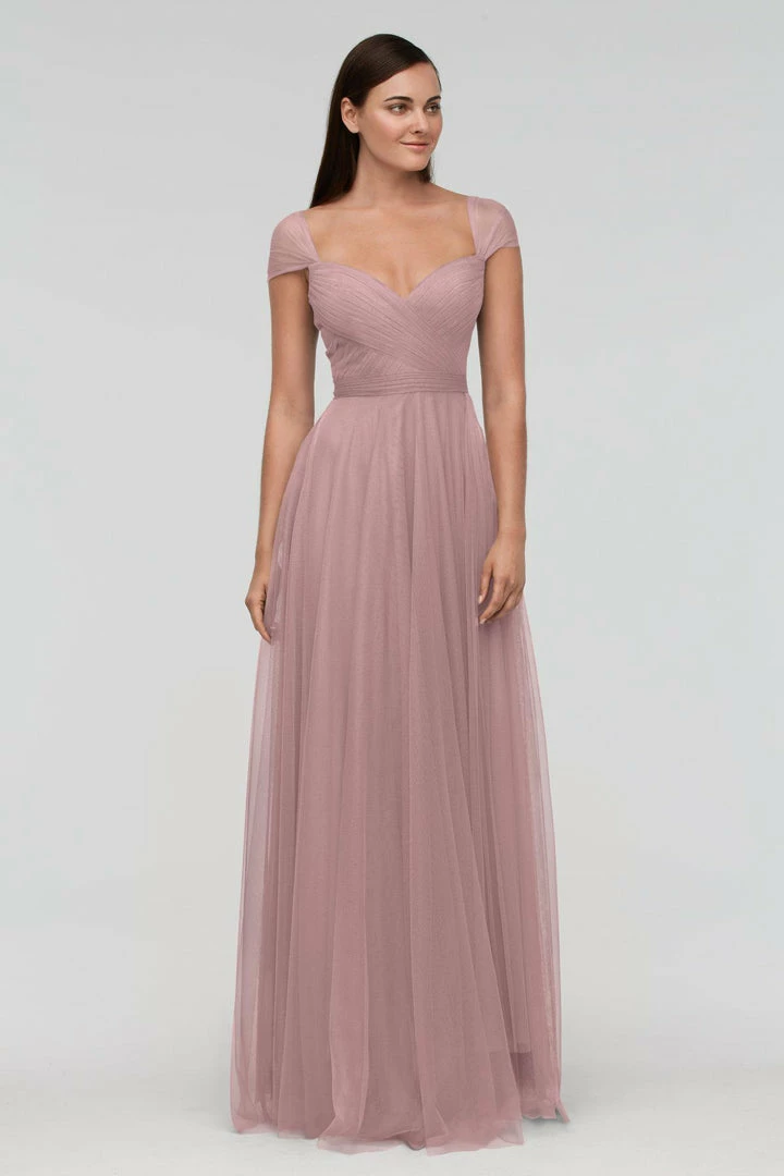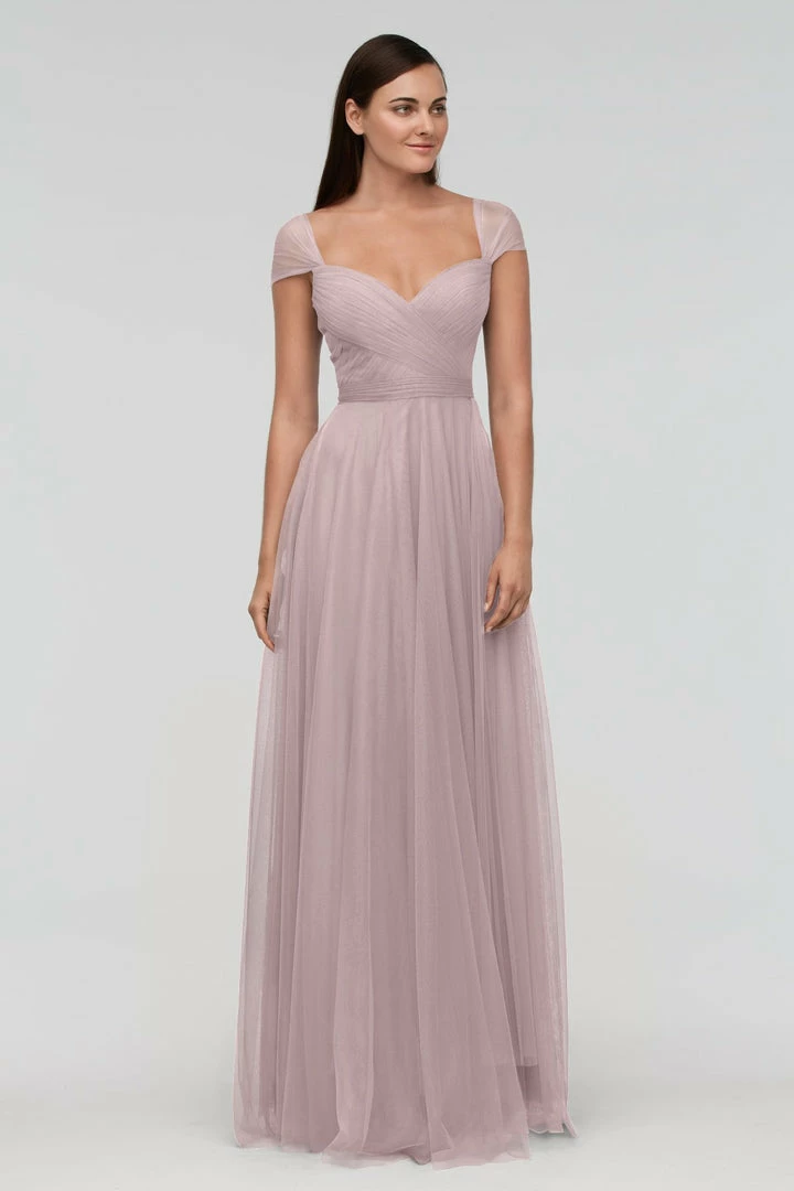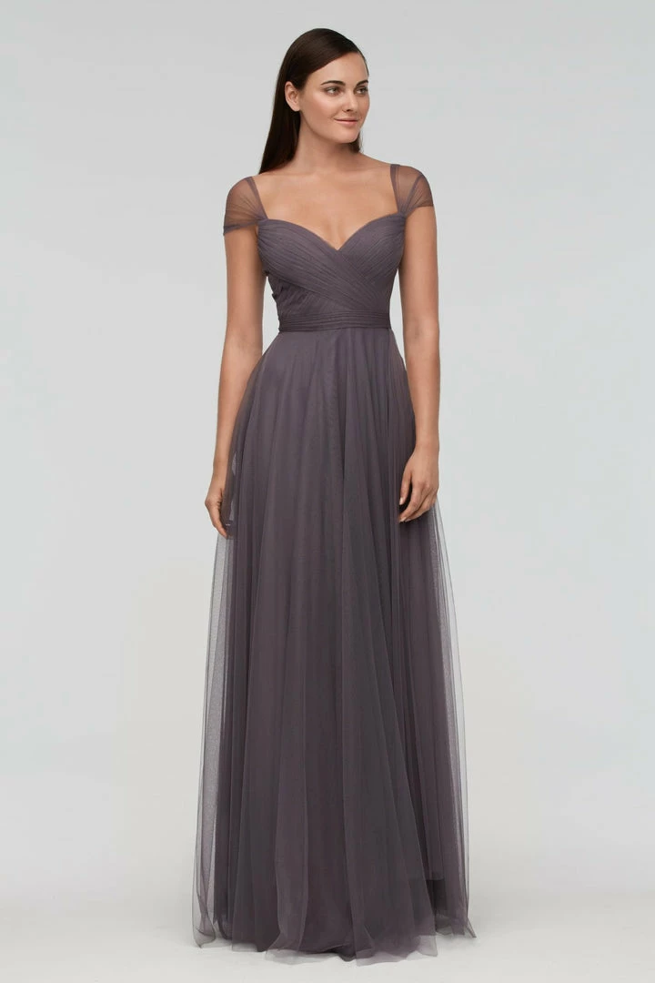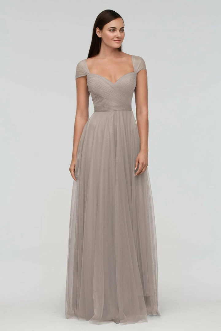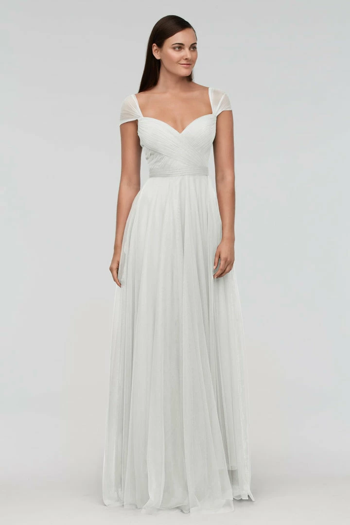 Inspired by the elegance and grace of the ballet, this gown is worthy of a solo. Delicate ballerina cap sleeves paired with a sweetheart neckline frame the collarbone and face beautifully. The crisscross bodice elegantly winds down into a shirred waistband, while an open back provides the perfect contrast to the demure nature of the gown. A long, flowing bobbinet skirt makes this a gown worth dancing in.