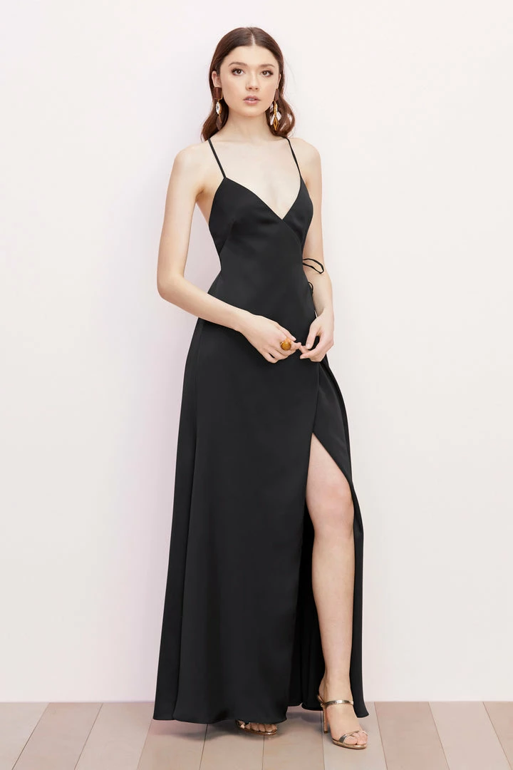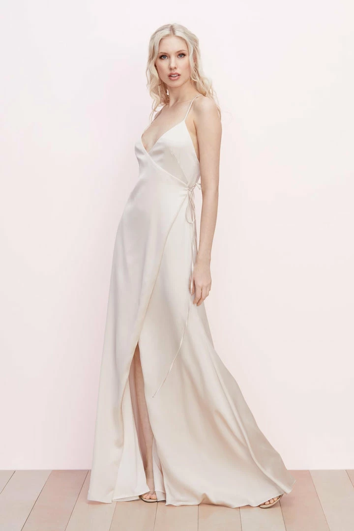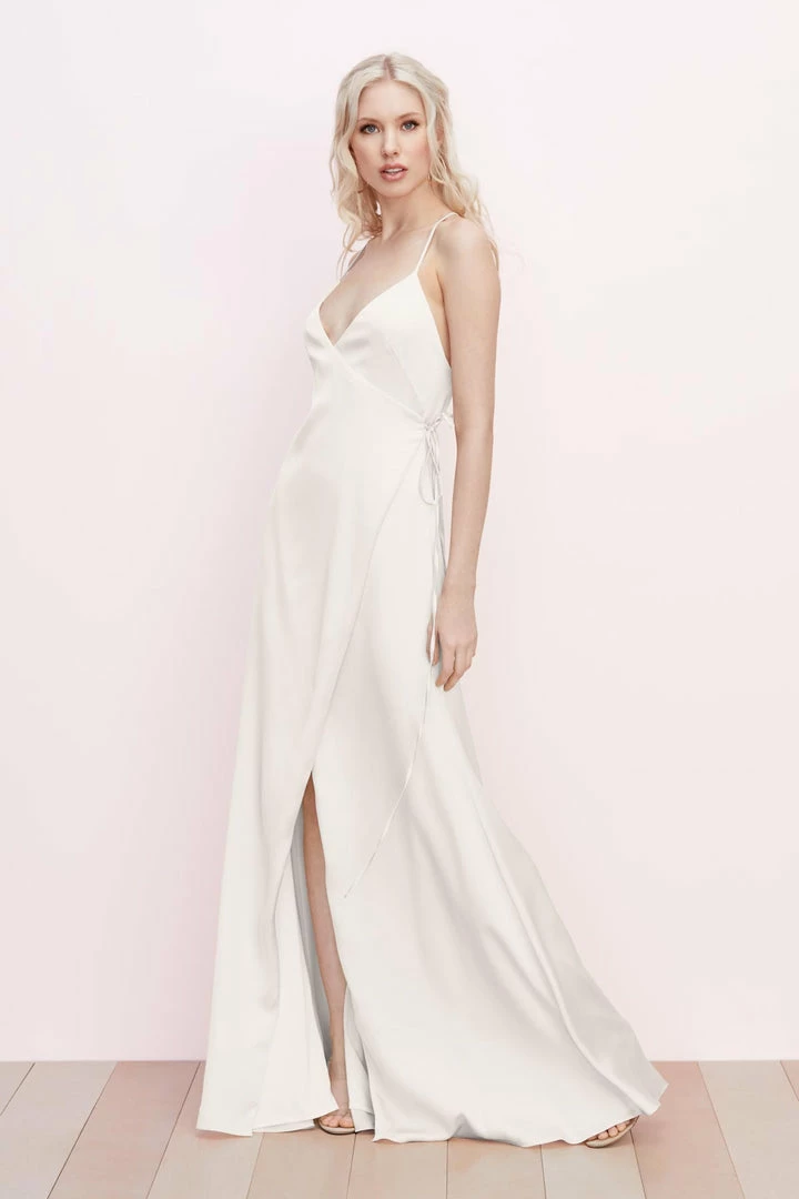Wrapped in the front, crisscrossed in the back, this flirty charmeuse style will be a fave of every member of the wedding party.