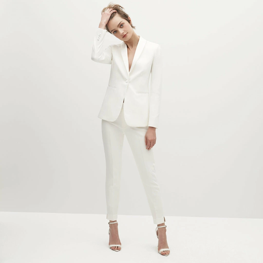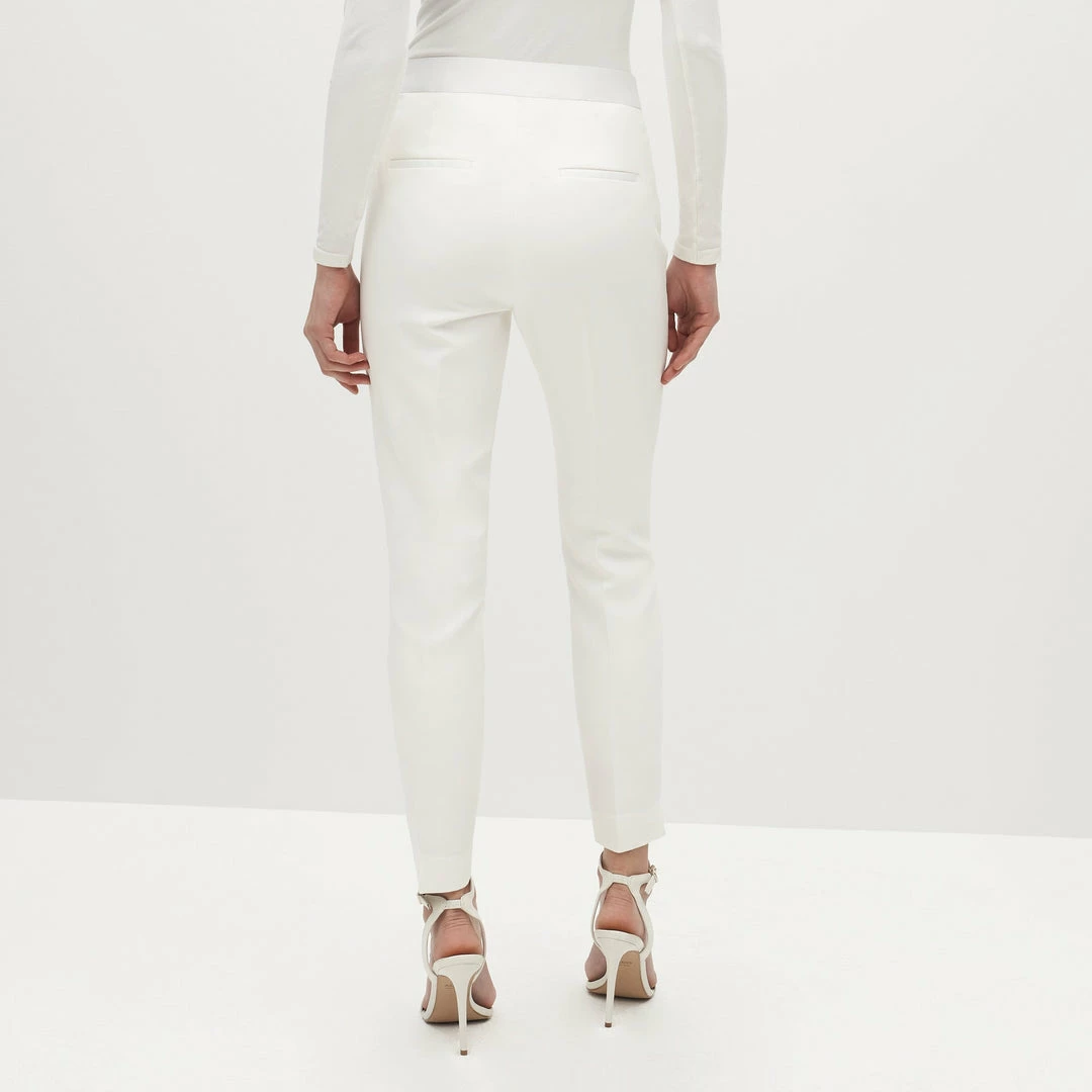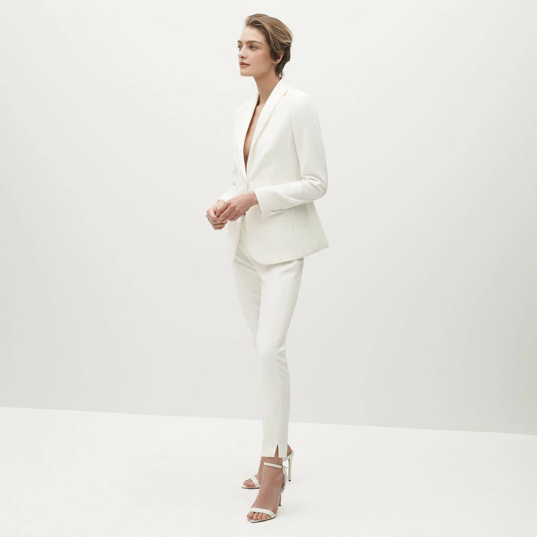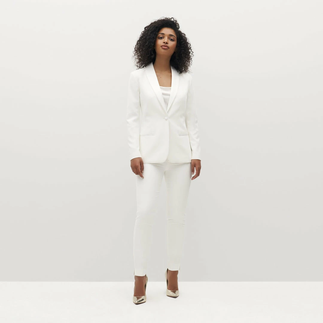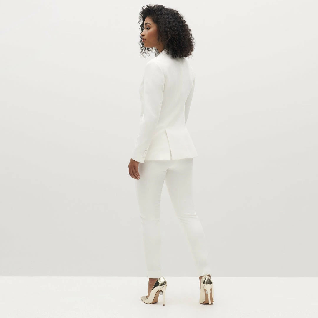 Complete your white tuxedo ensemble with our white tuxedo pants. Beautifully tapered with a little stretch, these white dress pants are flattering on everyone. Finished with a little side slit, a nude heel is the perfect accessory to our women’s white tuxedo pant.