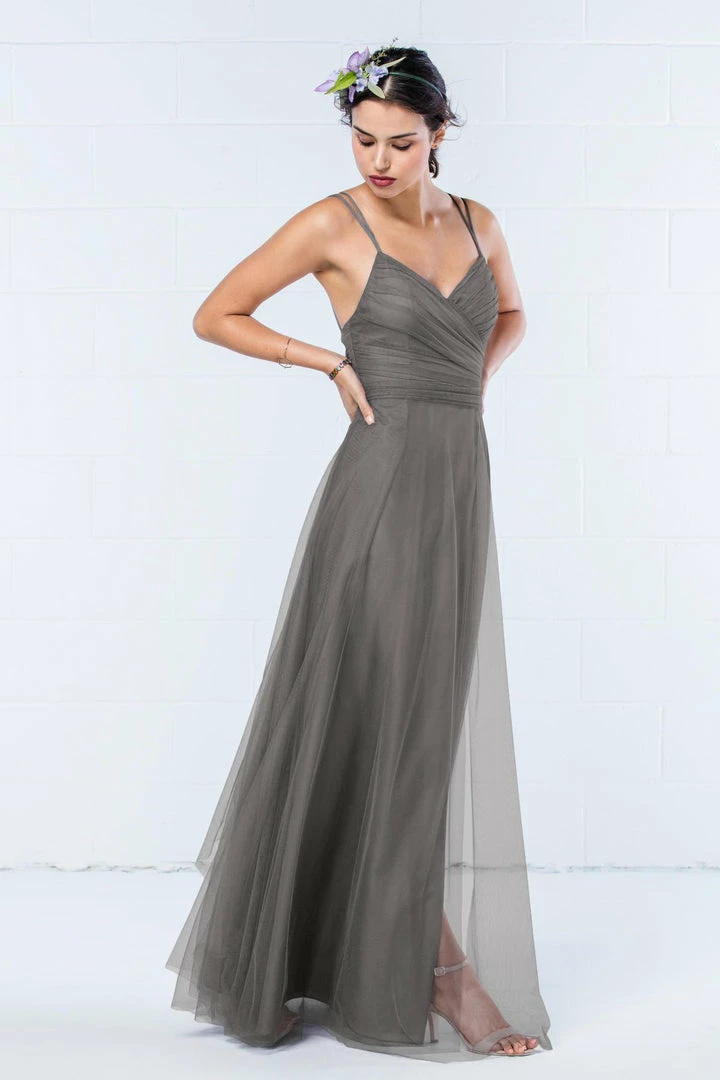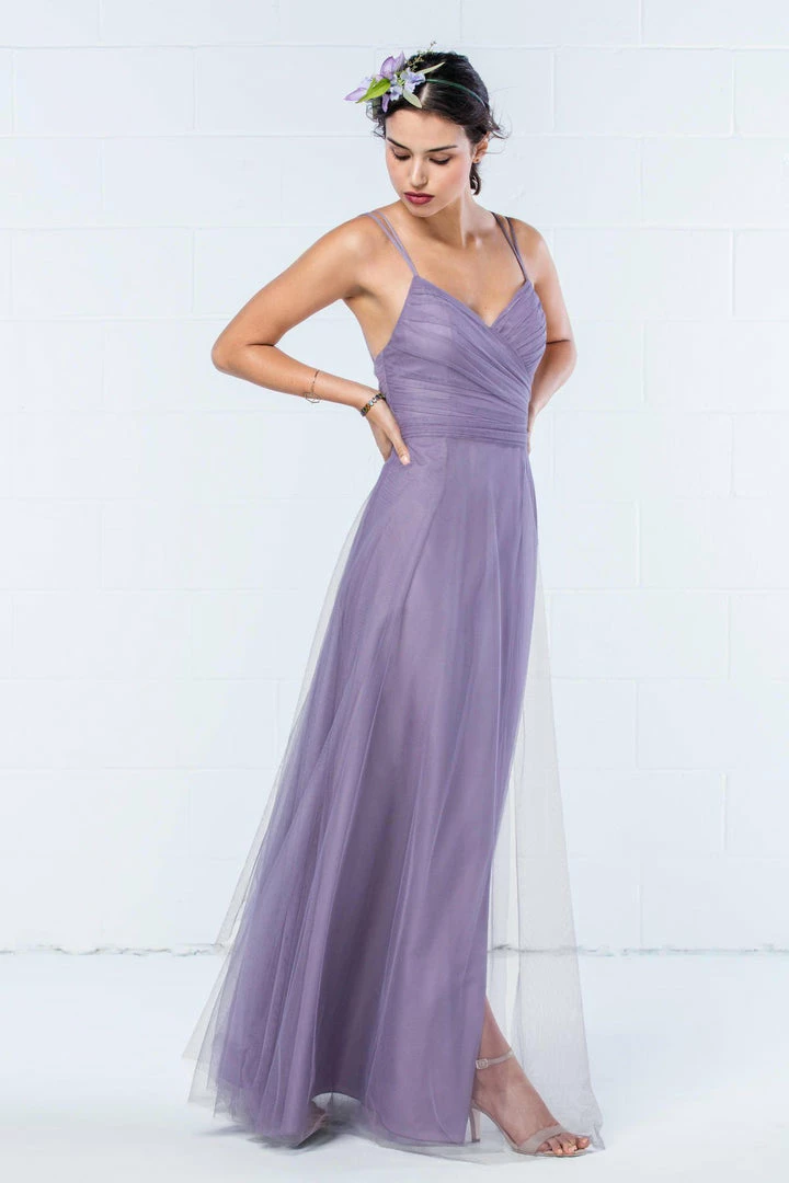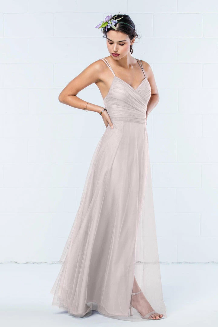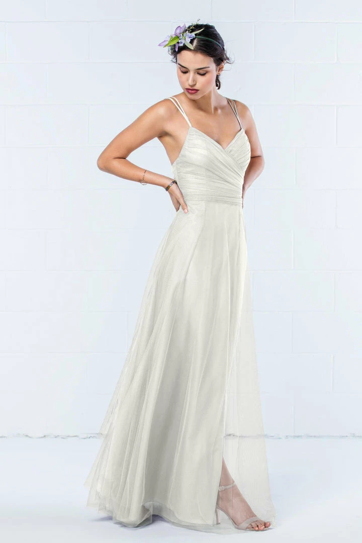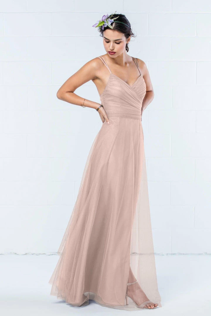 Modern and romantic all in one dress. This bobbinet style features a shirred crisscross bodice with double spaghetti straps that create a delicate v-back. A soft, skirt creates movement. Also available in knee length.